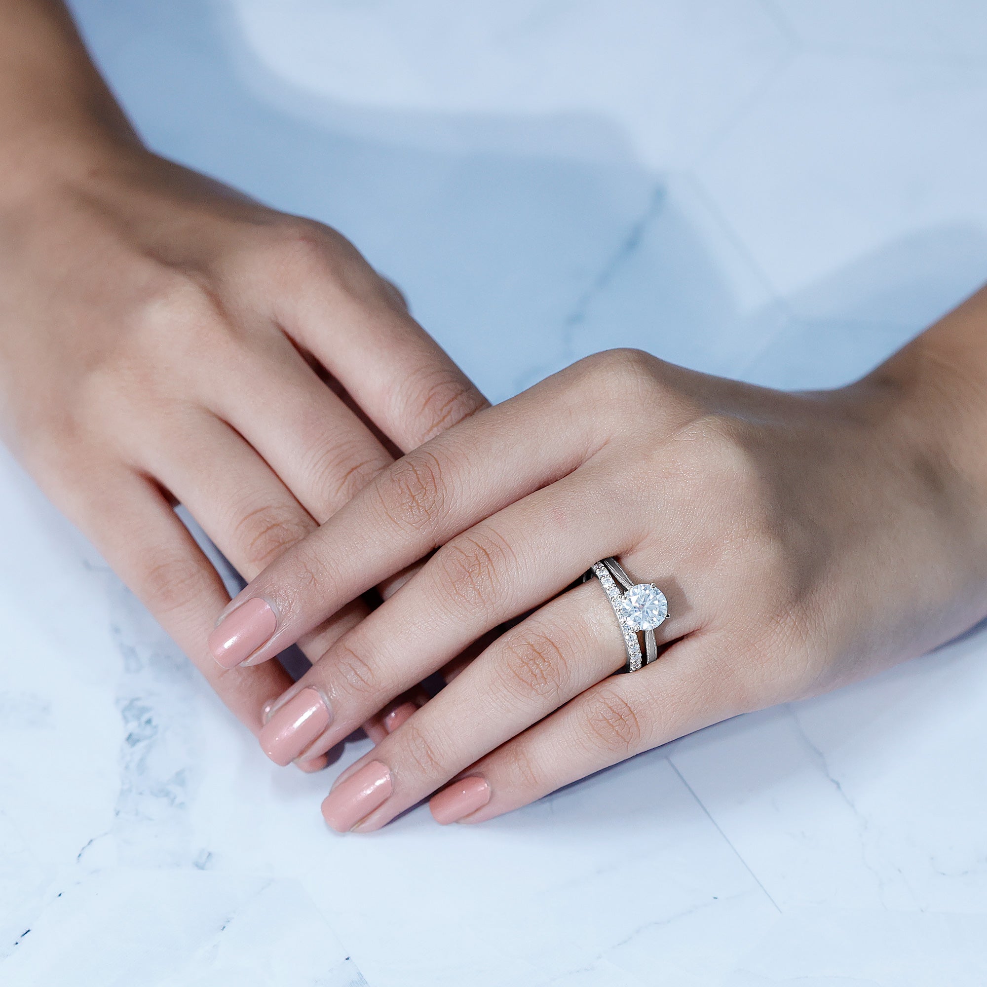 • Stone type: Lab grown diamonds offer a classic diamond look; moissanite delivers exceptional sparkle and value.