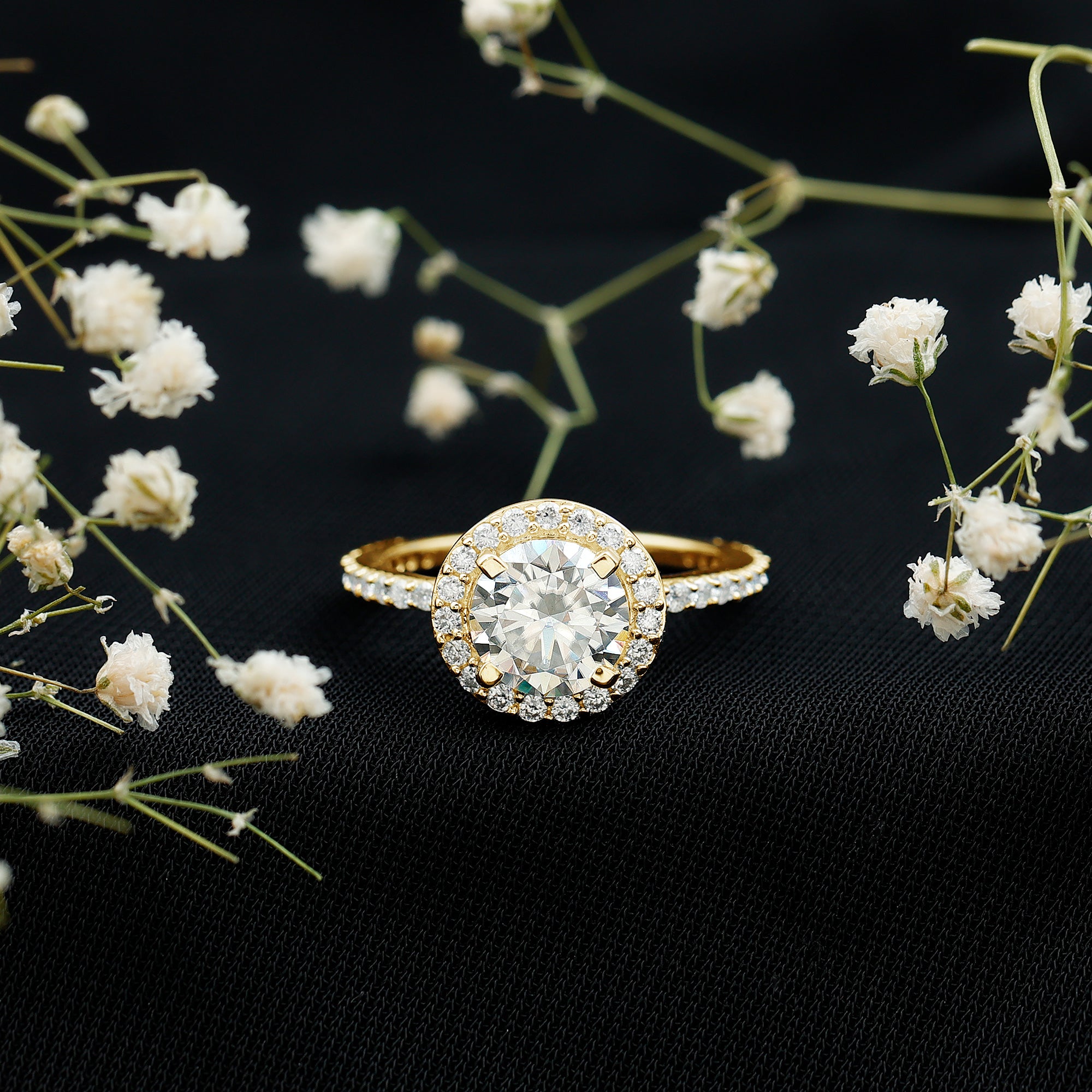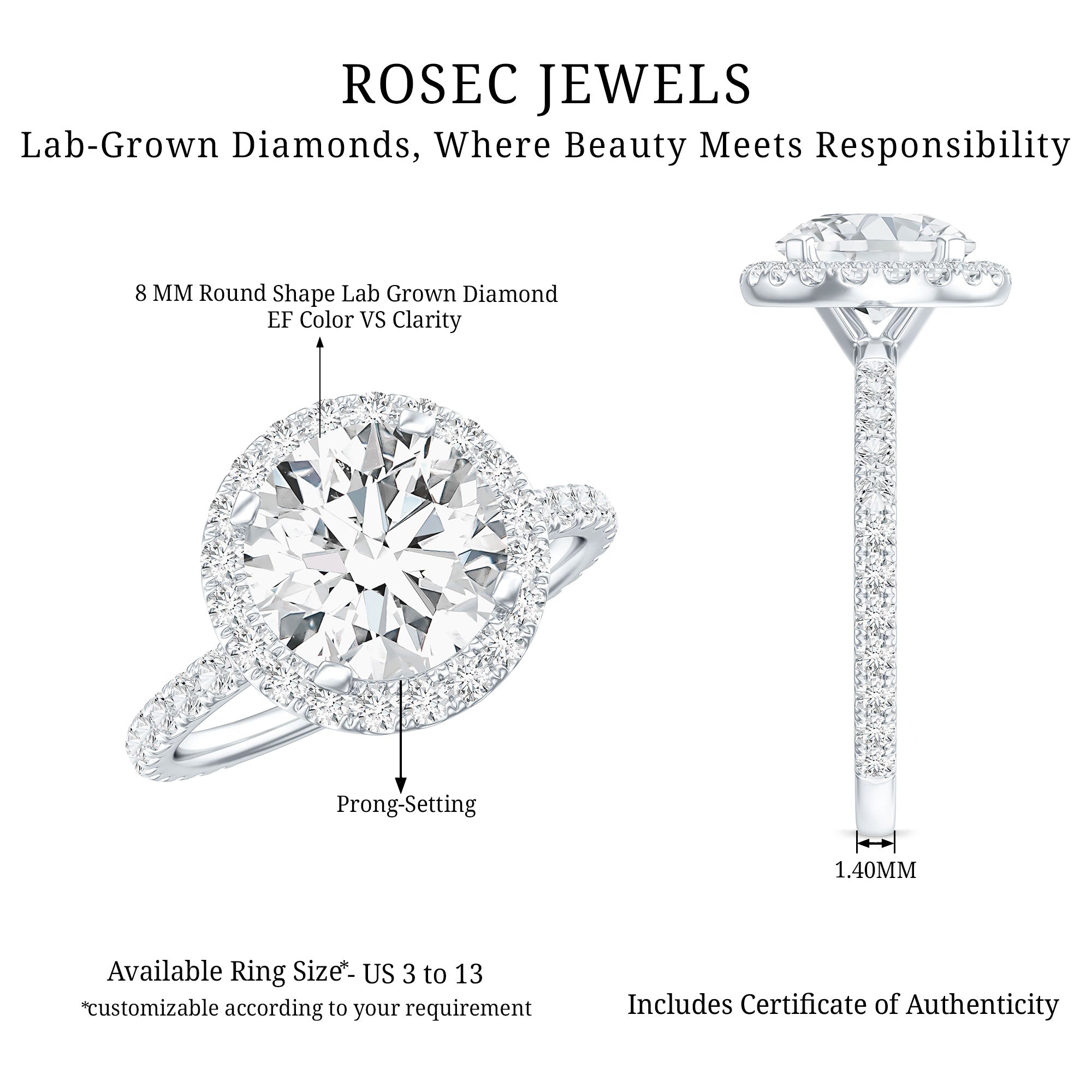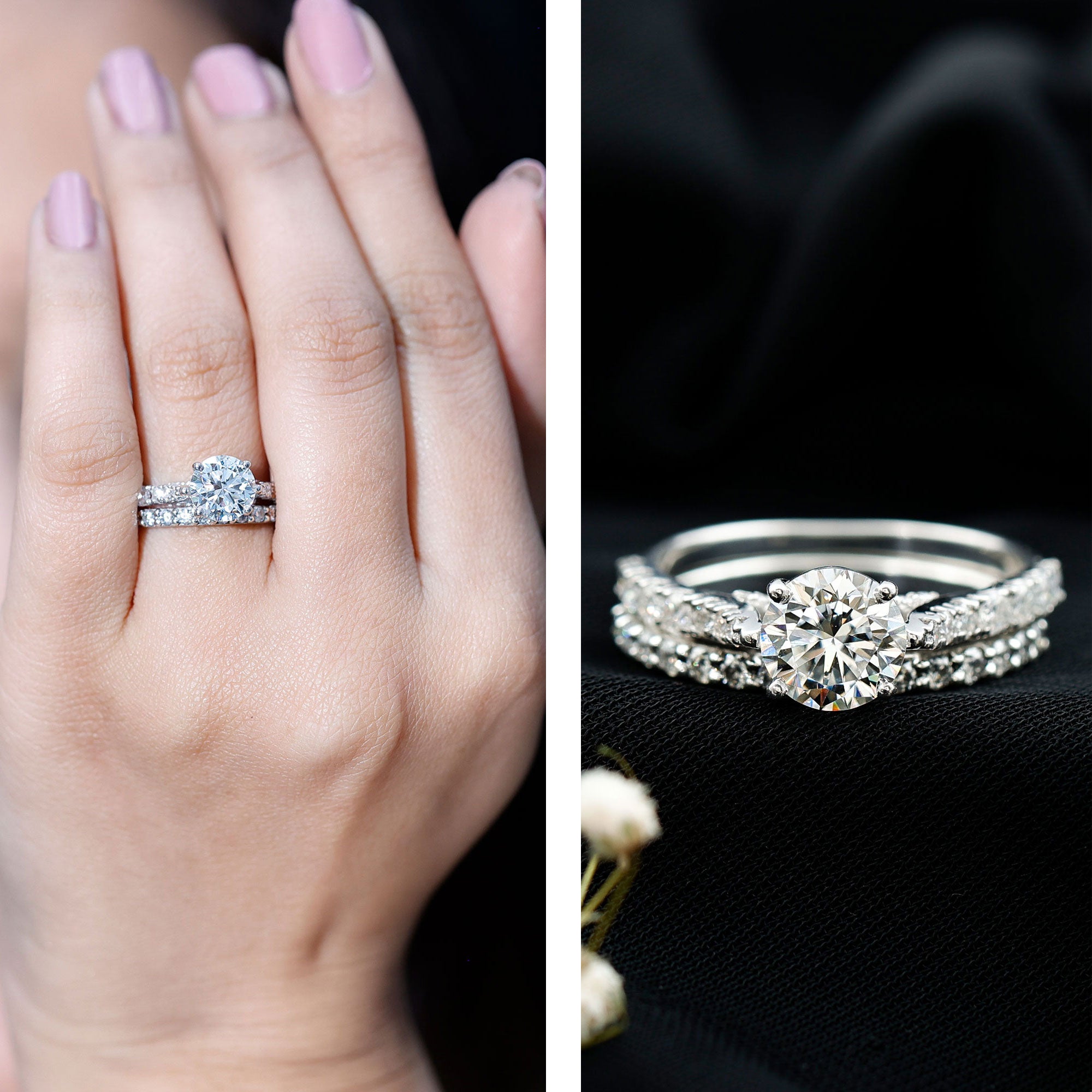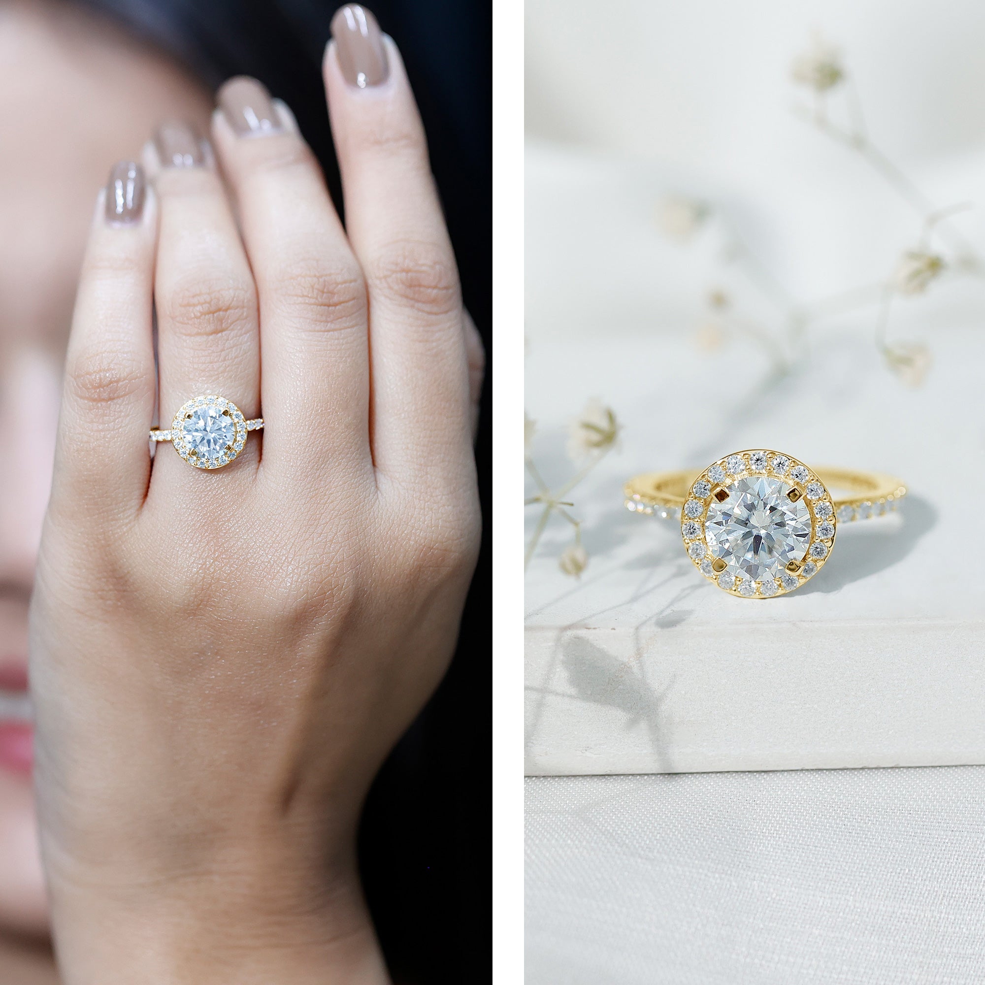 • Setting: Solitaire highlights the center stone, while halo adds visual size and brilliance.