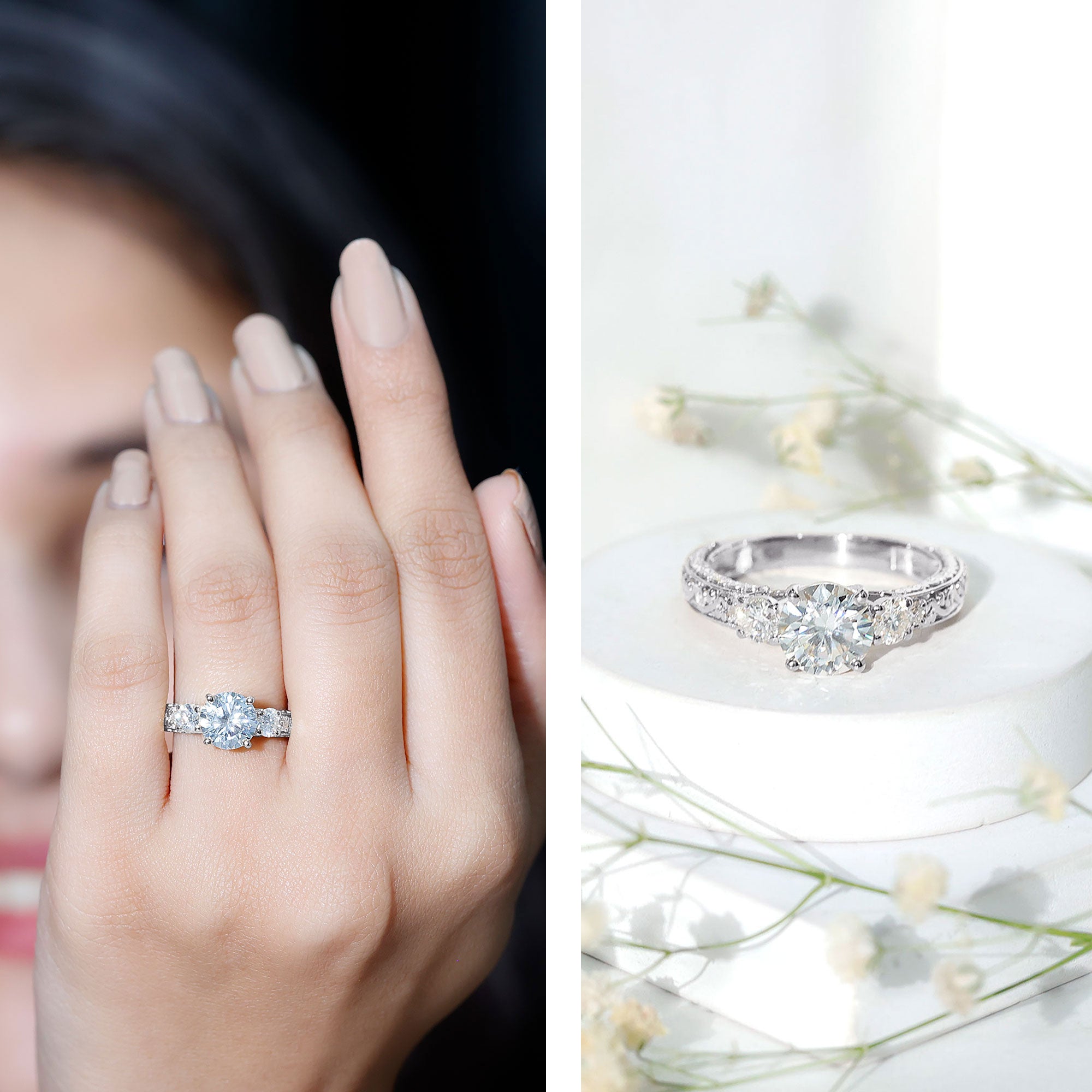 Explore our curated collection of engagement rings crafted with lab grown diamonds and moissanite—two brilliant, ethical alternatives to mined diamonds. Whether you prefer a timeless solitaire, a sparkling halo, or a vintage-inspired design, this page helps you compare styles, stones, and settings before you choose.