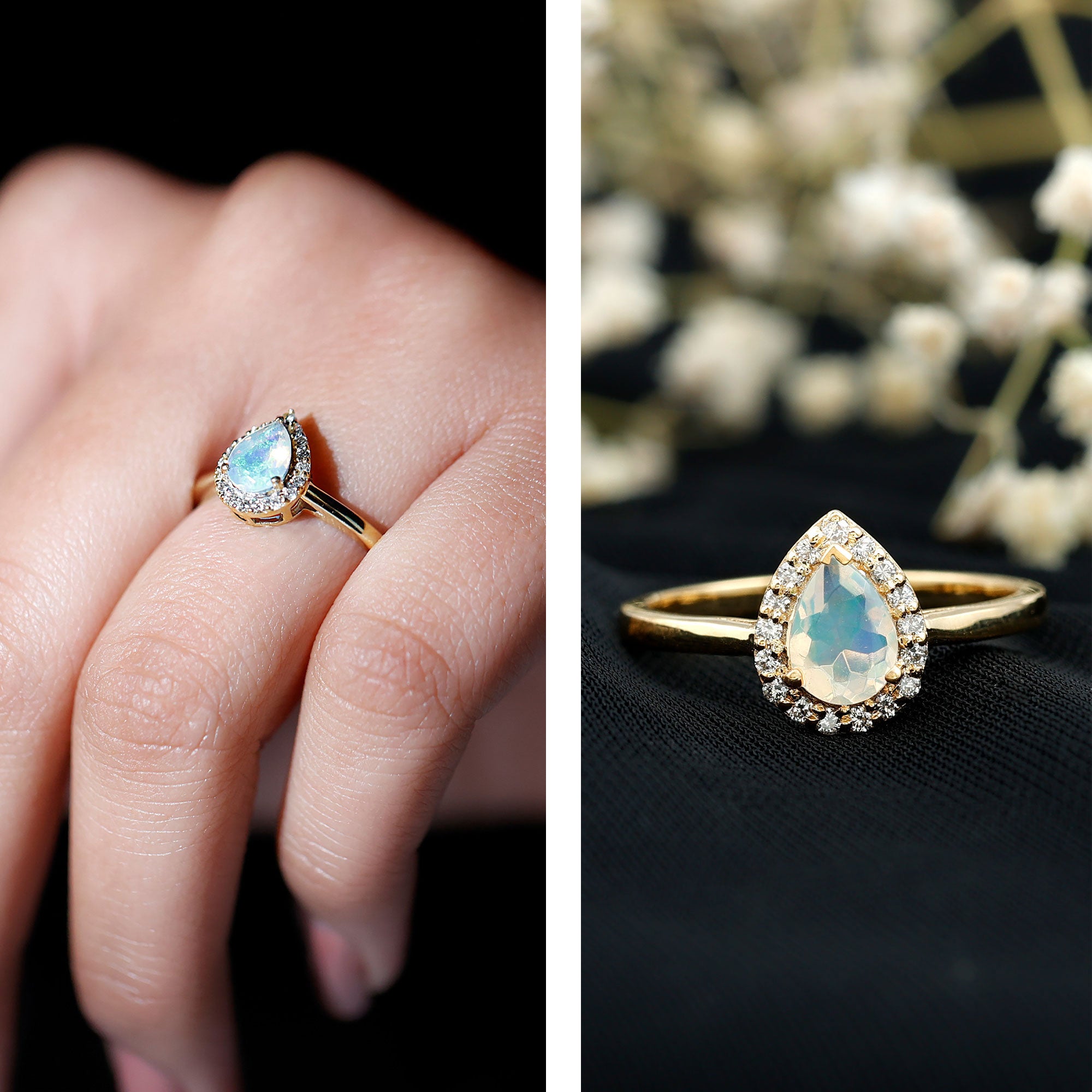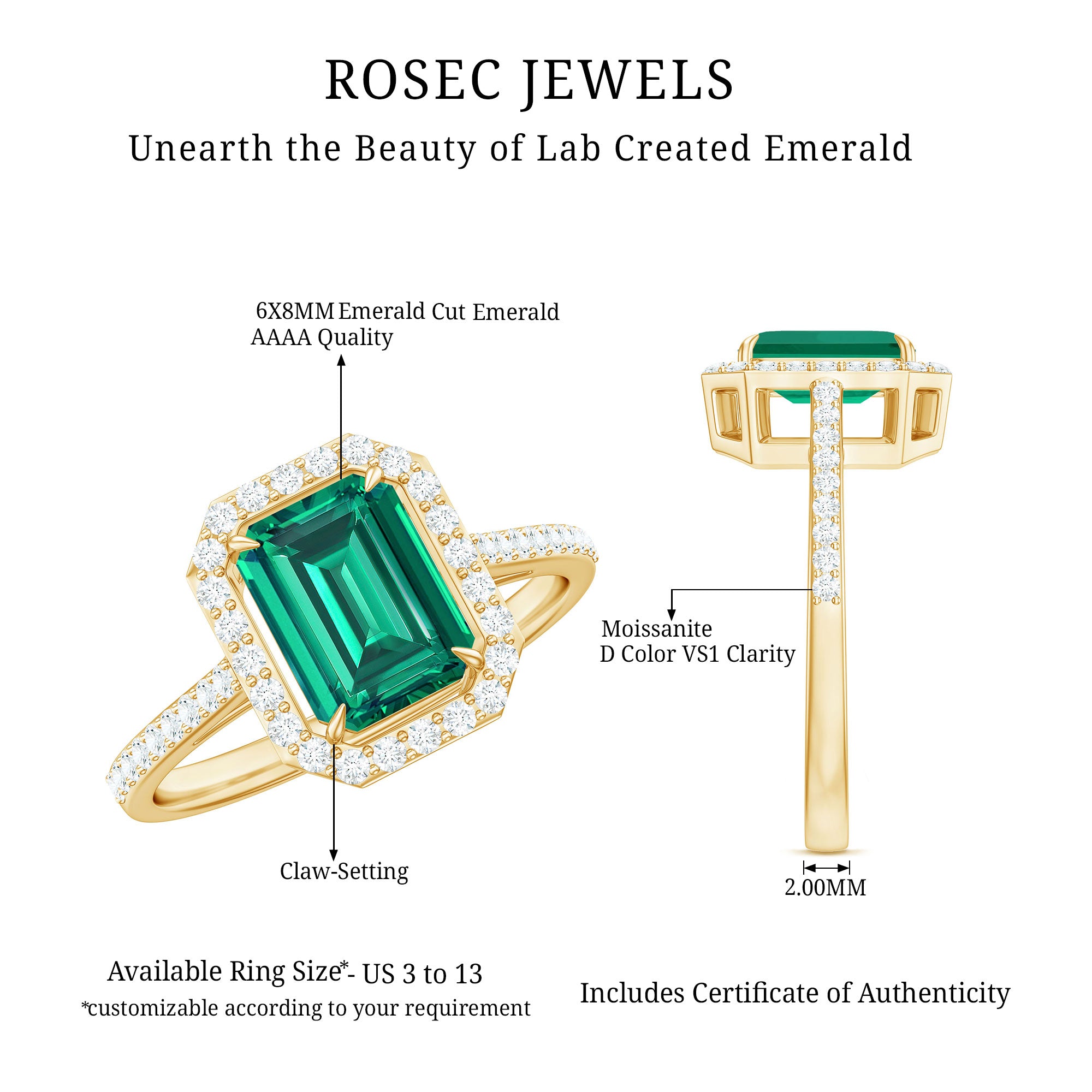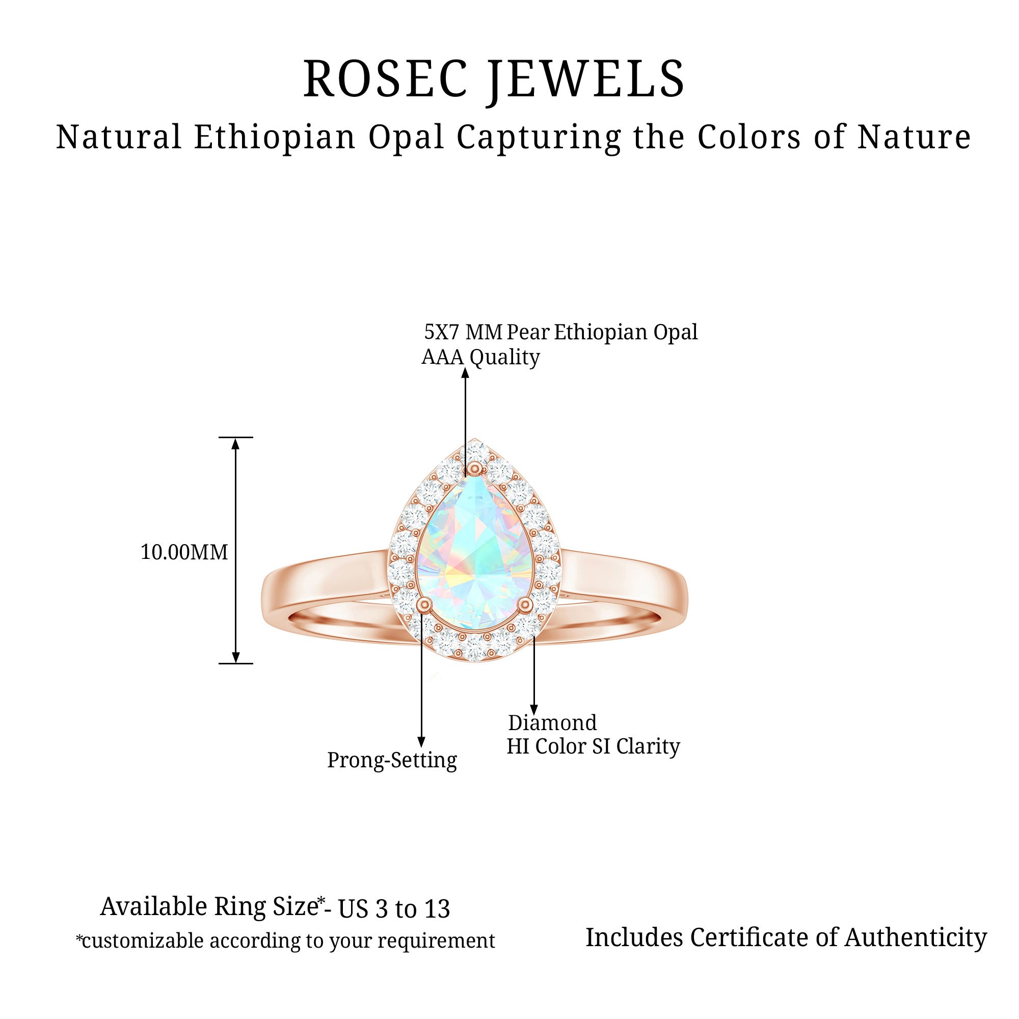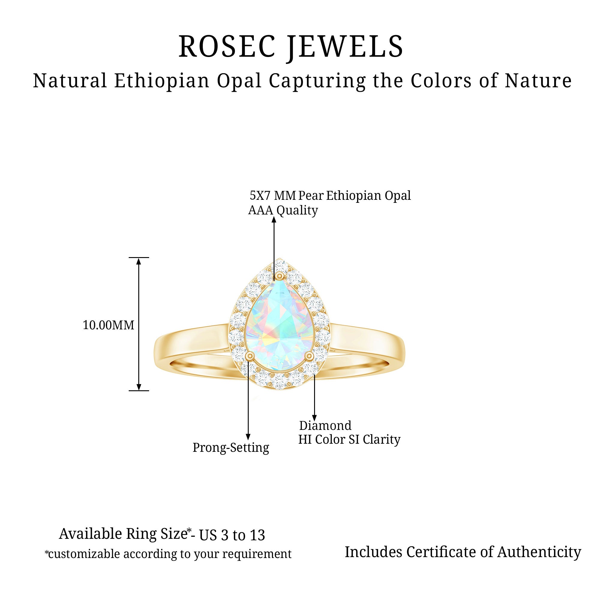 - Setting: Solitaire highlights the center stone, while halo adds visual size and brilliance.