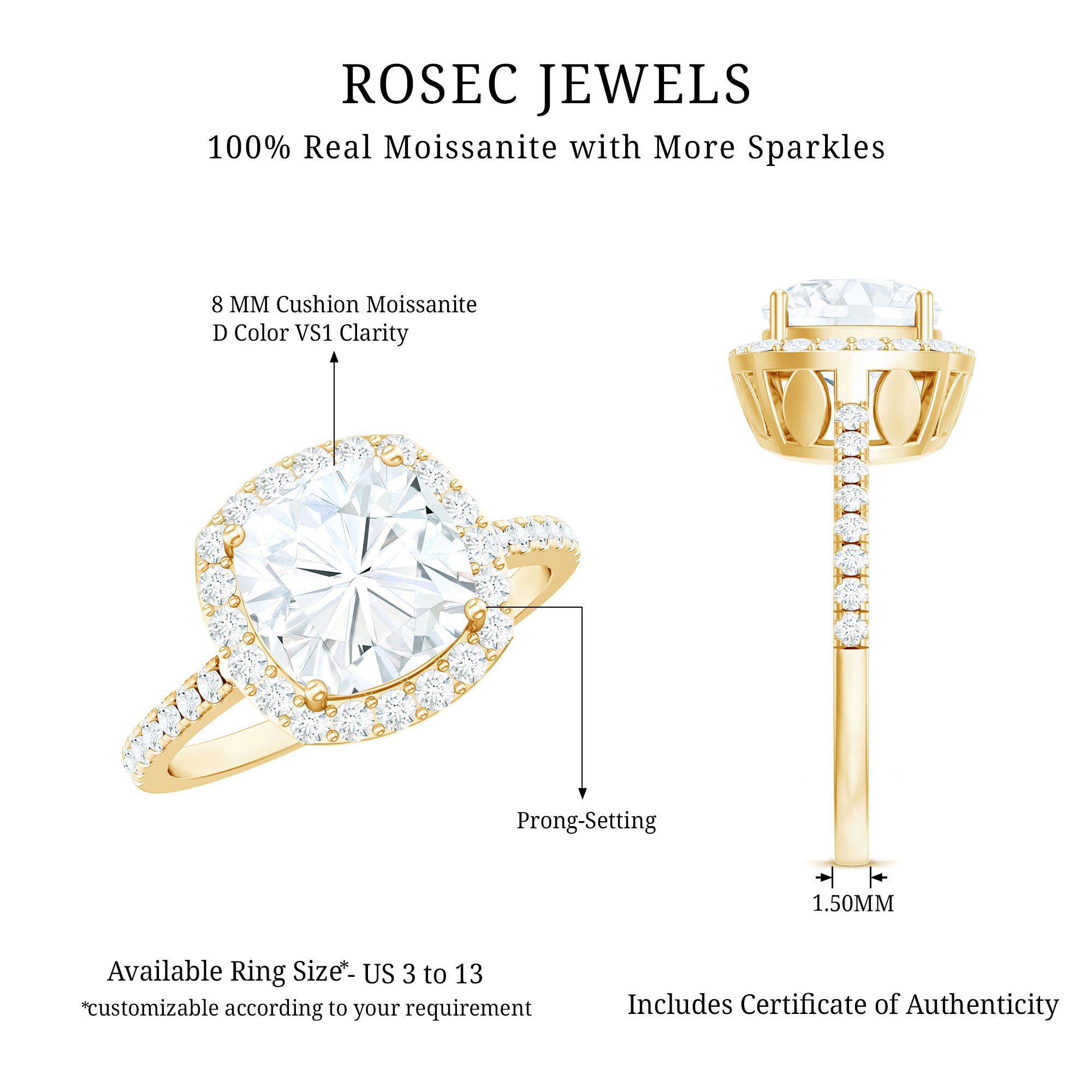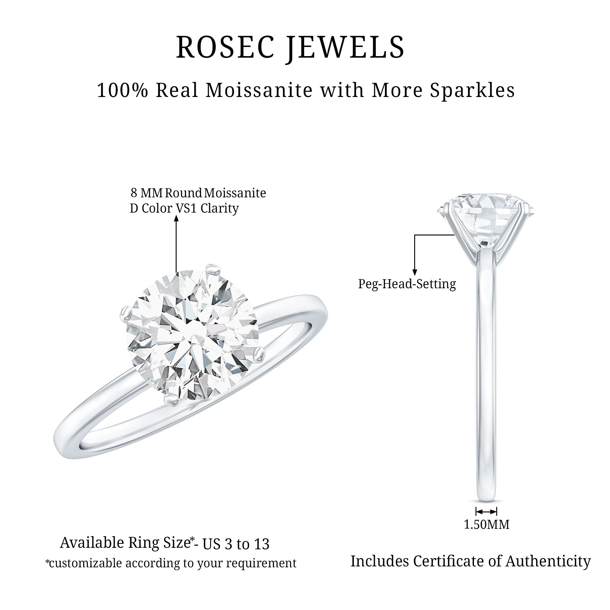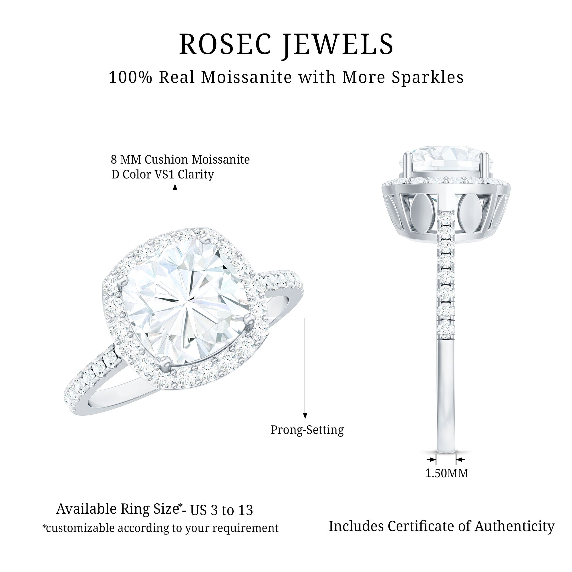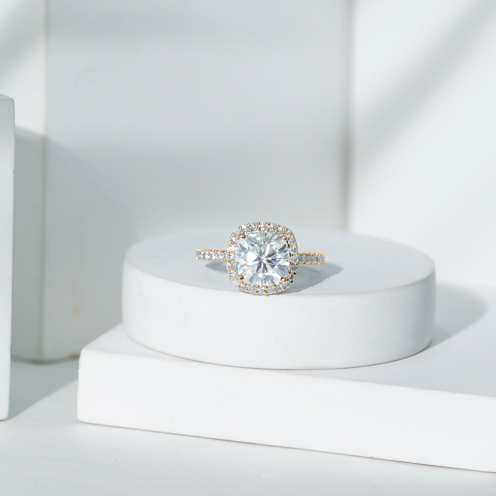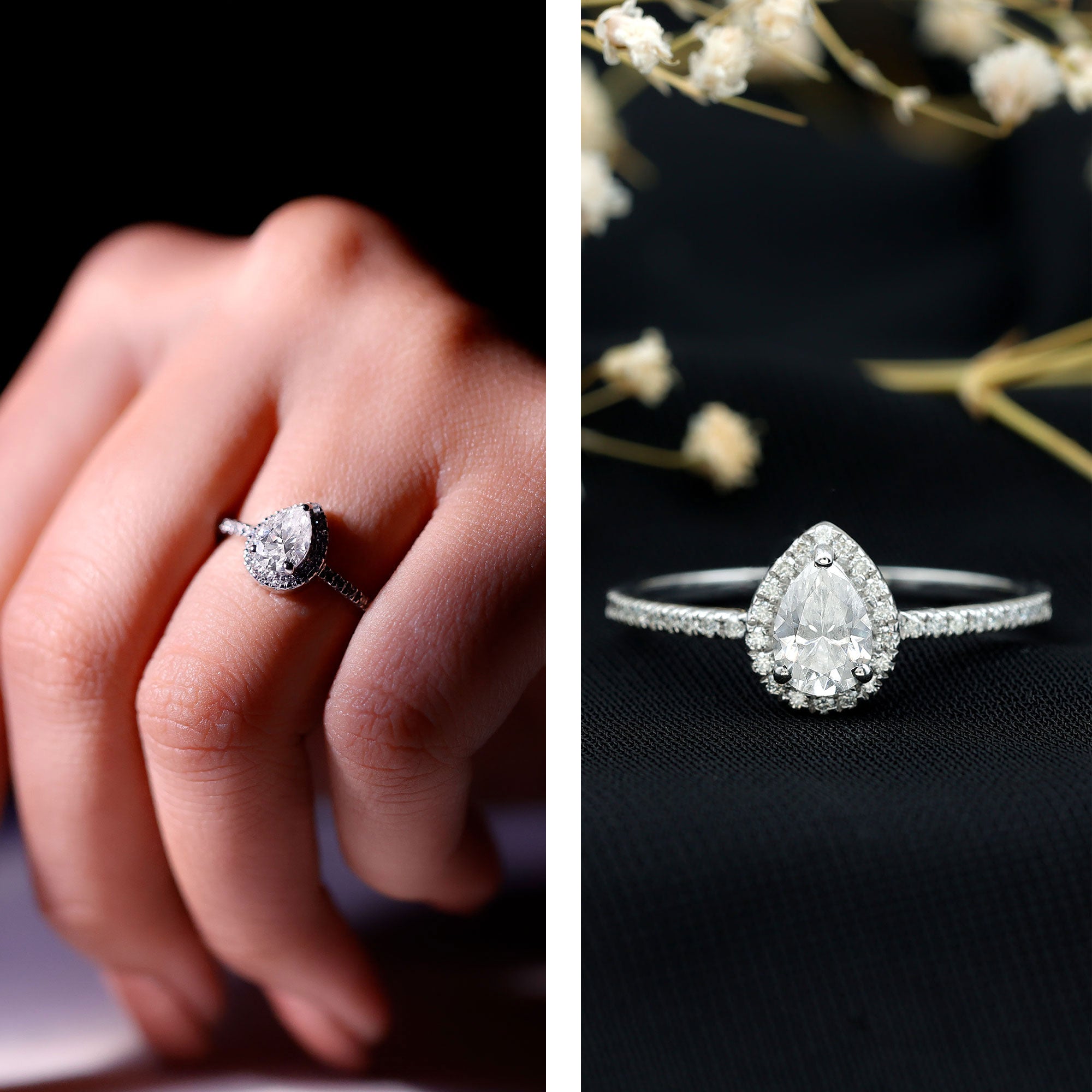 - Setting: Solitaire highlights the center stone, while halo adds visual size and brilliance.