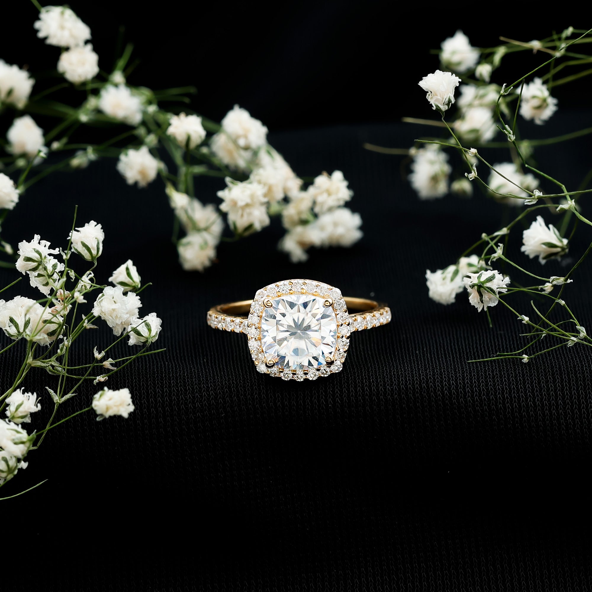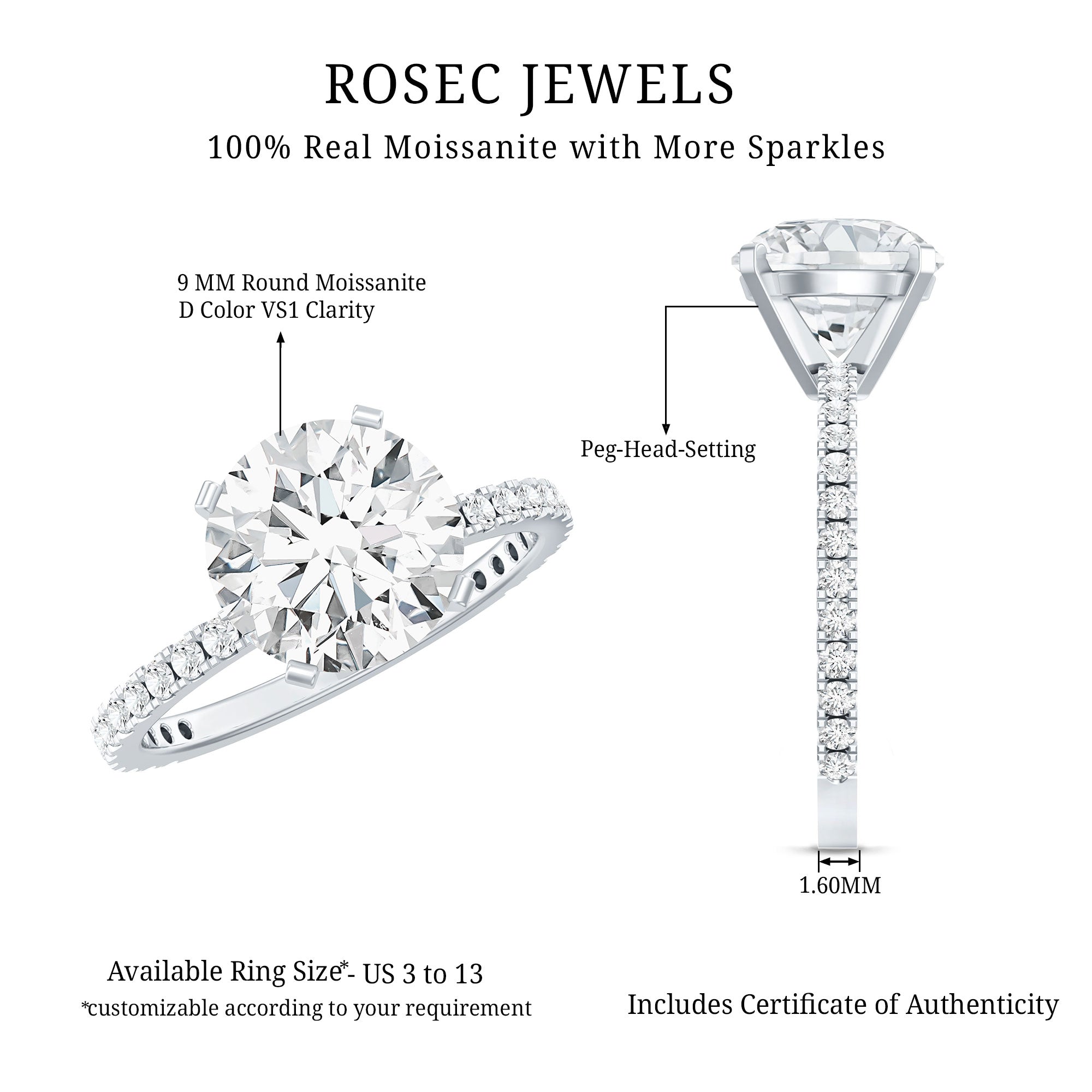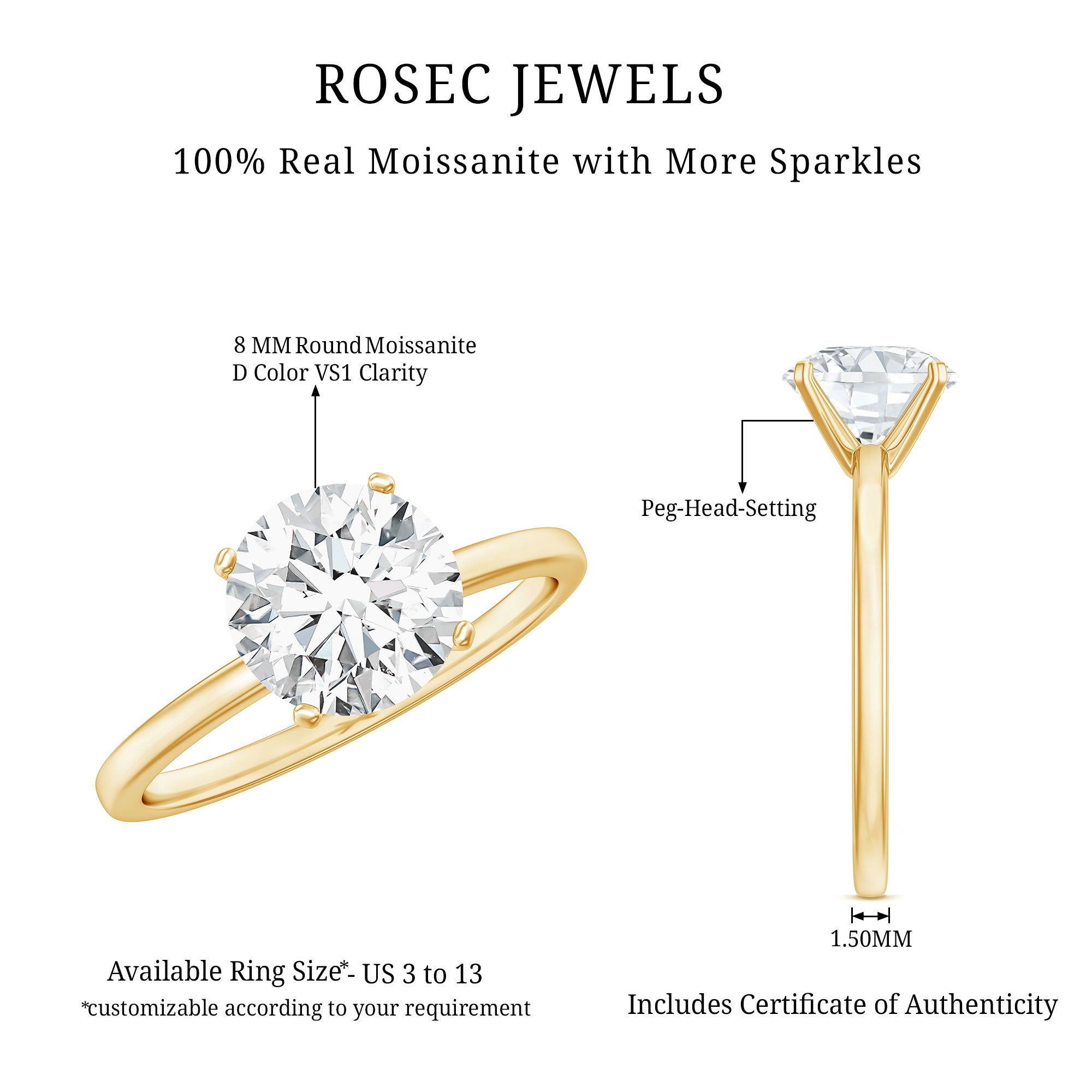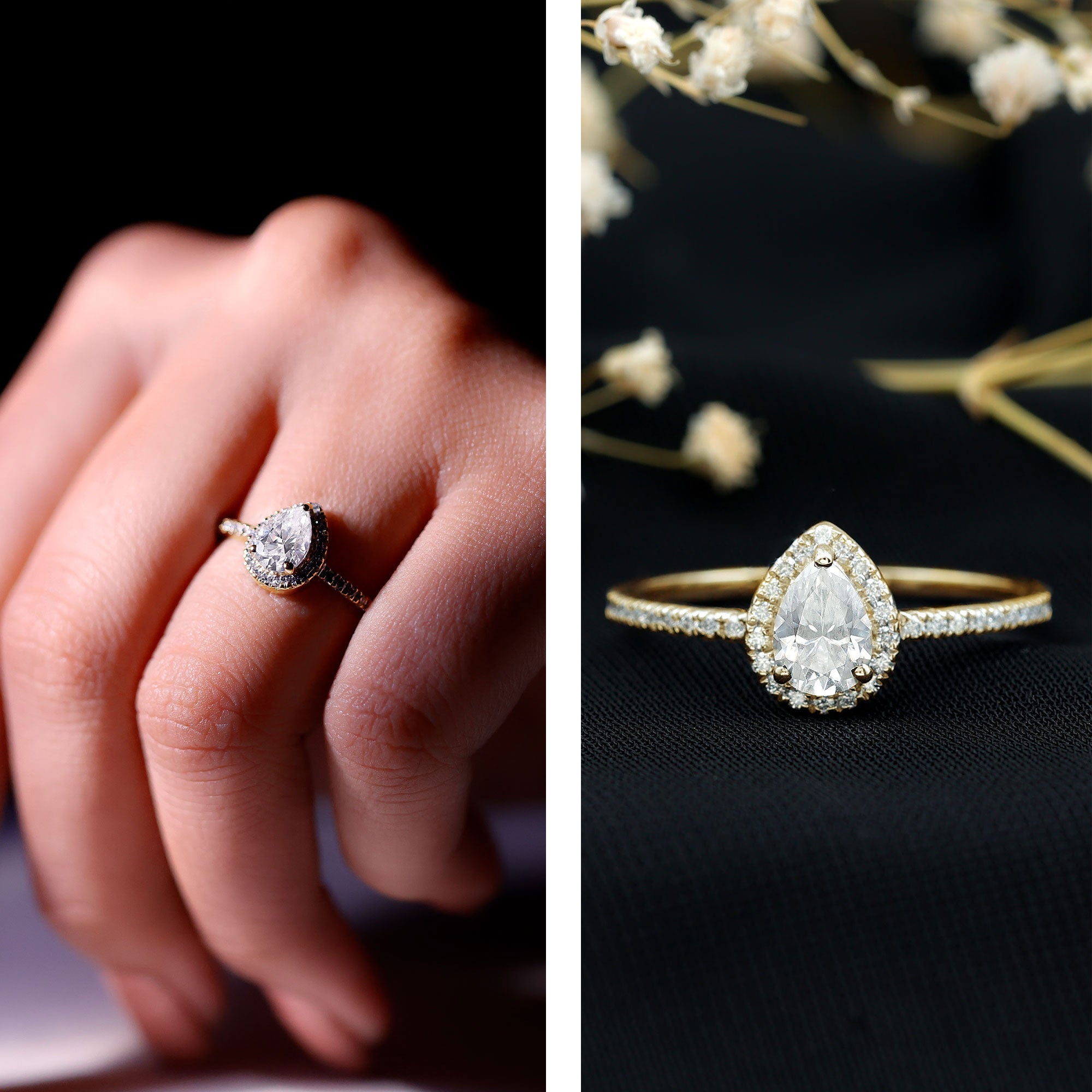 - Setting: Solitaire highlights the center stone, while halo adds visual size and brilliance.
