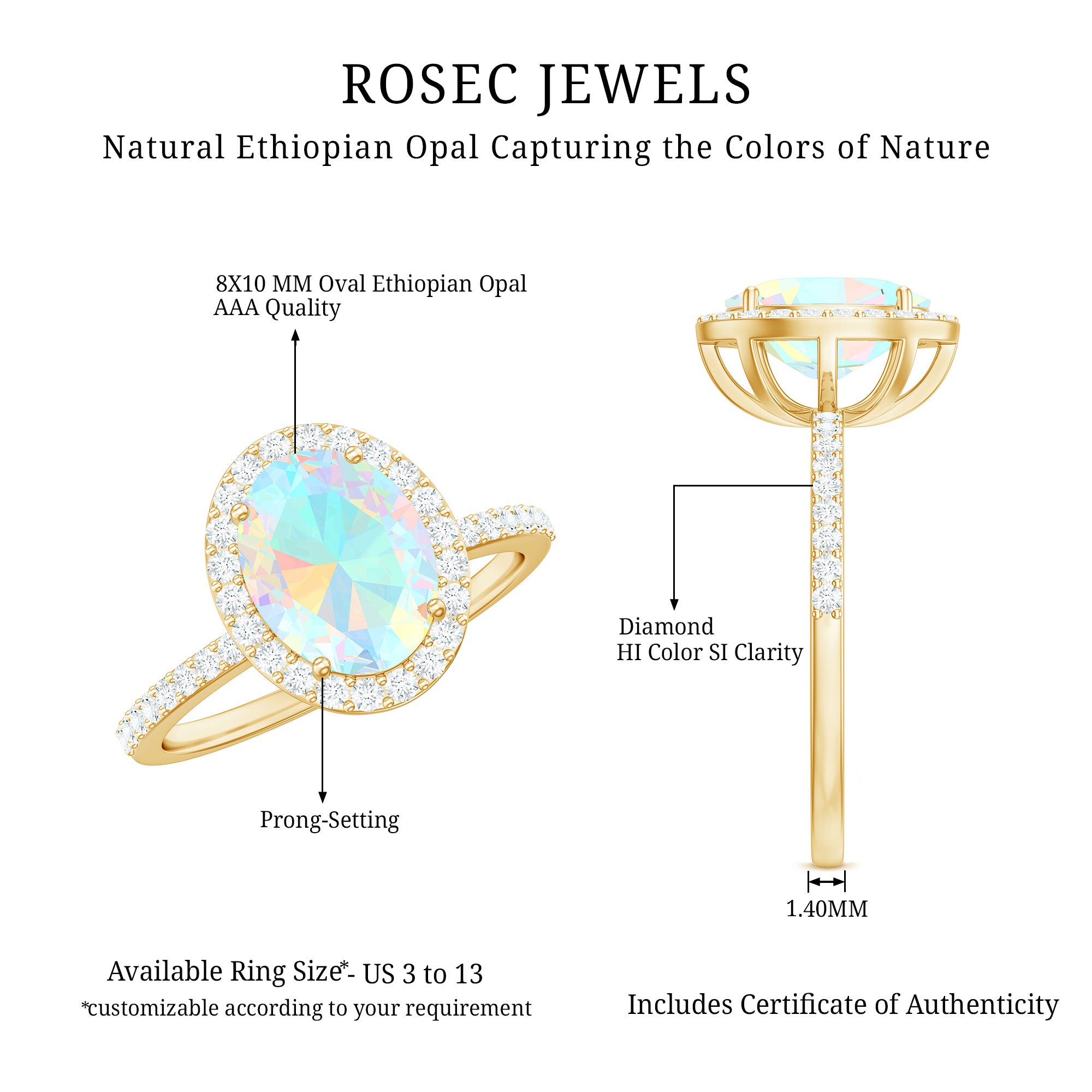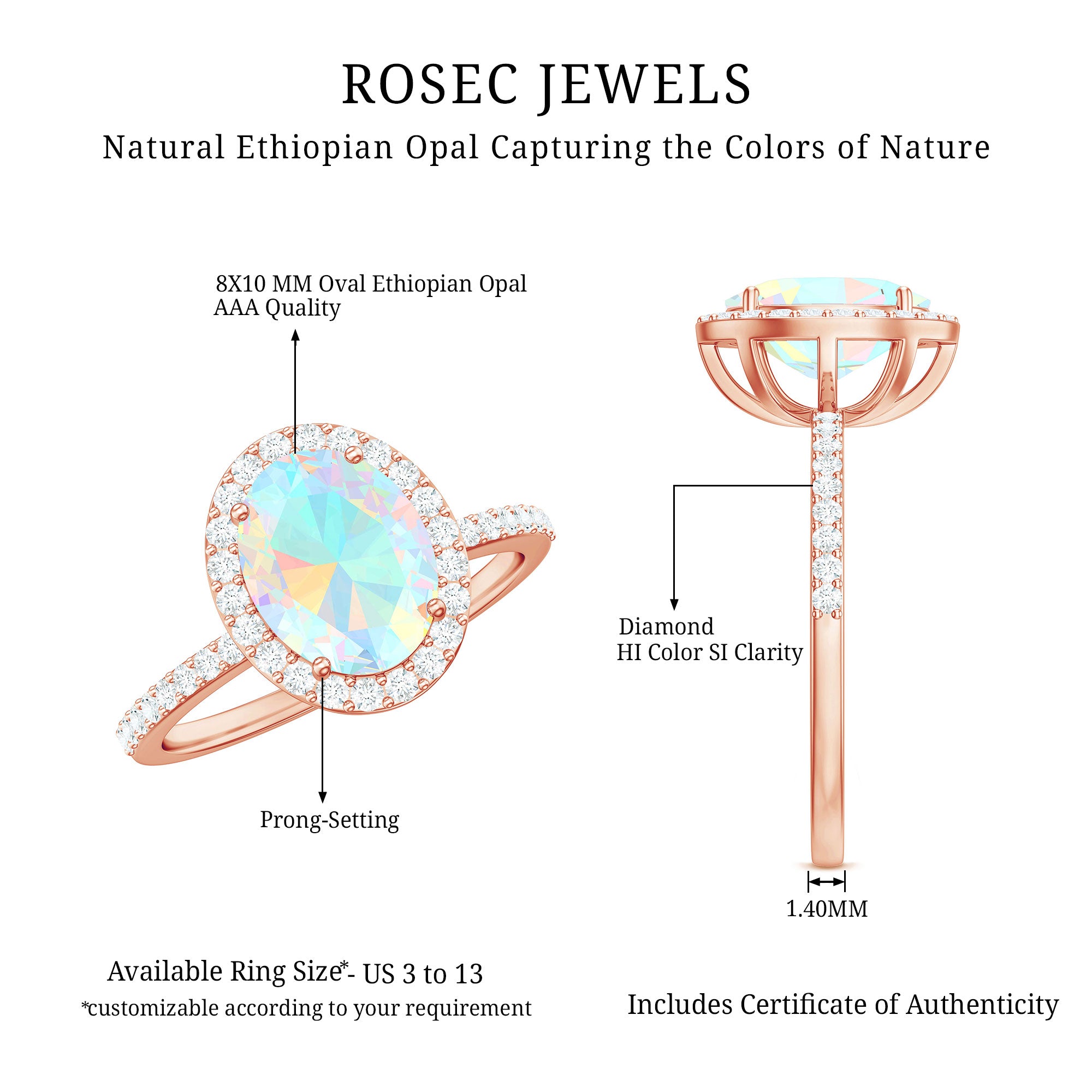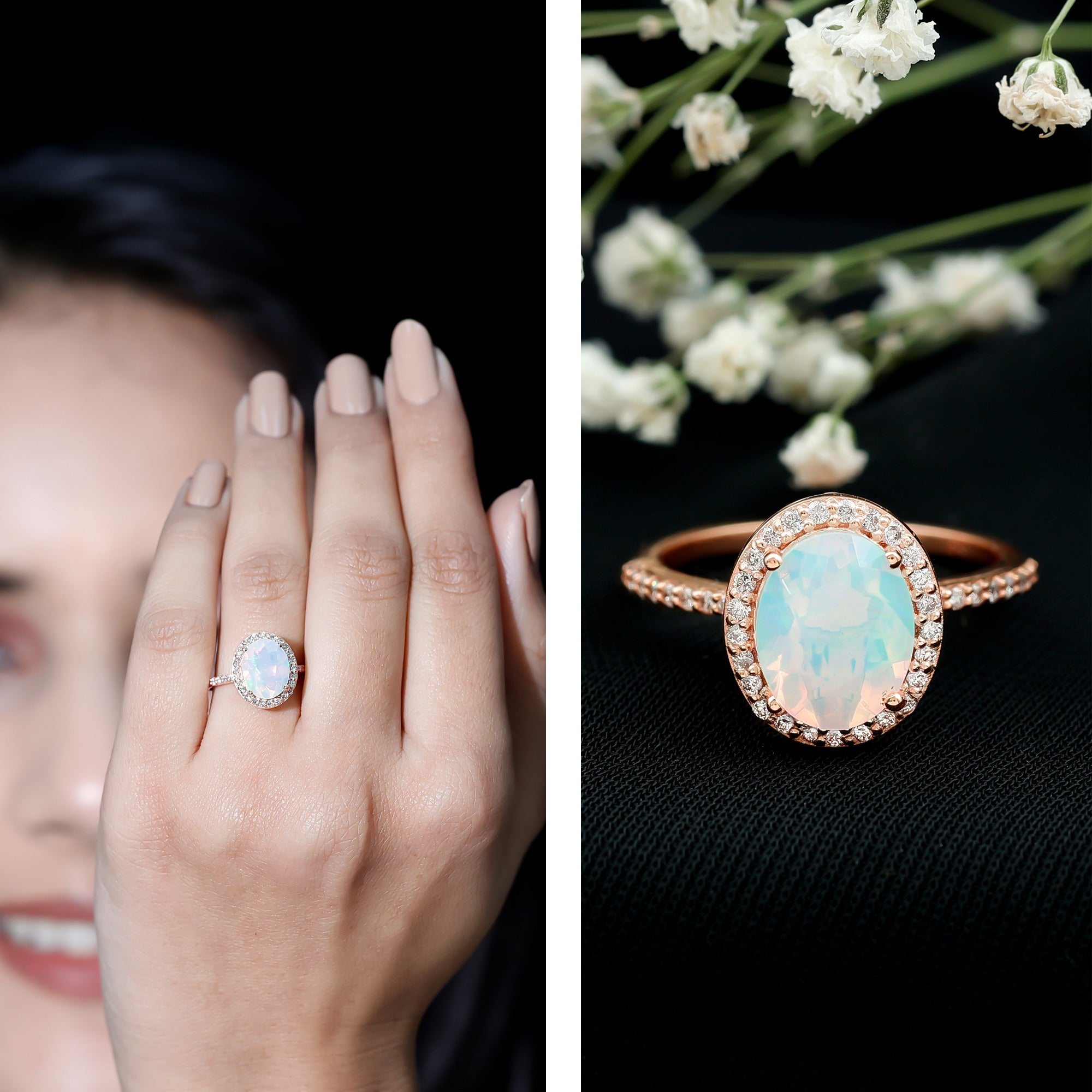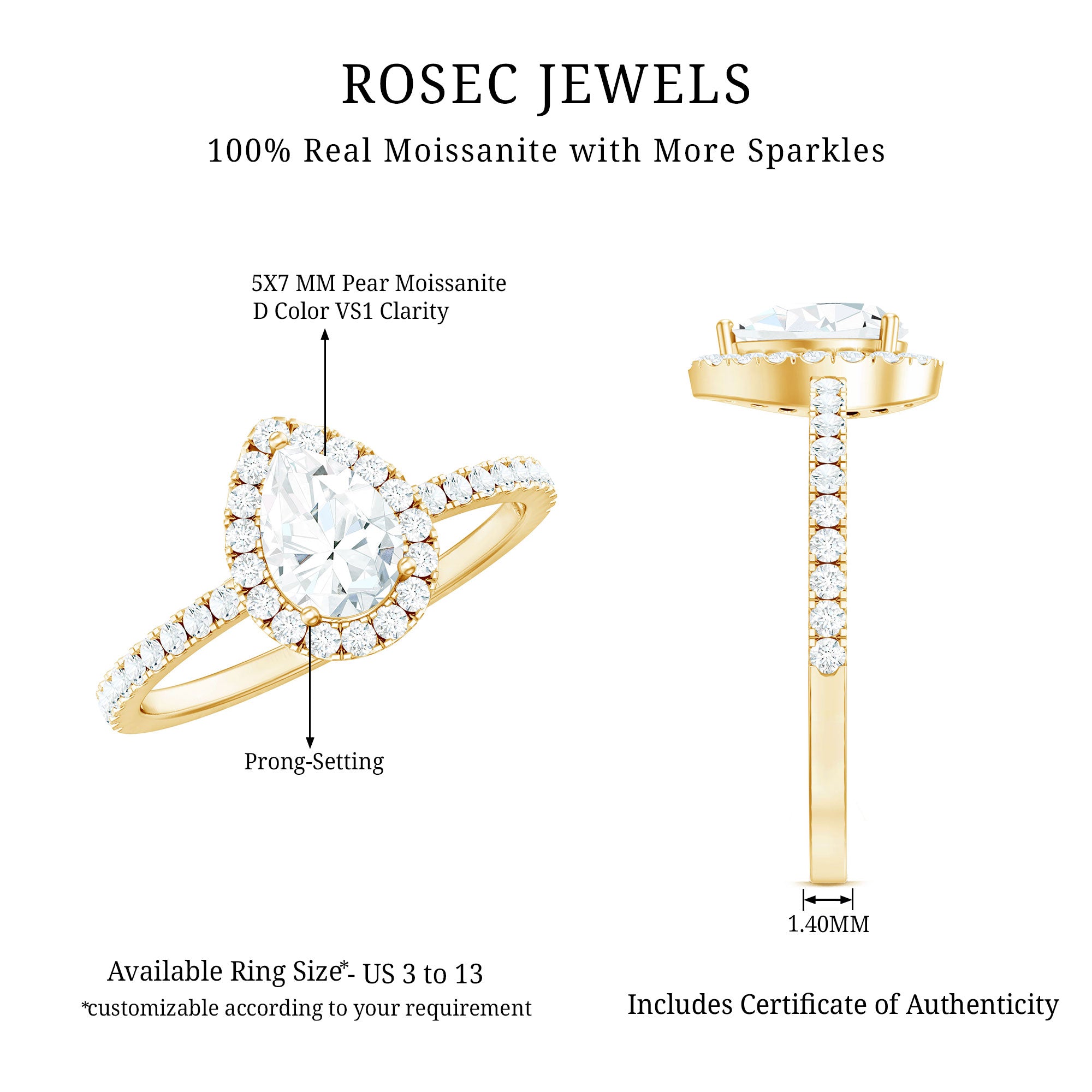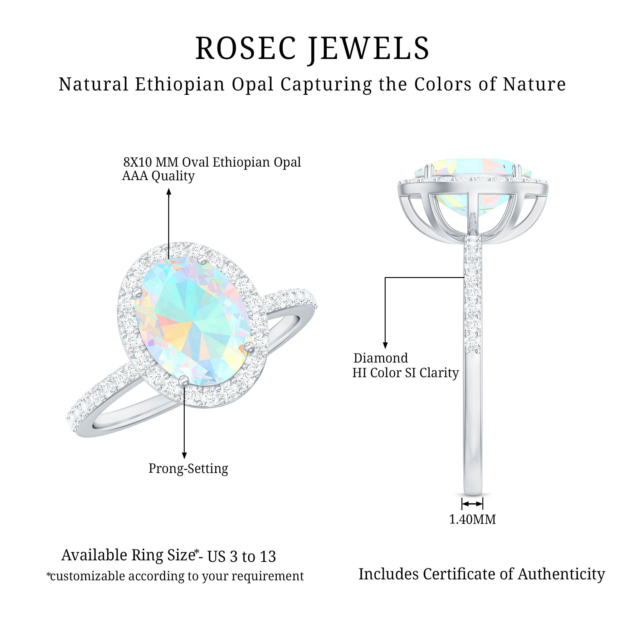 - Setting: Solitaire highlights the center stone, while halo adds visual size and brilliance.