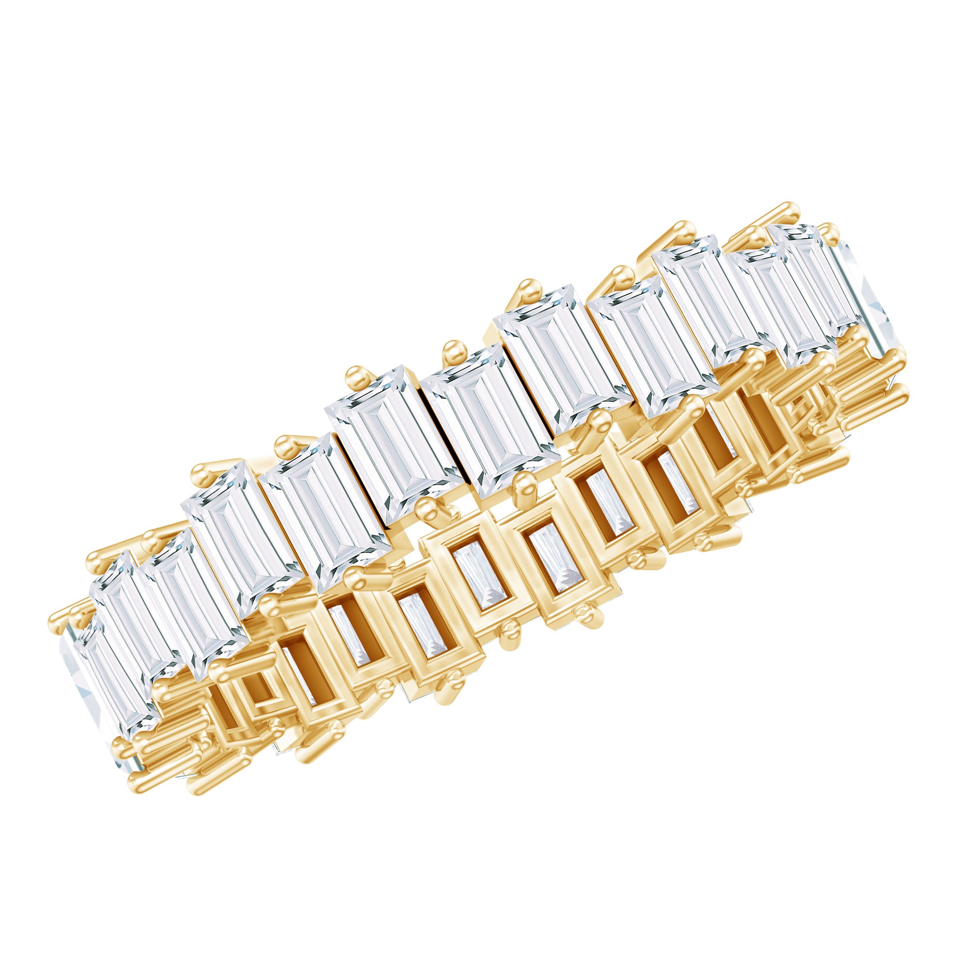 East to West eternity bands have stones arranged horizontally, often used for elongated shapes like emerald, radiant, or pear-cut stones.