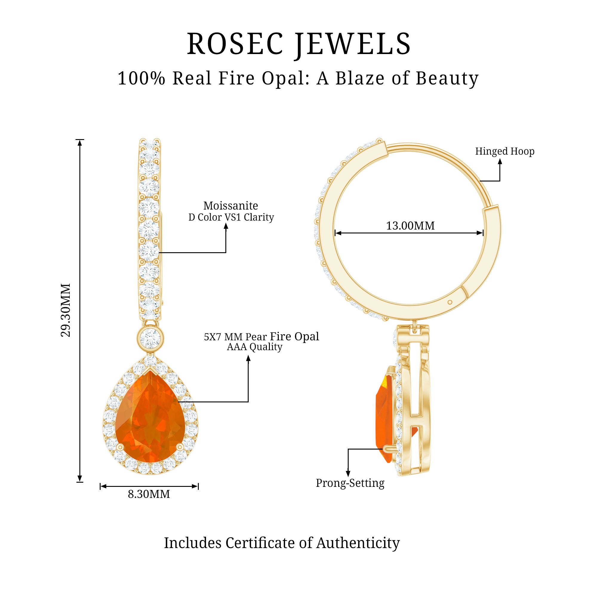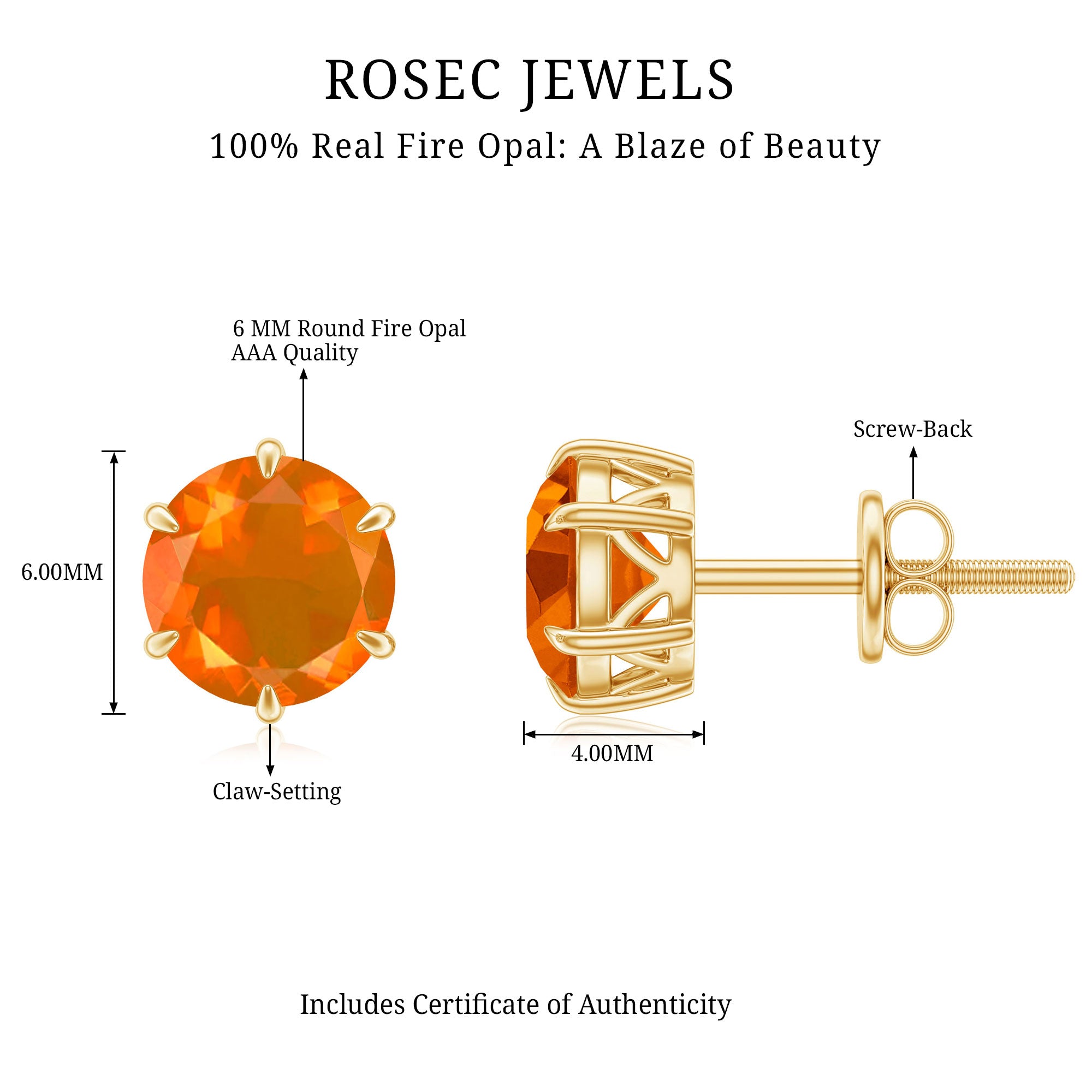 Precious Metals: Rosec Jewels provide genuine gold opal earrings with a hallmark on the metals. In gold, our red opal earrings for women come in all three colors of gold(Yellow, White, and Rose). we are also providing the fire opal earrings in sterling silver with the stamp of purity.