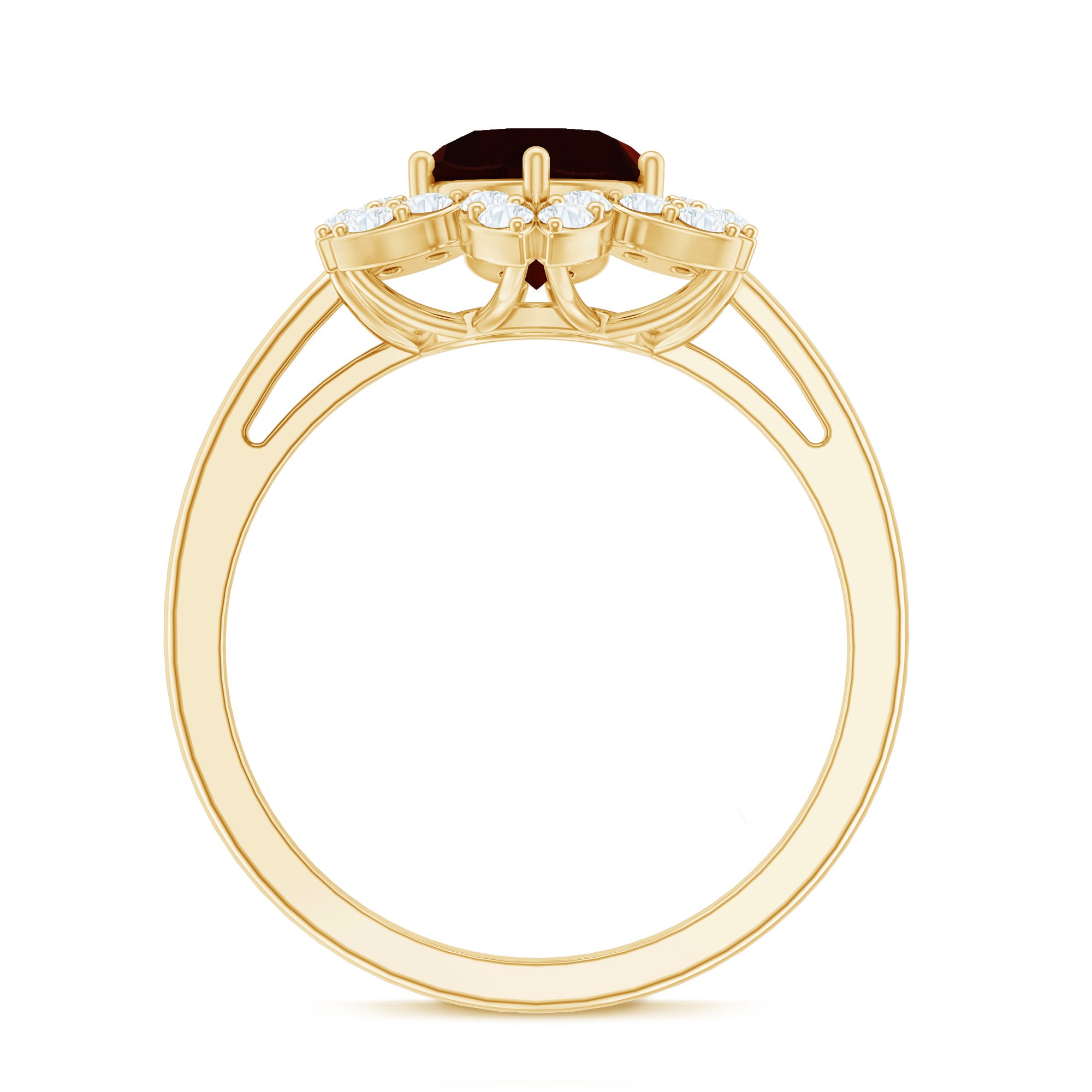 Halo Rings: - Showcases the beauty of garnet stone with a halo motif, these rings accentuate the brilliance of the center stone elegantly. Due to the diamond accents, the size of the garnet looks a bit large. The vibrant hues of red stone represent love and passion which makes them perfect for engagement rings. The halo style adds an extra layer of shine and elegance to the ring, enhancing the beauty of the ring. The Halo collection is perfect for those who always appreciate something unique and classy.