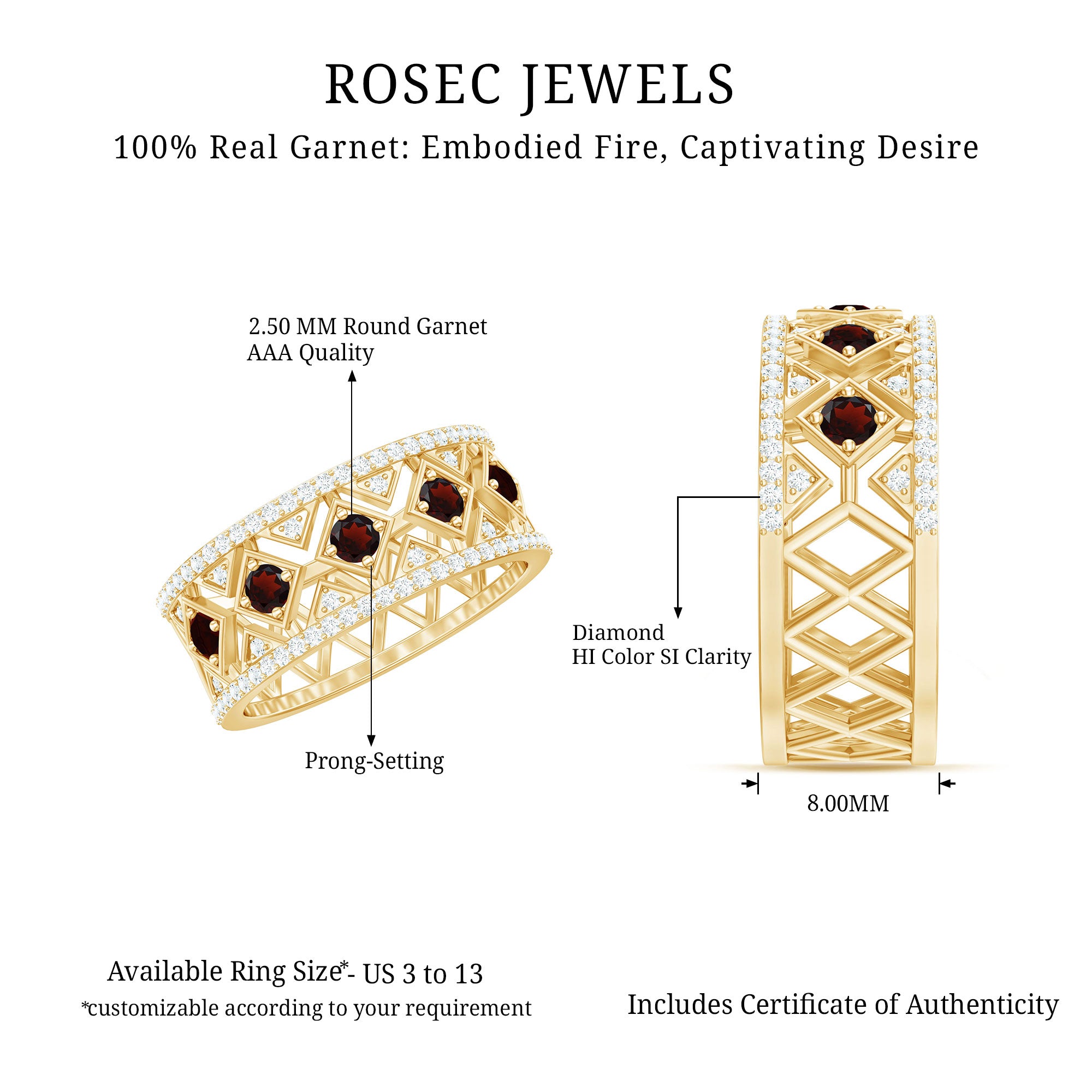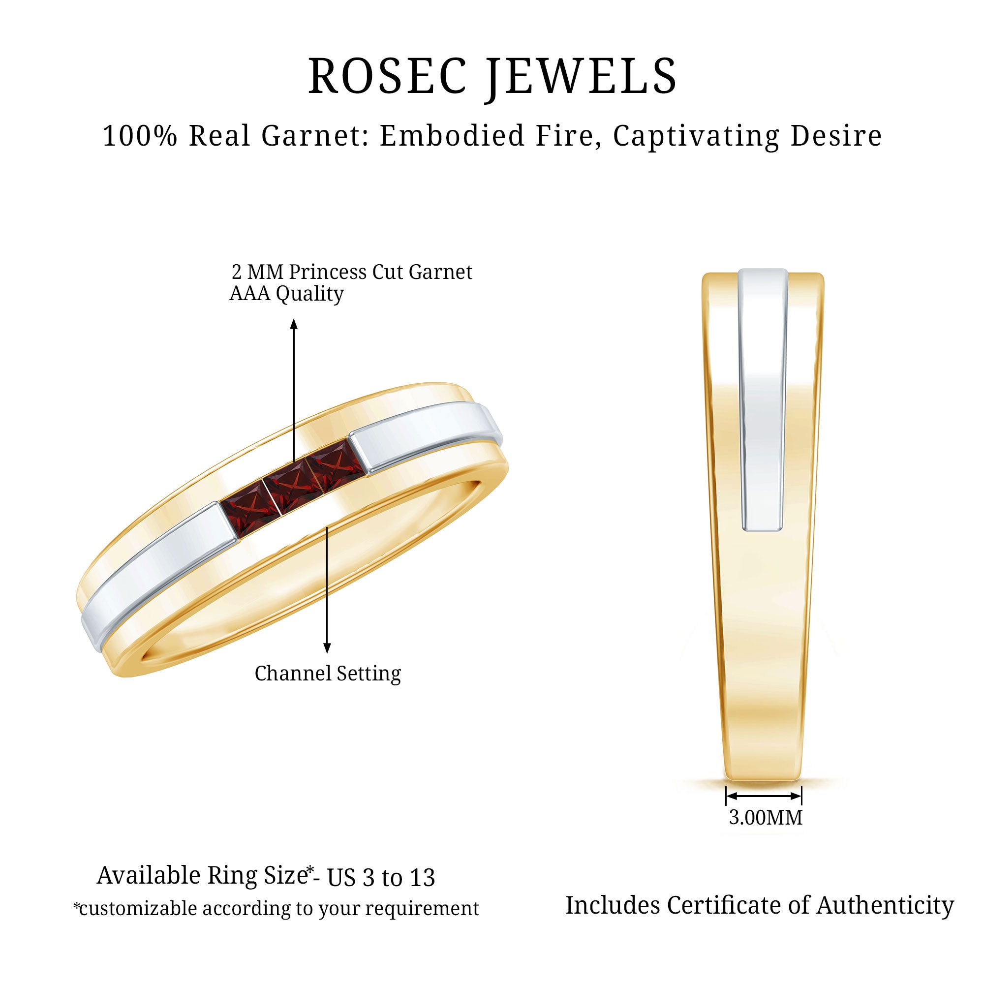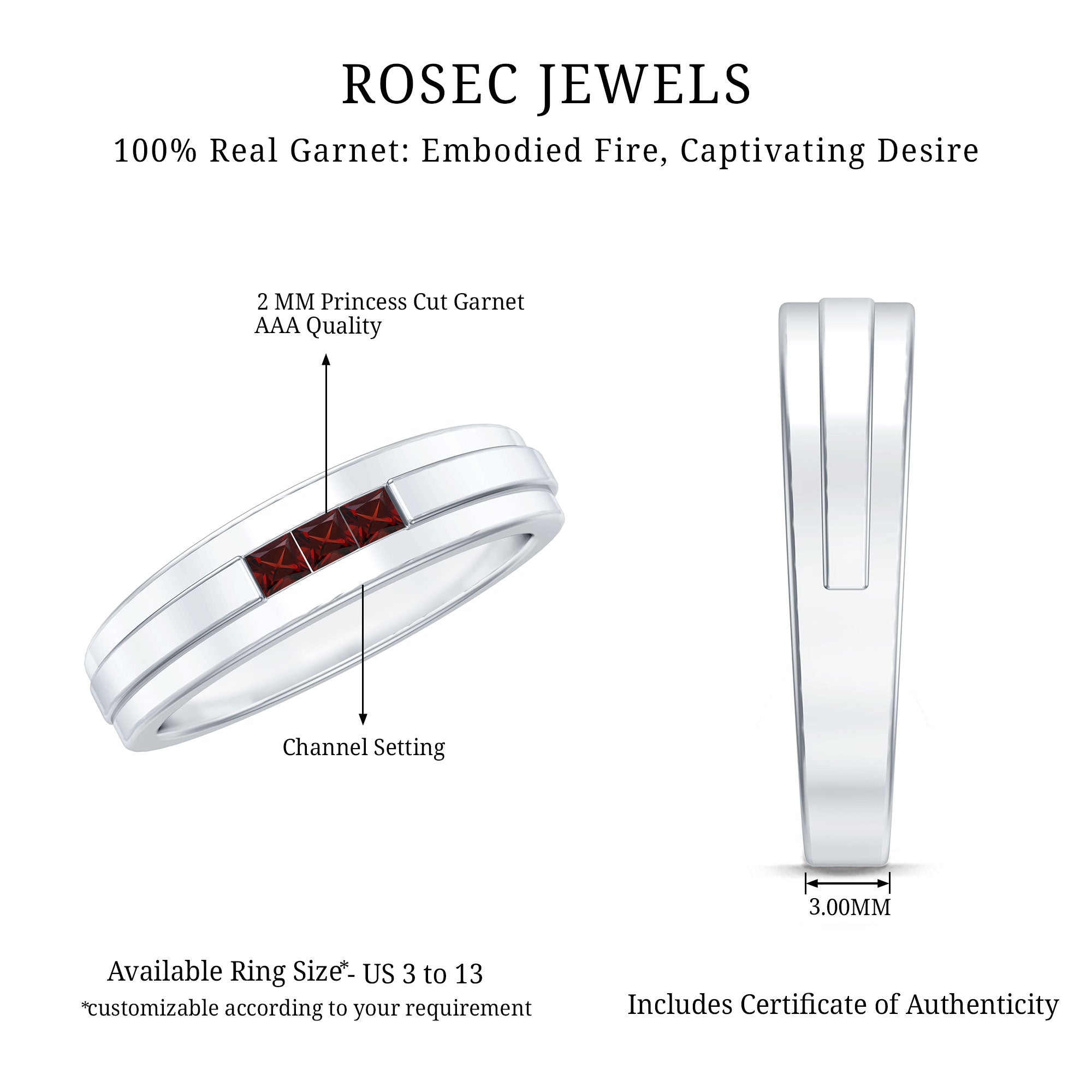 Rosec Jewels’ Garnet wedding rings featuring natural garnets, the member of silicate family of minerals and are widely cherished for their wide spectrum of colors of almost all the shades. This fantastic diversity in color helps jewelers to favor garnets while handcrafting garnet bands for men. Our artisans are also after curating January birthstone rings for wedding that are an enchanting beauty.