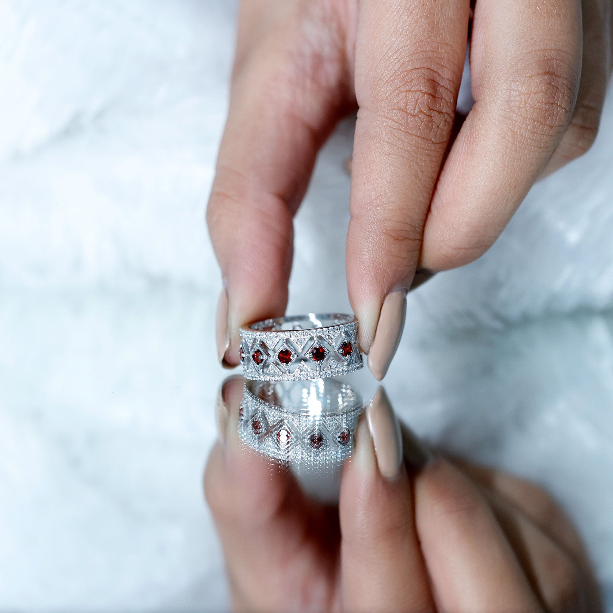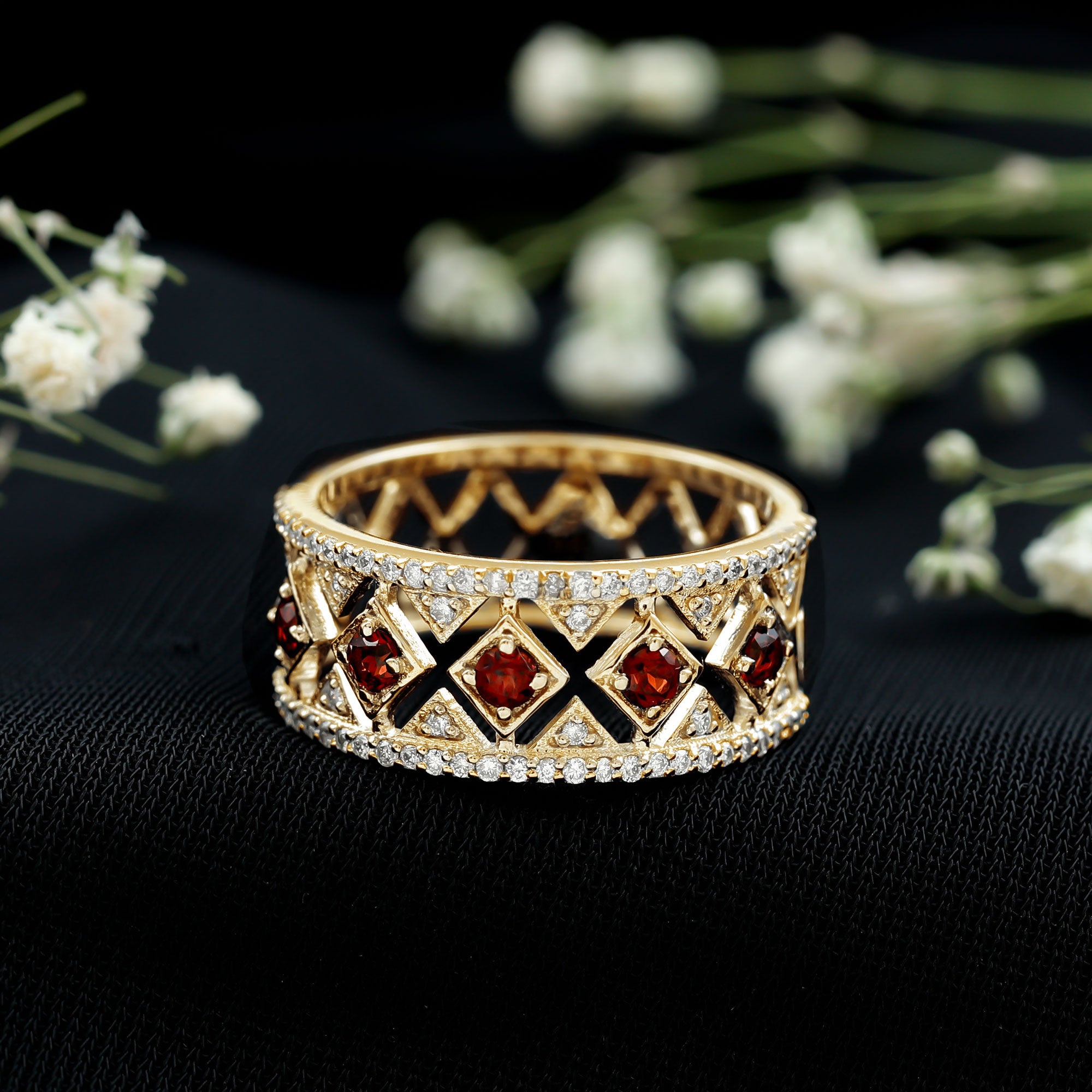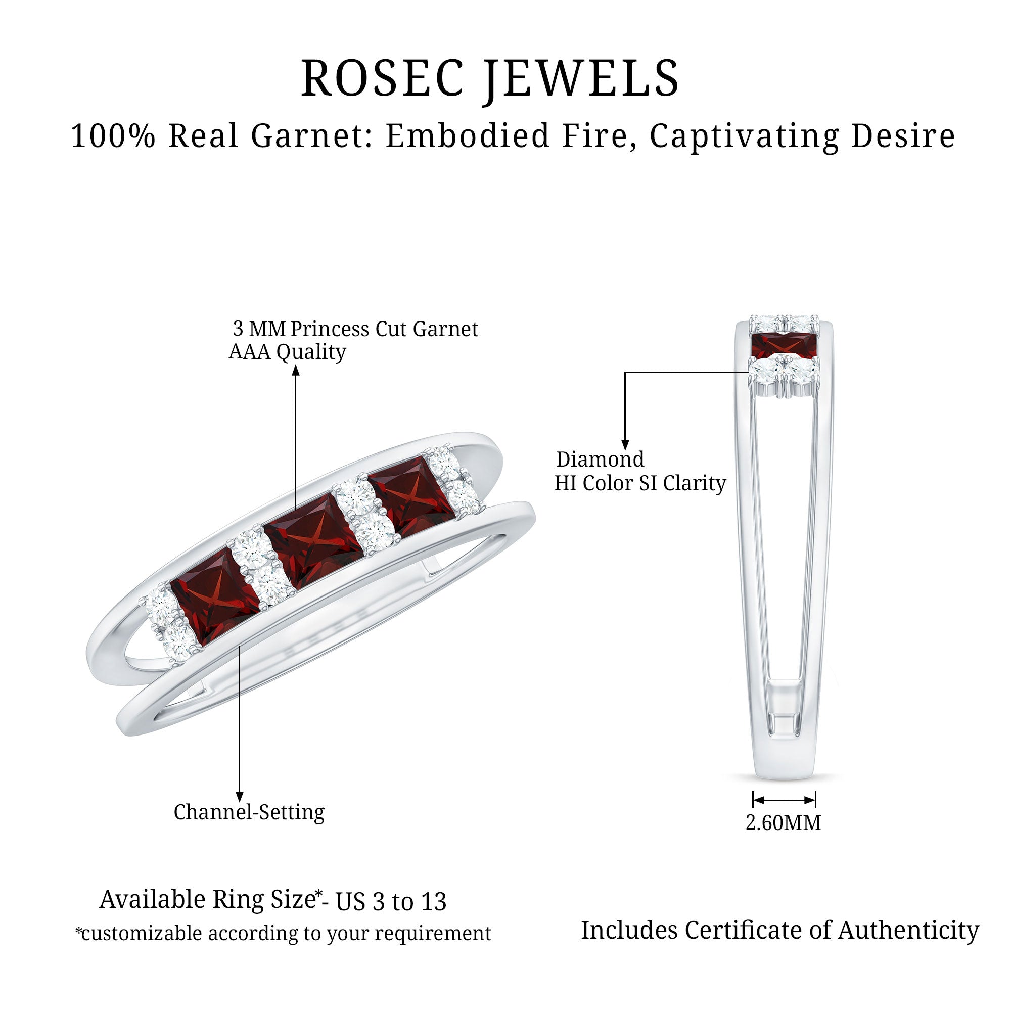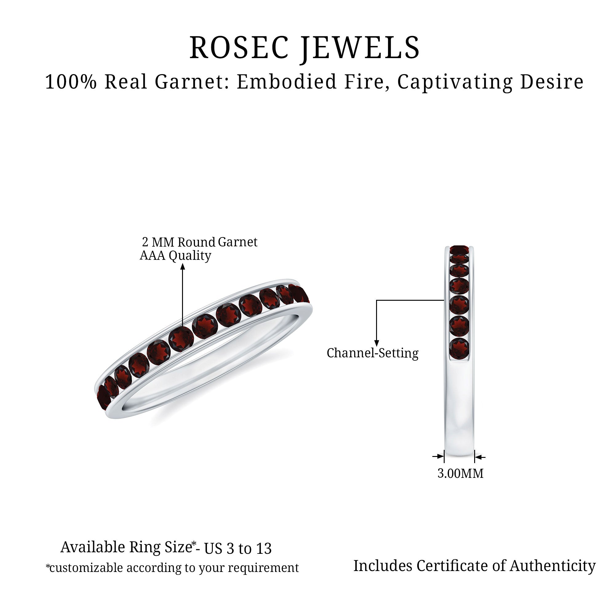 Rosec Jewels’ Garnet wedding rings featuring natural garnets, the member of silicate family of minerals and are widely cherished for their wide spectrum of colors of almost all the shades. This fantastic diversity in color helps jewelers to favor garnets while handcrafting garnet bands for men. Our artisans are also after curating January birthstone rings for wedding that are an enchanting beauty.