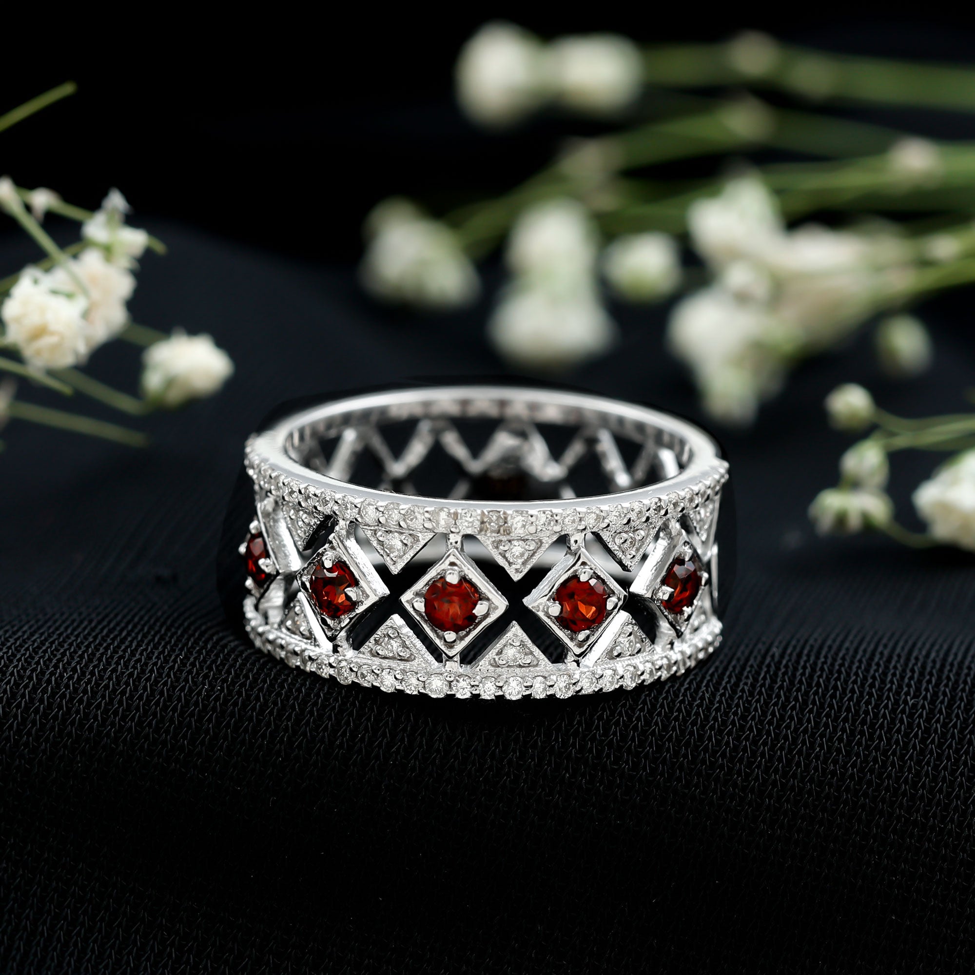 When worn as a wedding band, garnets can be a symbolism of love and life force, while a eternity wedding band in itself will symbolize a promise of love for eternity.