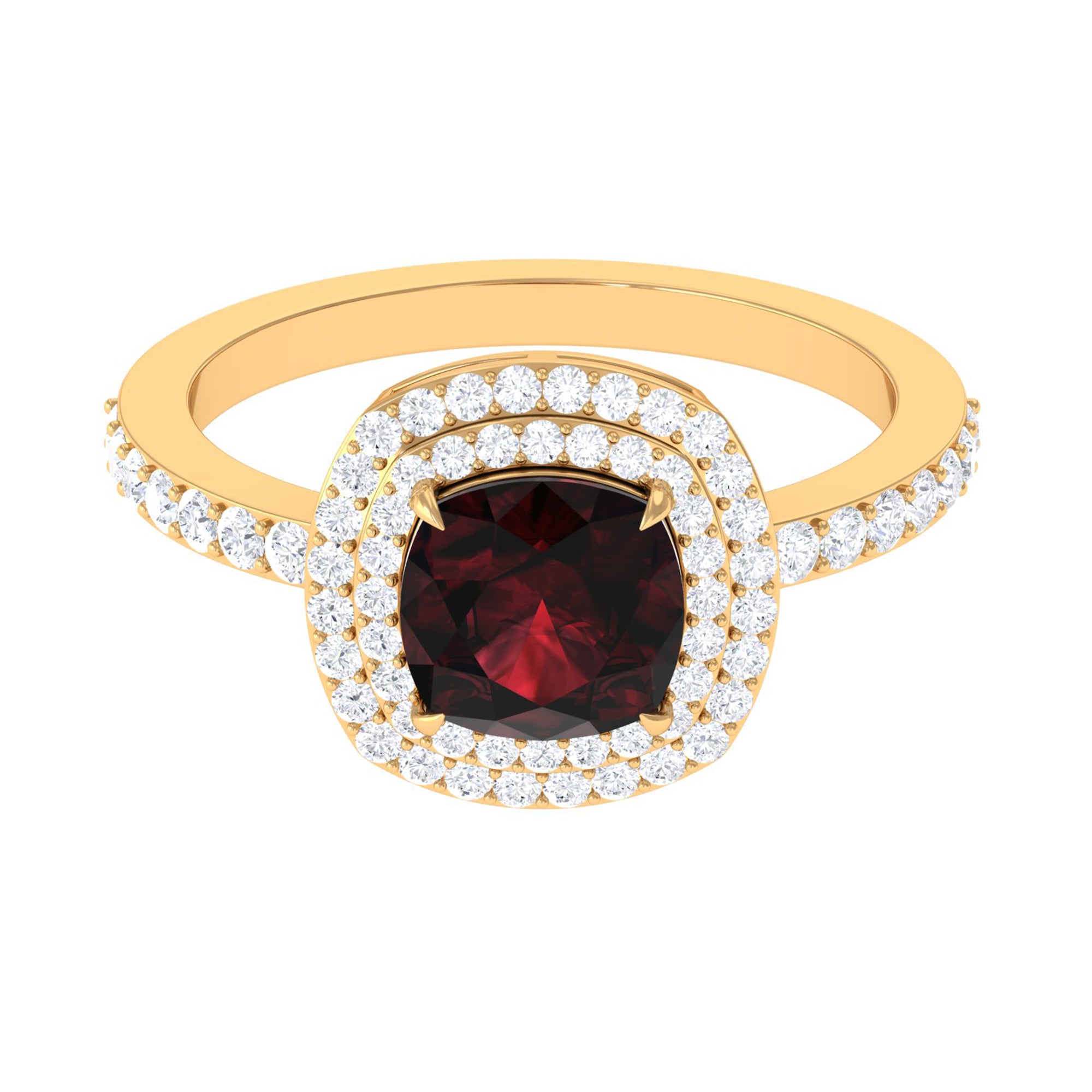 • Garnet Halo Rings: - A fascinating twist on the traditional Solitaire Ring is the “halo ring”, which features a circle of diamond or moissanite surrounding the garnet solitaire. The Halo isn't just about adding sparkle; it adds versatility to the ring. Furthermore, it draws more focus to the garnet, creating the illusion of a larger stone. The halo style makes the ring more unique and attractive.