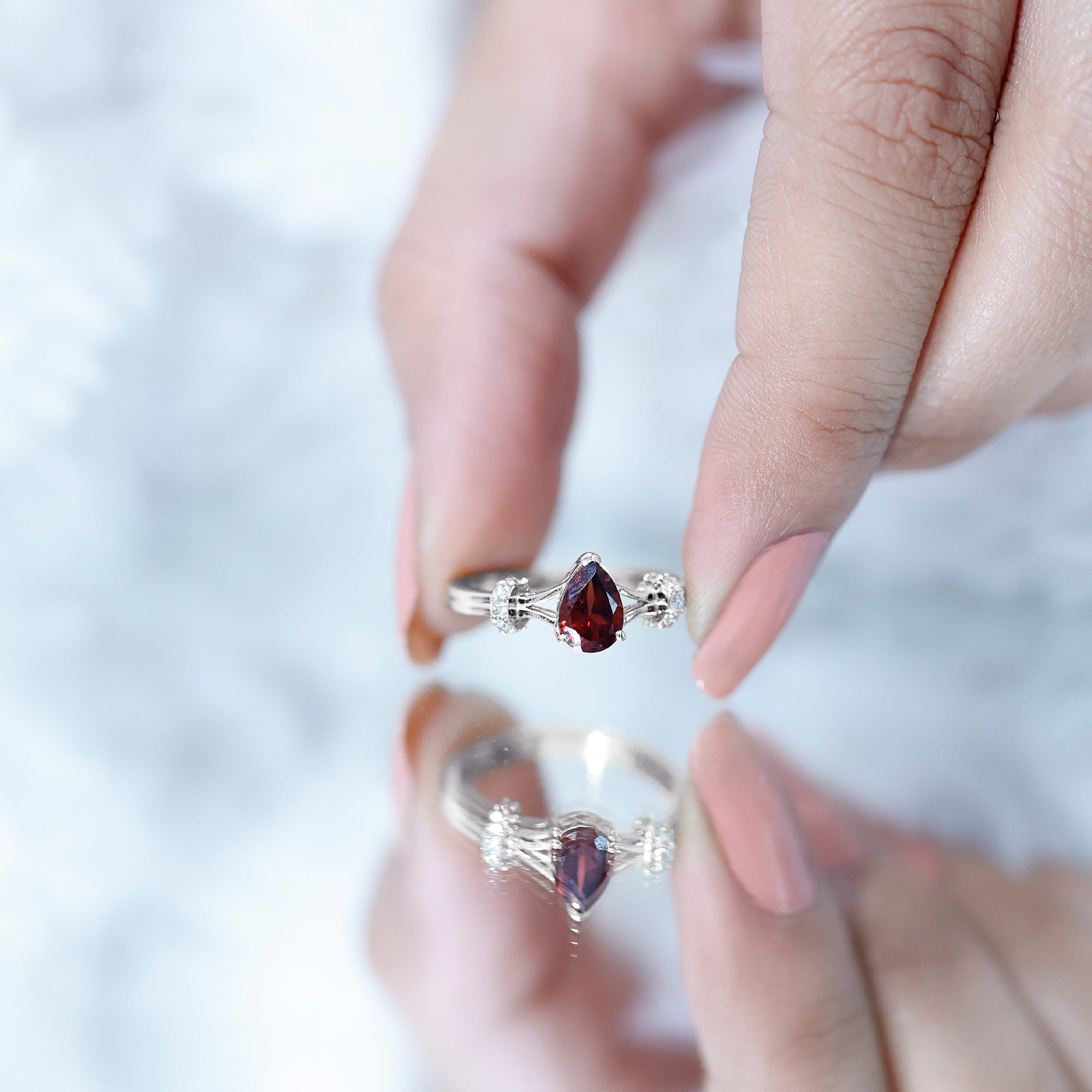 Garnet Solitaire Rings: - Truly the most traditional option for a garnet engagement rings, the Solitaire Style emphasizes the singular centerpiece of garnet. What's great about this style is its versatility, appealing to various aesthetics. While a round cut garnet solitaire ring might be the classic choice. You can also opt for fancier cuts such as marquise, pear, or princess shapes to add a contemporary touch. For those seeking a vintage vibe then an asscher, cushion, or emerald cut garnet engagement ring will be the ideal choice.