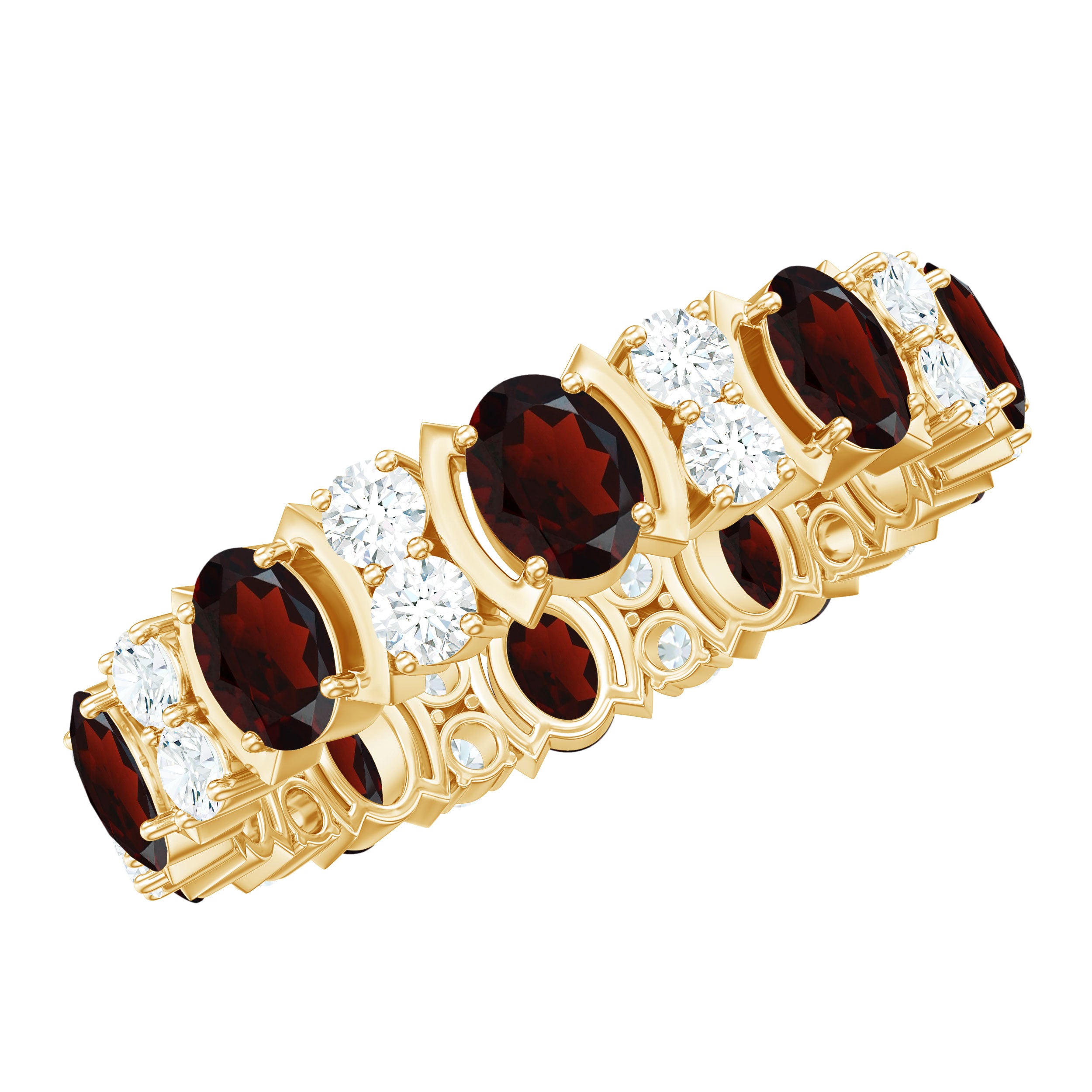 Garnet Eternity Rings: - An eternity ring showcases a continuous circle of garnets, providing a vibrant burst of color for those seeking more than a solitaire style. With its bold red hue, a garnet eternity ring becomes a classic yet striking accessory in your jewelry collection. Moreover, a garnet and diamond ring in an eternity style offers a unique blend of color and sparkle, making it a truly exotic choice. Beyond its aesthetic appeal, this style symbolizes a love that transcends boundaries, making it a meaningful option for a garnet wedding ring.