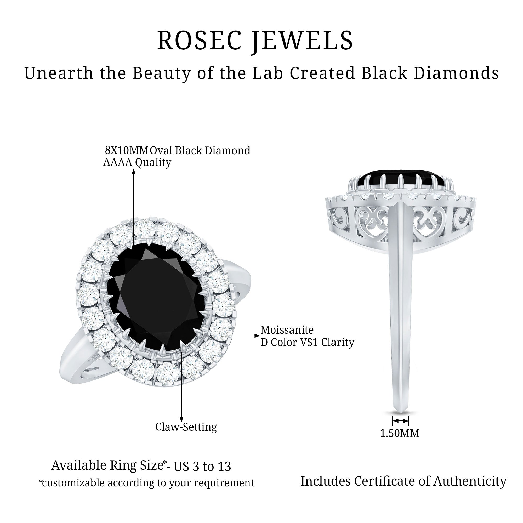 Lab grown black diamonds compared to natural counterparts are easily available, hence designers get a chance to try more complex designs. Bigger diamonds with intricate patterns or unique rings with preferred sizes and settings are easier to create. Black diamonds score 10 on the Mohs scale of hardness, making them durable gemstones, perfect for everyday wear.
