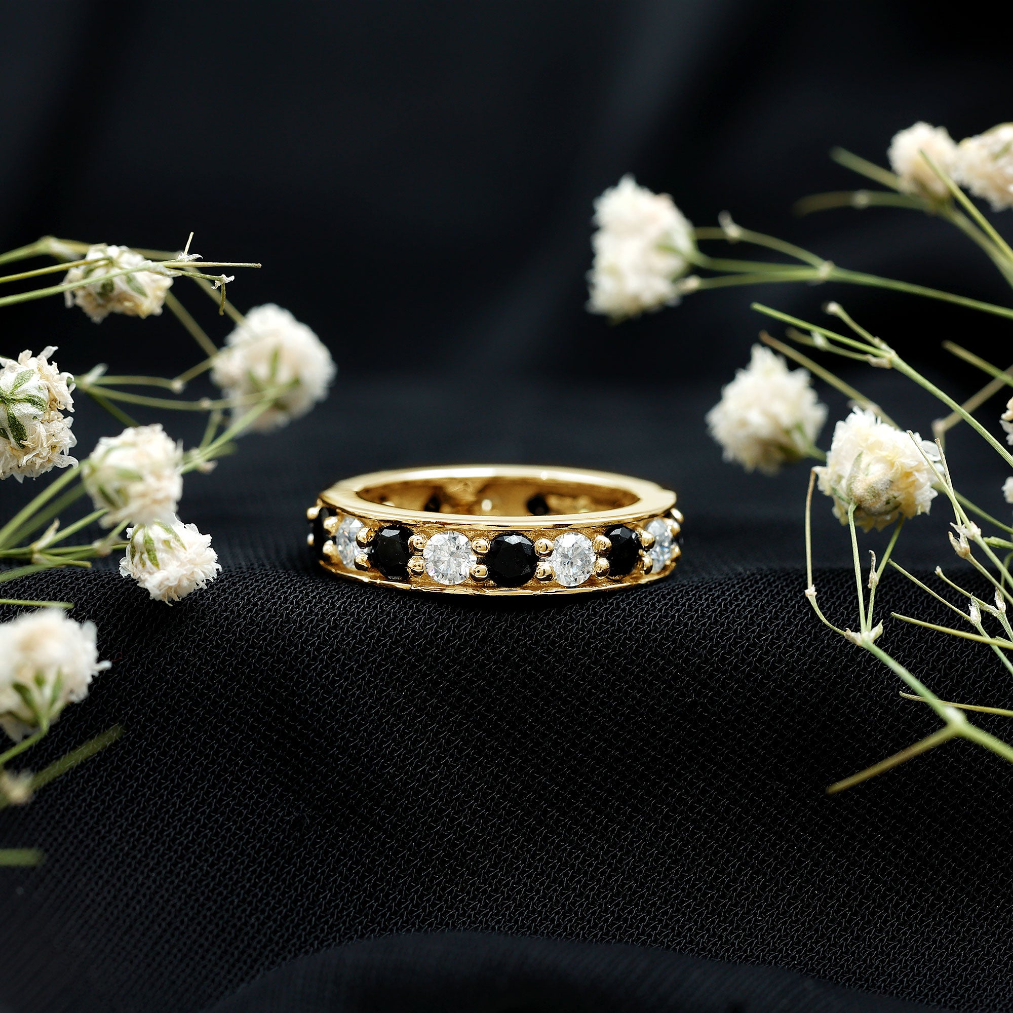 Celebrate your anniversary or special occasion with a lab black diamond eternity ring. This ring has a band of stunning black diamonds. It helps you stand out and enhances any other ring next to it. This includes wedding bands and engagement rings.