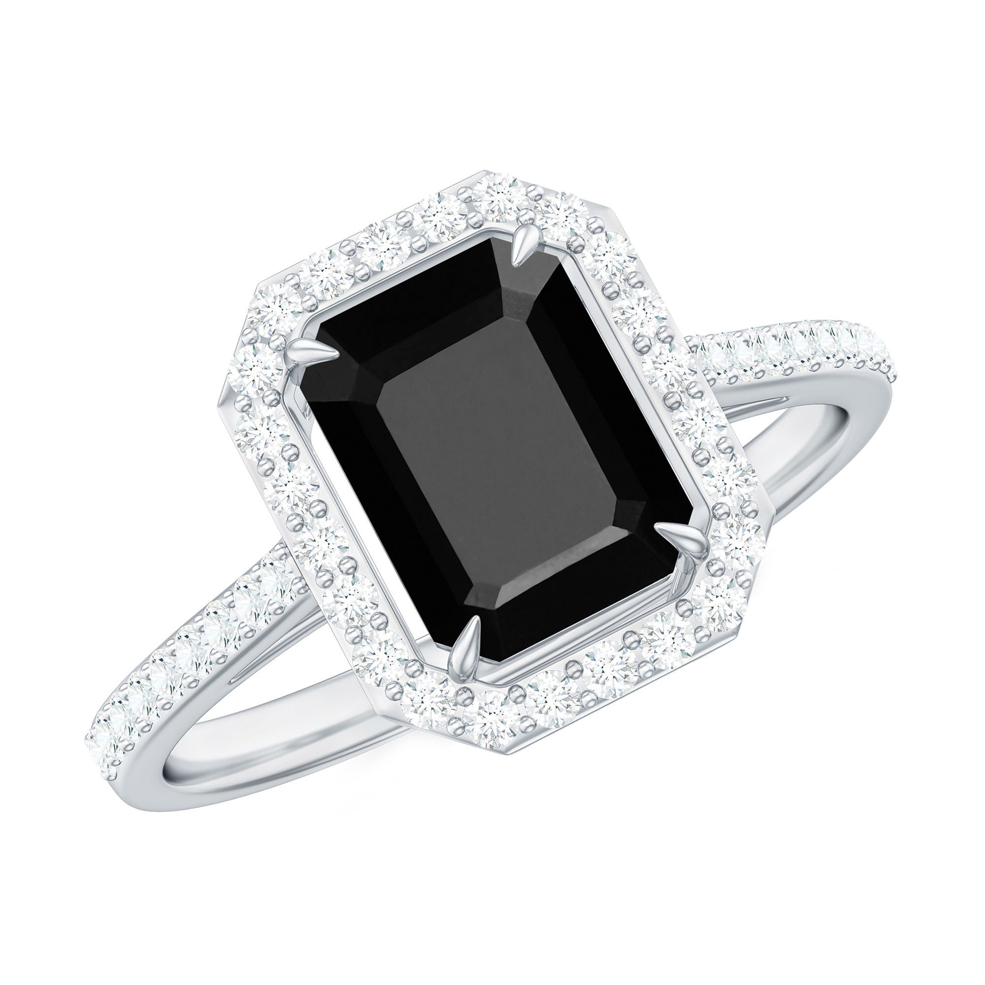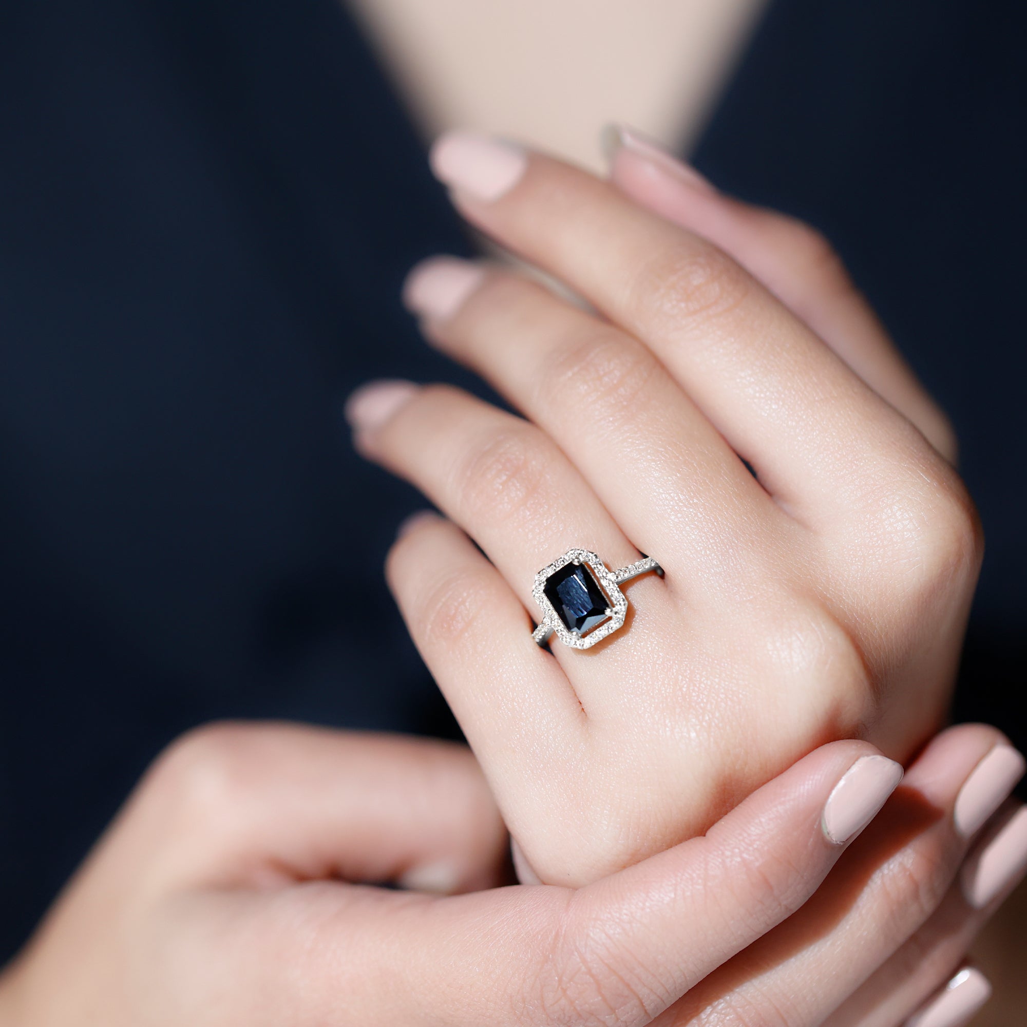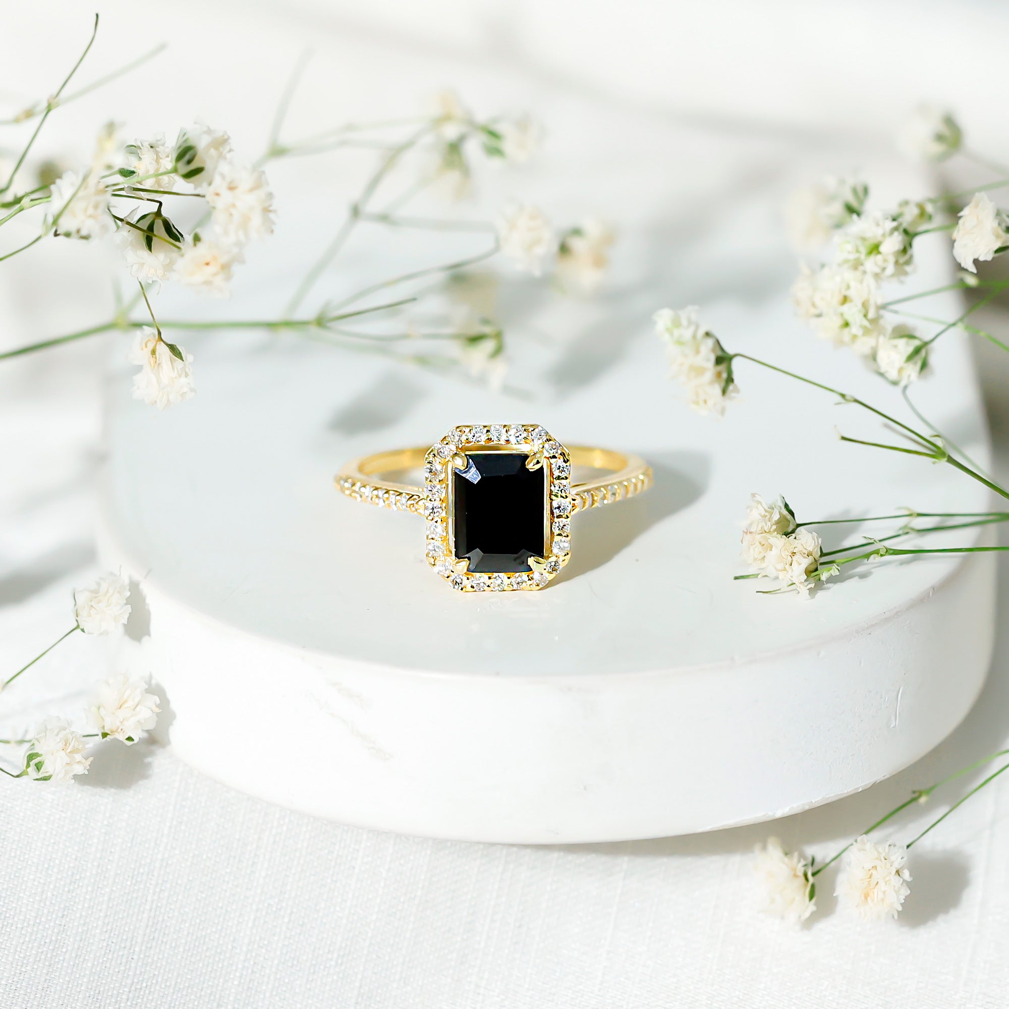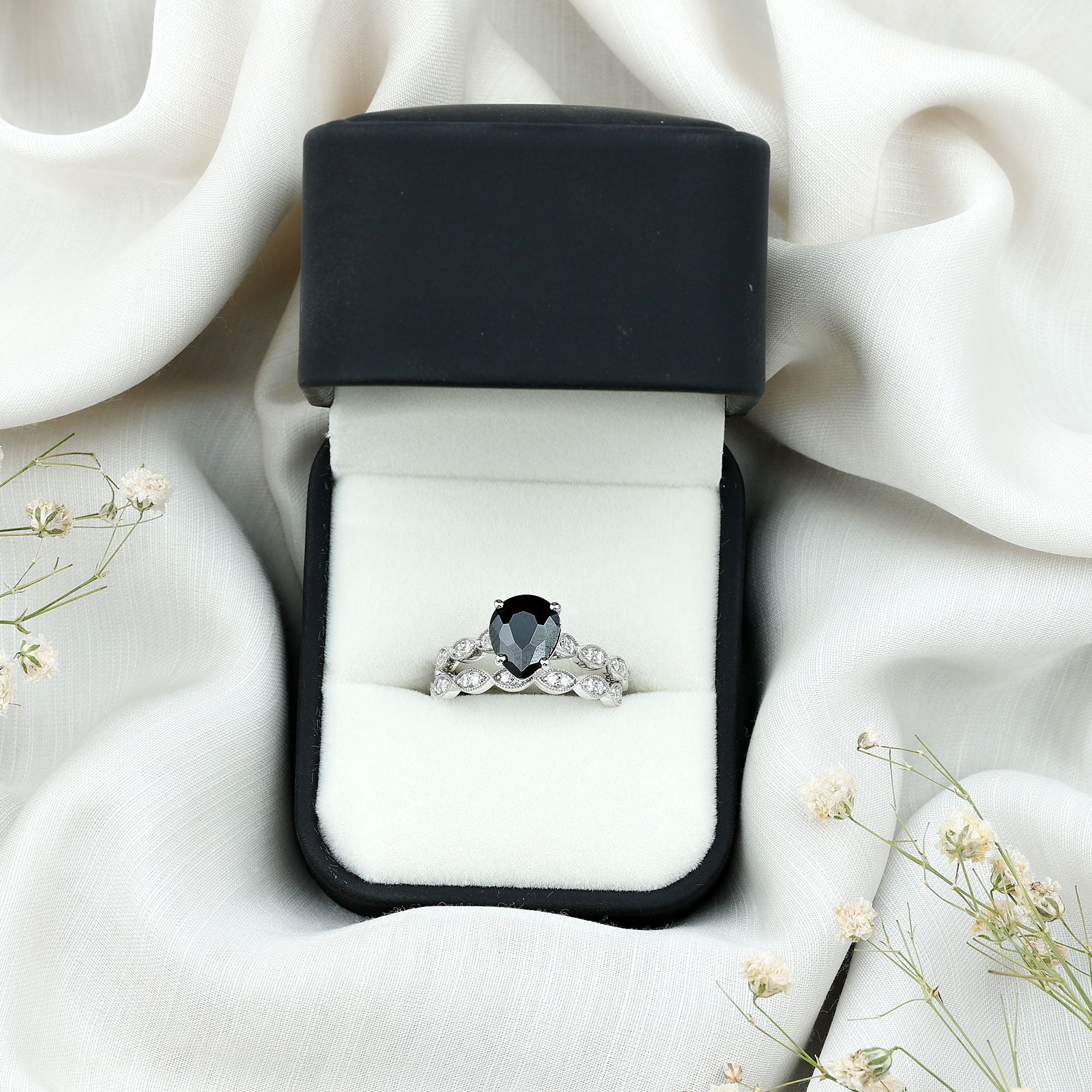 This ring style showcases a shimmering black diamond with dainty round diamonds or moissanites all around the centerpiece. It helps lend more character to the ring, adding an extra layer of sparkle (known as a halo).