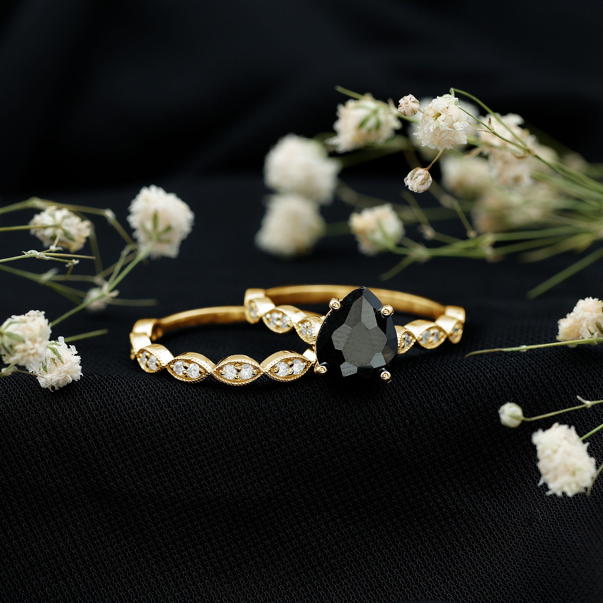 This style of ring is meant to speak old school couples, vintage style rings feature ornate designs that are symbolic of the Art Deco, Edwardian, and Victorian Eras. You’ll most likely come across antique designs that incorporate milgrain and filigree details, geometric patterns, or floral motifs that complement the exotic hue of lab black diamonds.