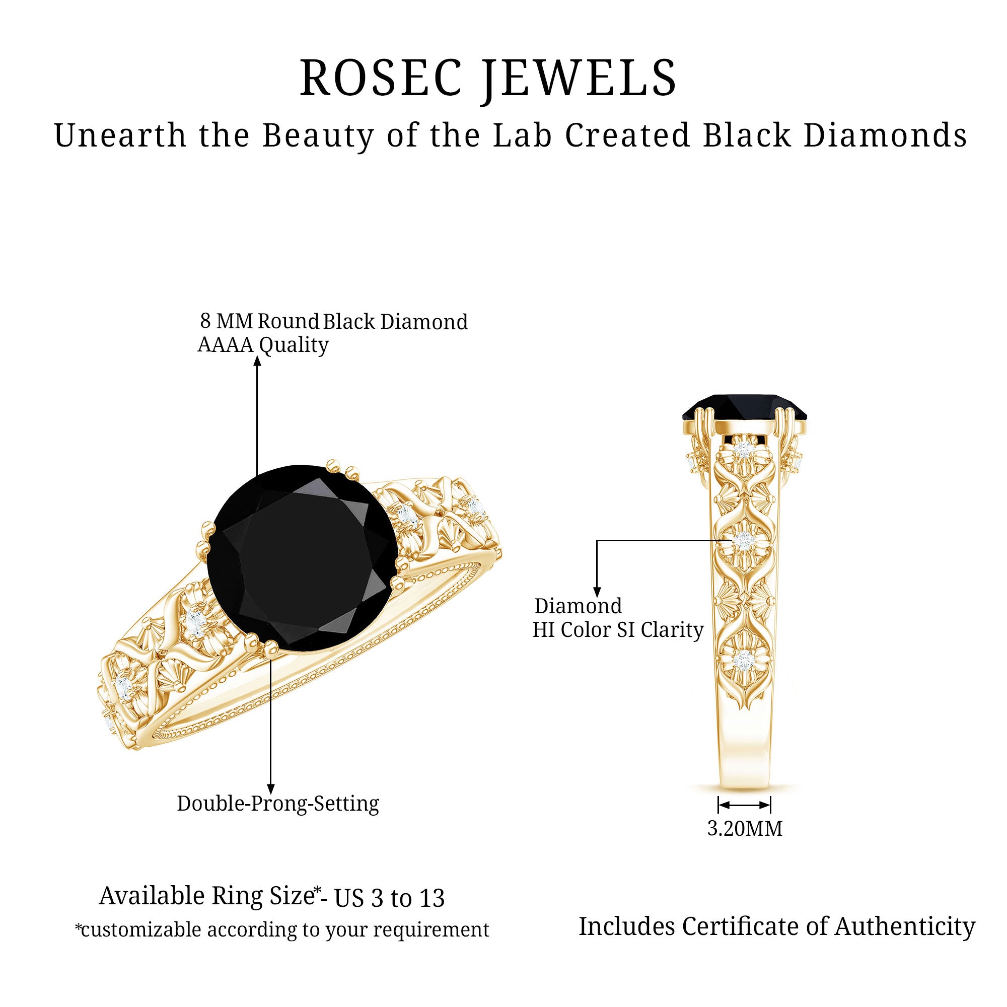 This style of ring is meant to speak old school couples, vintage style rings feature ornate designs that are symbolic of the Art Deco, Edwardian, and Victorian Eras. You’ll most likely come across antique designs that incorporate milgrain and filigree details, geometric patterns, or floral motifs that complement the exotic hue of lab black diamonds.