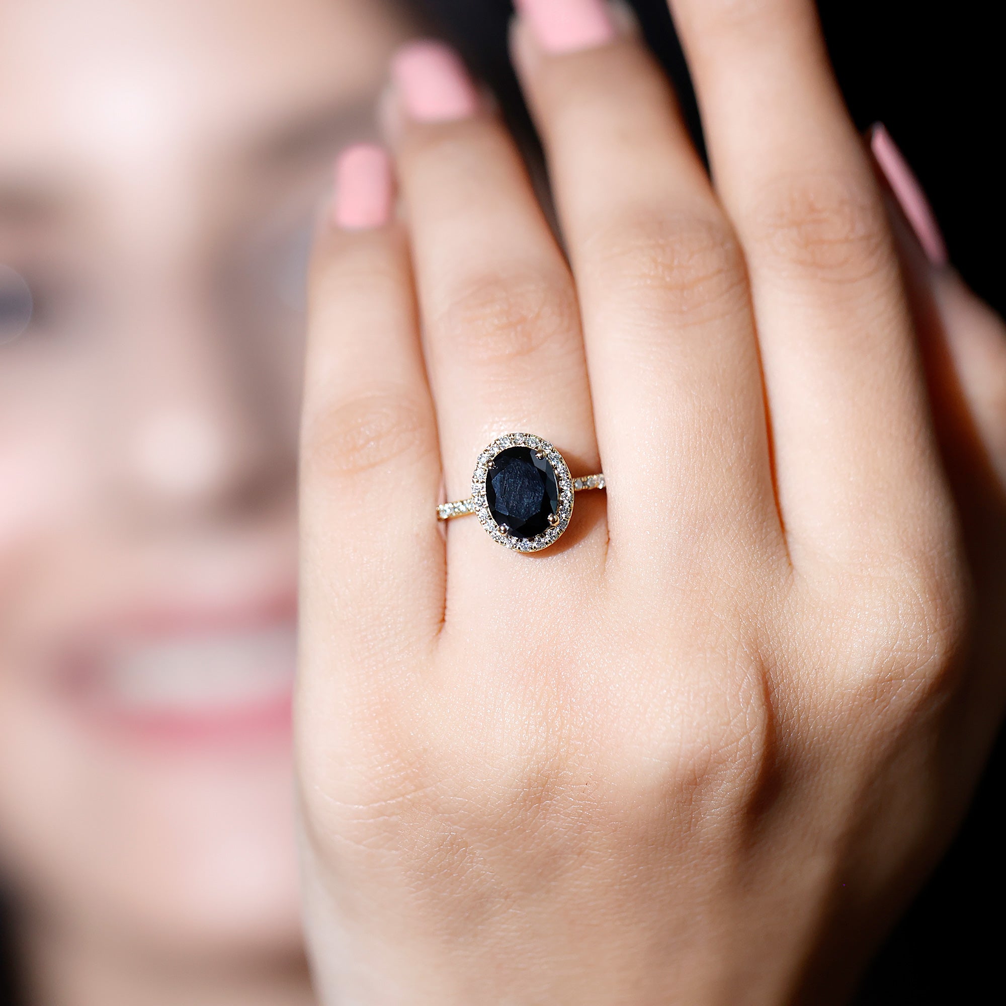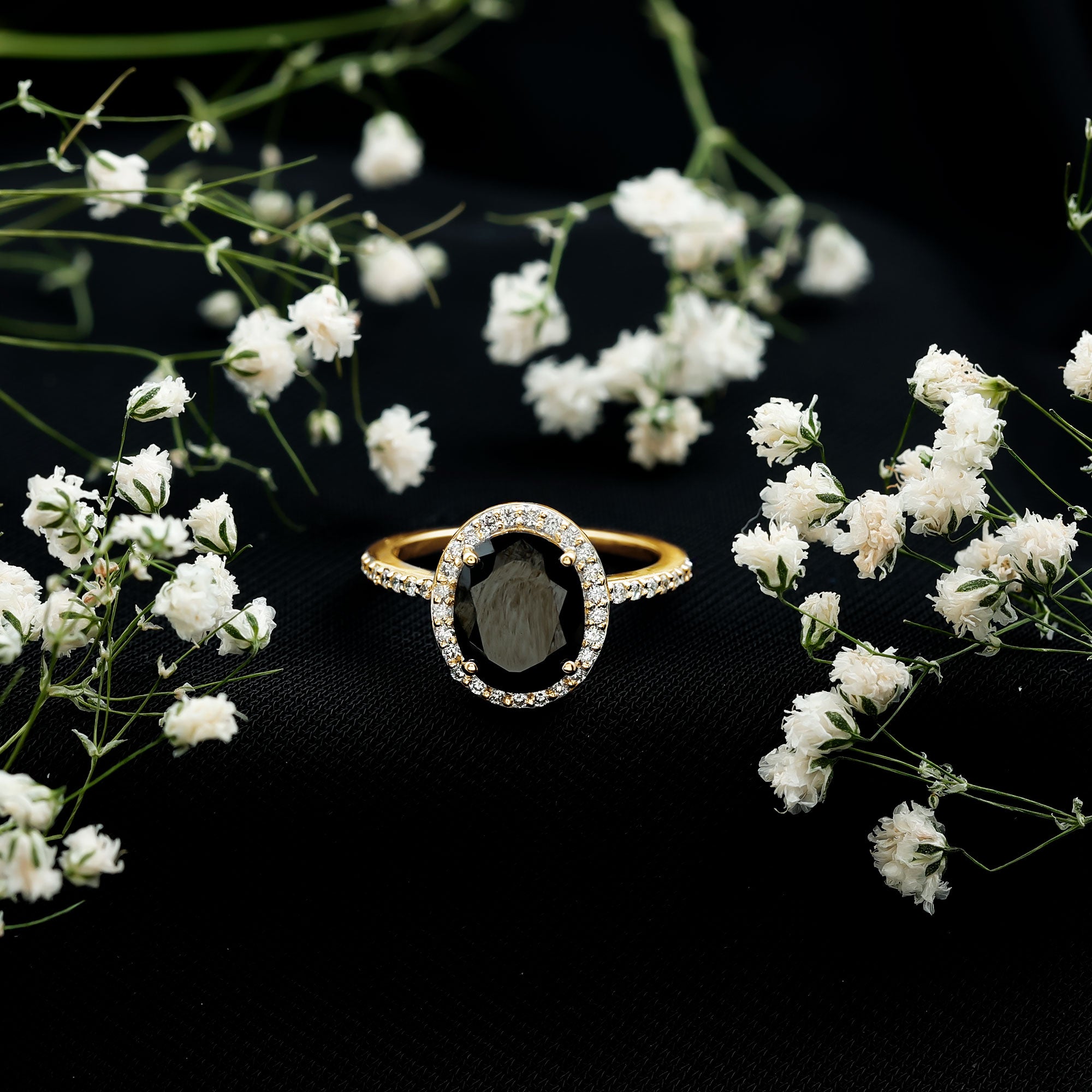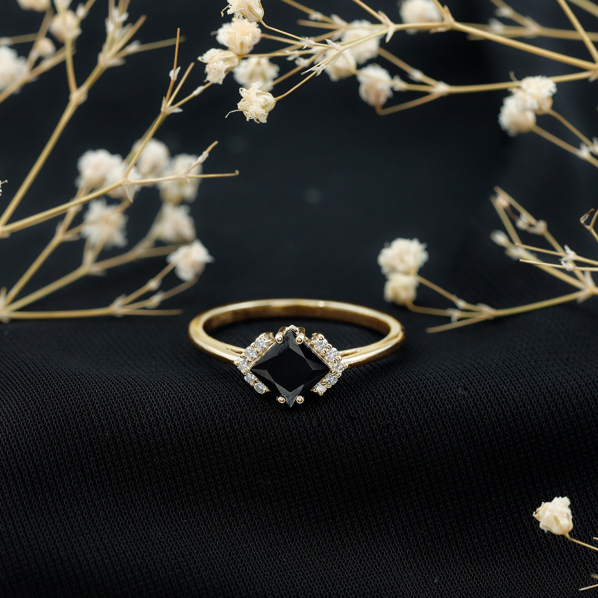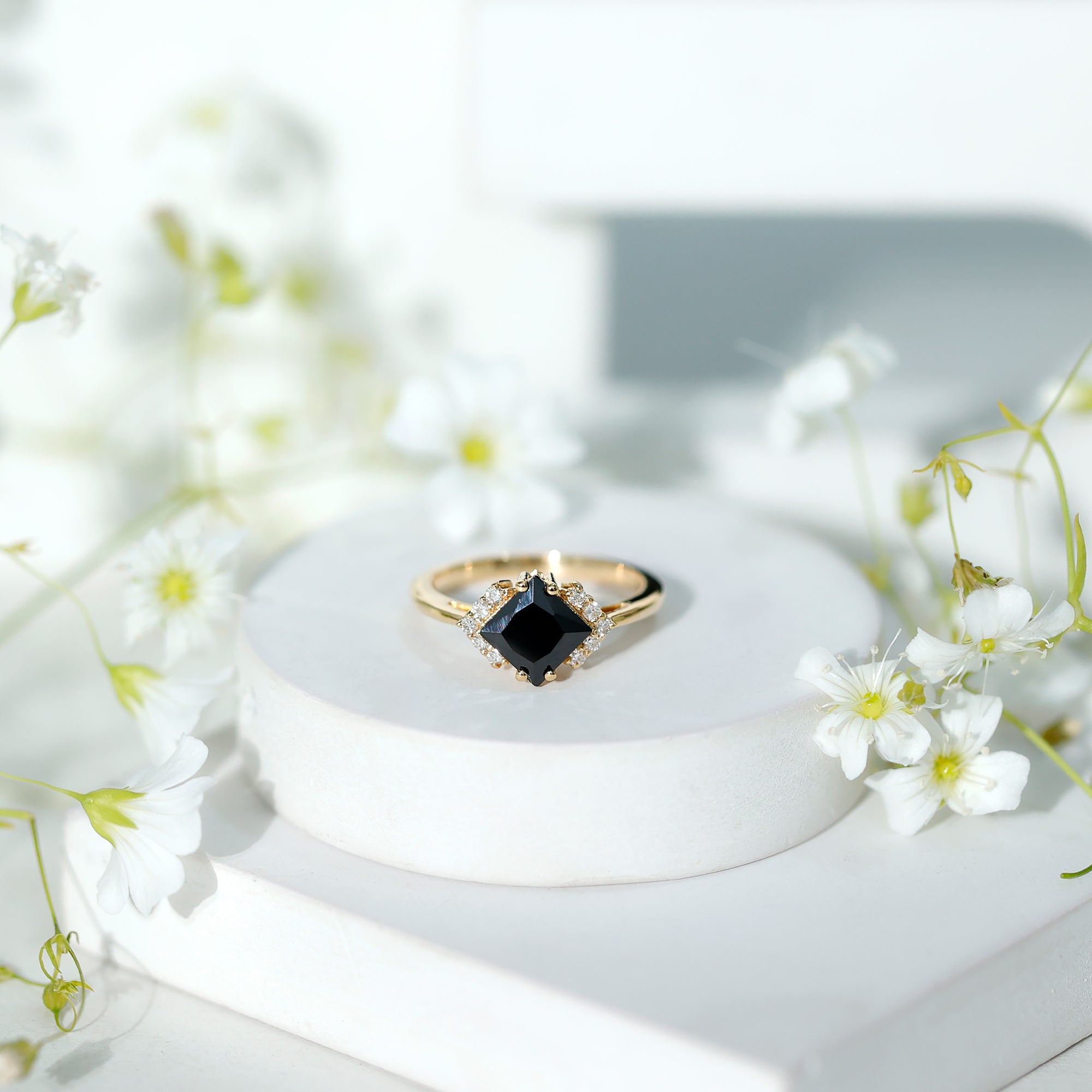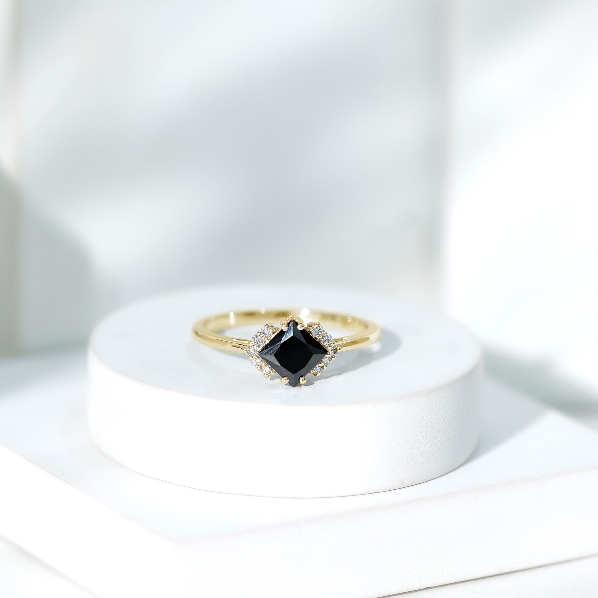 This ring style showcases a shimmering black diamond with dainty round diamonds or moissanites all around the centerpiece. It helps lend more character to the ring, adding an extra layer of sparkle (known as a halo).