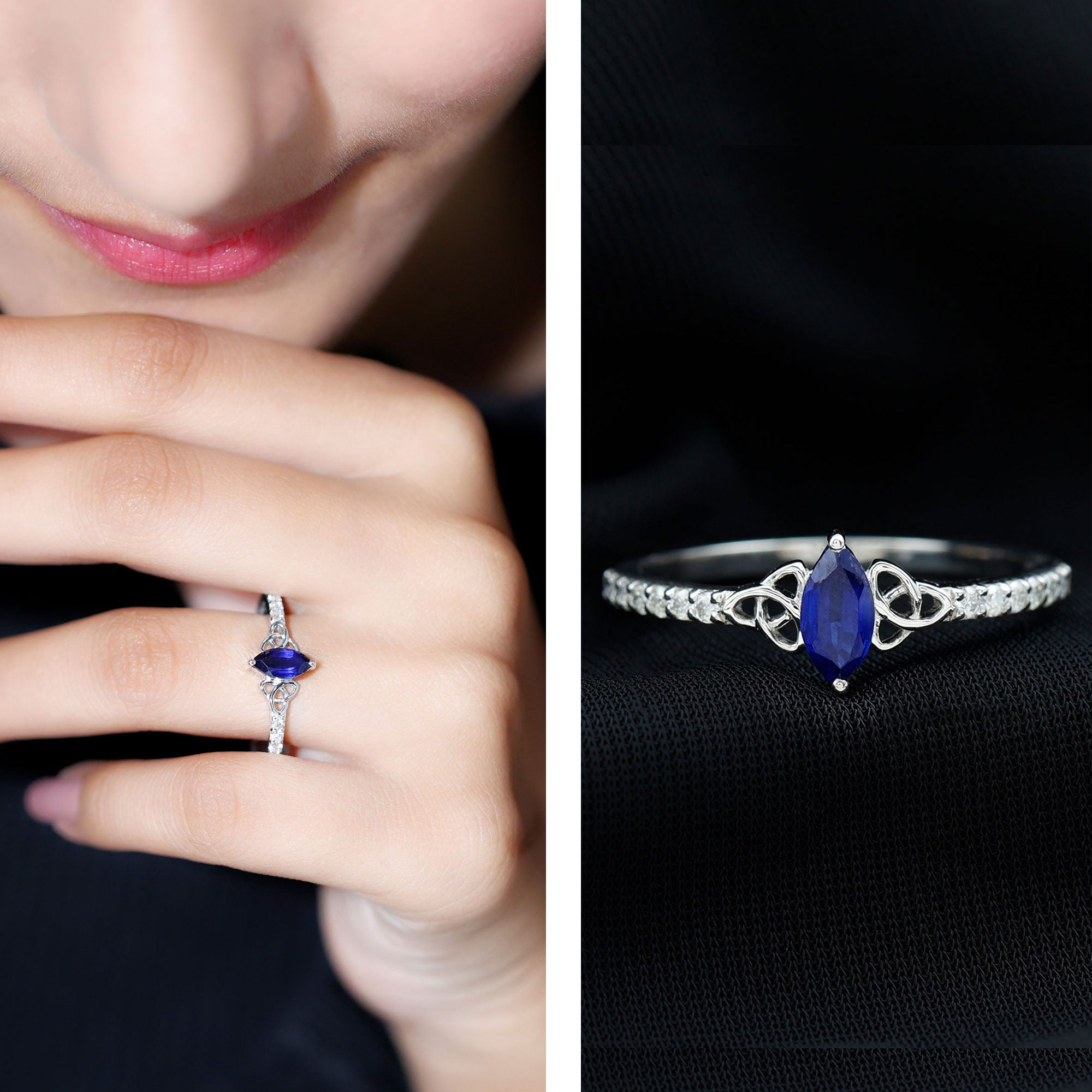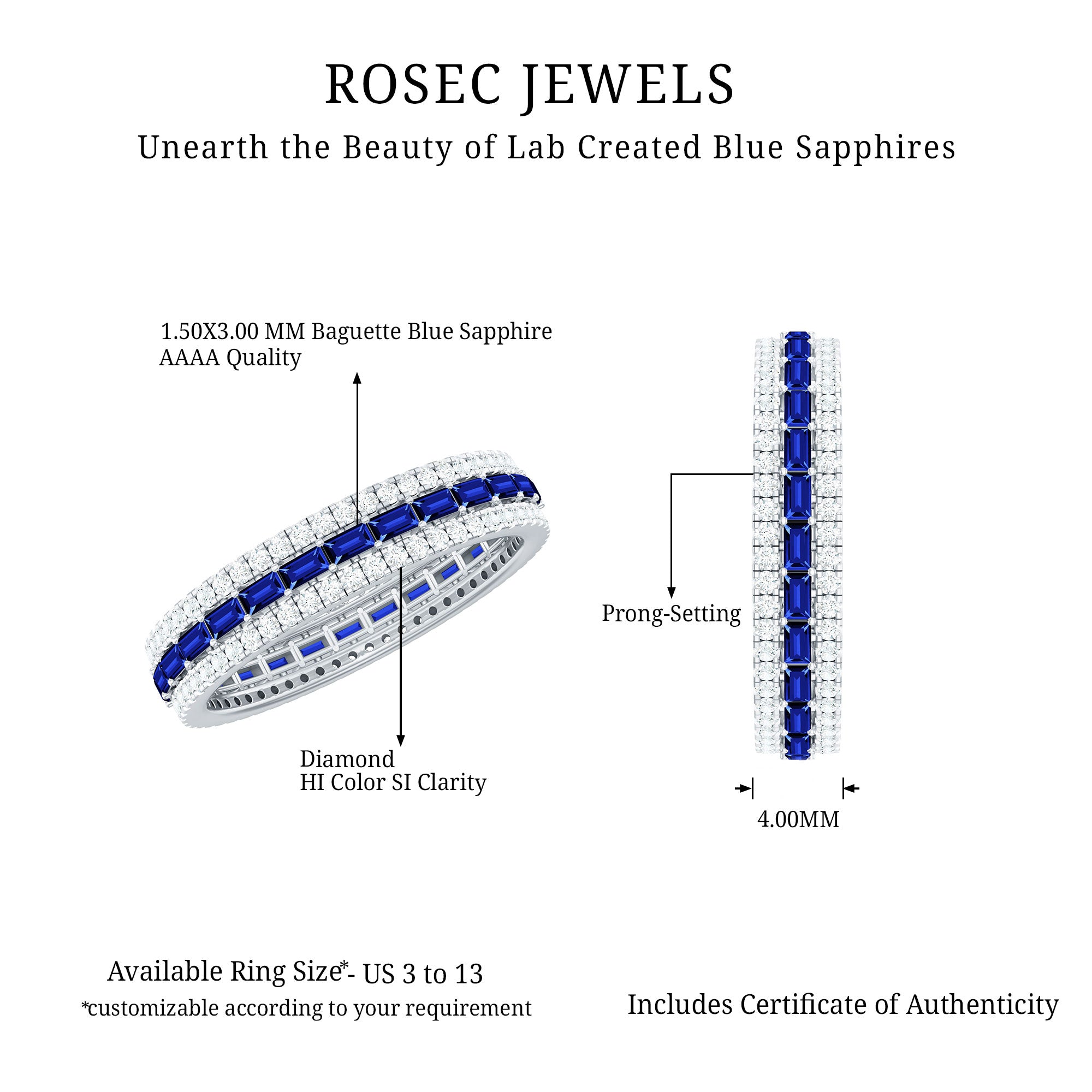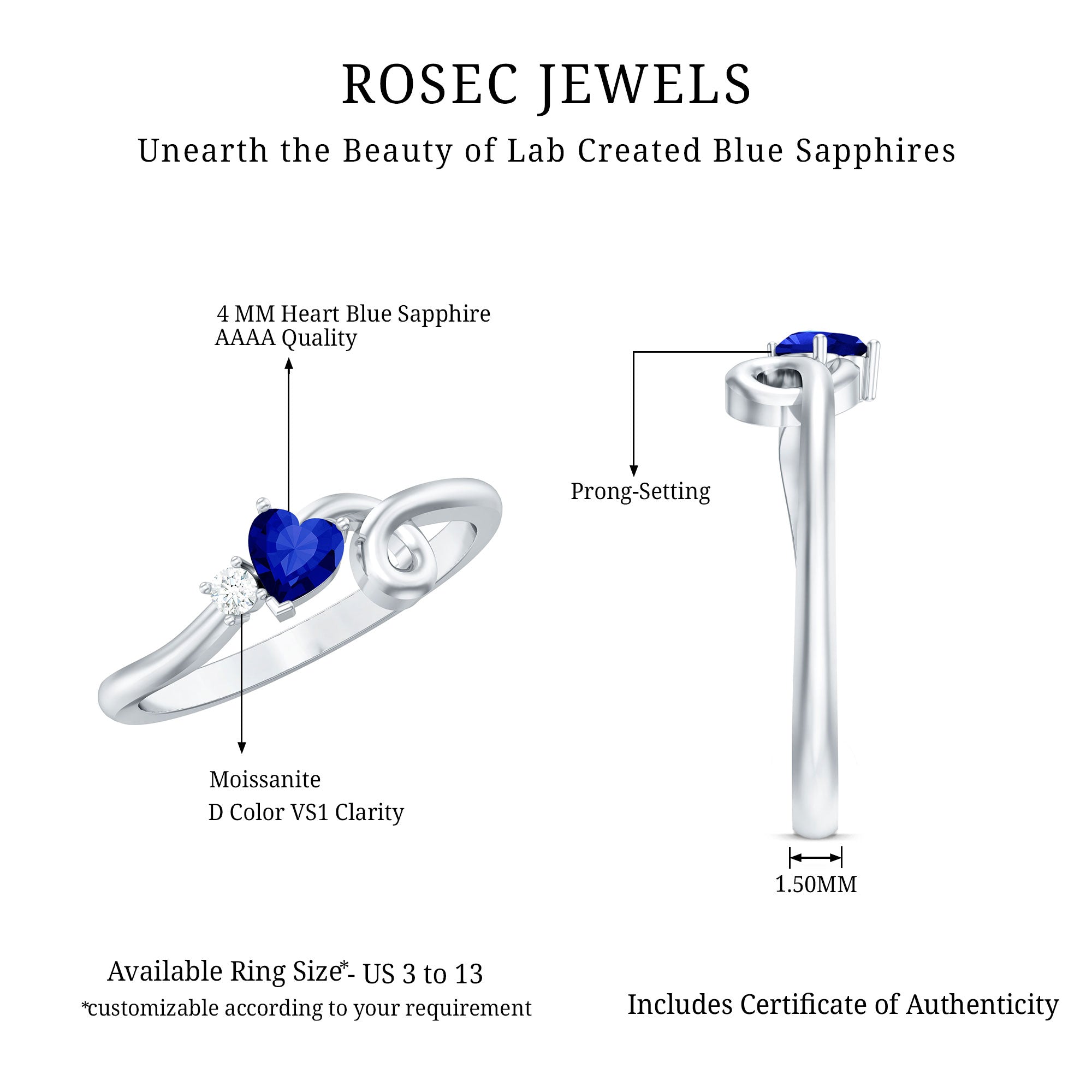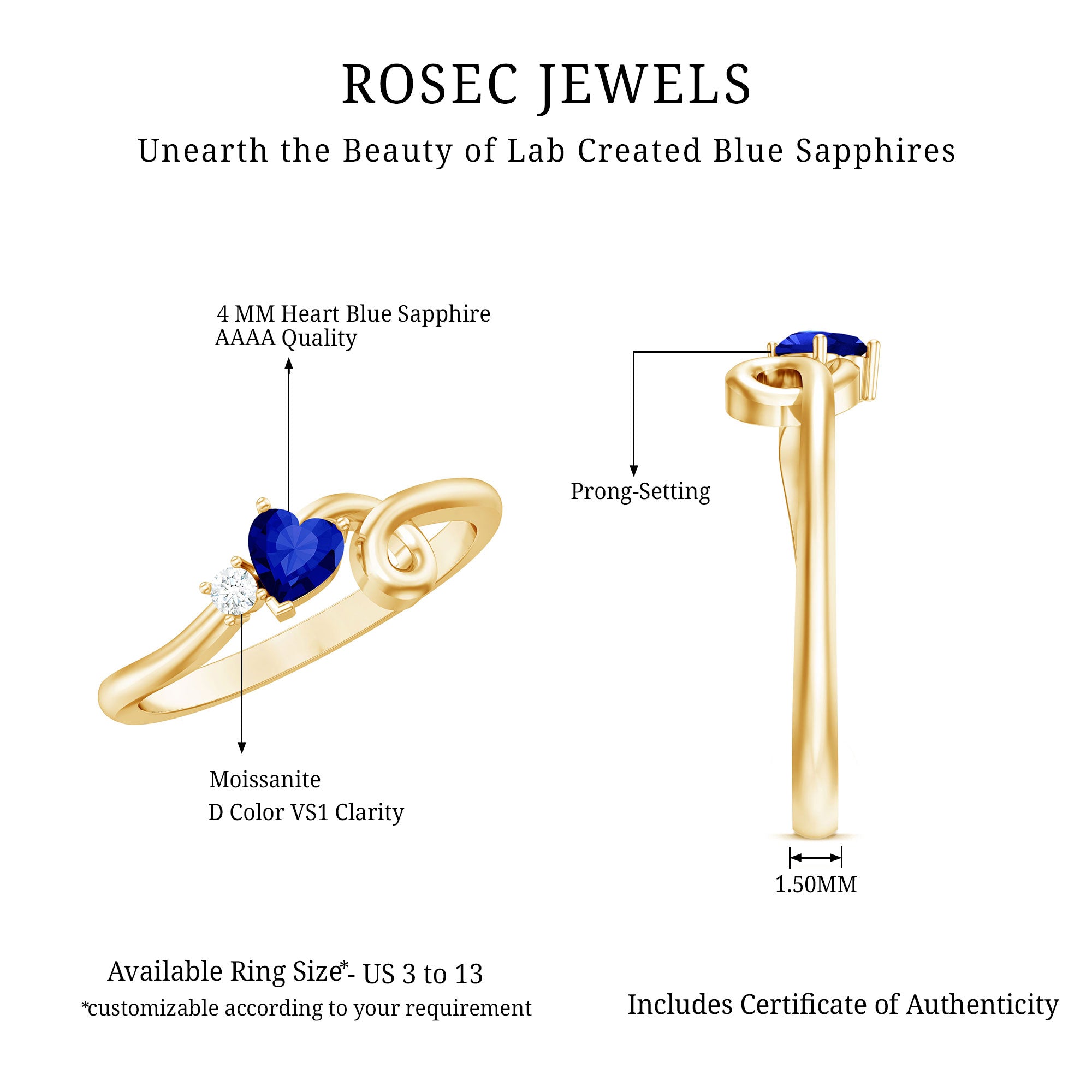 Our Lab Grown Blue Sapphire Rings are certified with AAAA quality gemstone, paired along with other precious stones such as Moissanite. These Lab Grown Blue Sapphire Rings are eco-friendly as they are grown in a lab instead of being extracted from the mines. Our rings are available in two precious metals, silver and gold (with two color choices available in gold only; white and yellow). Know more about our blue gemstone rings:
