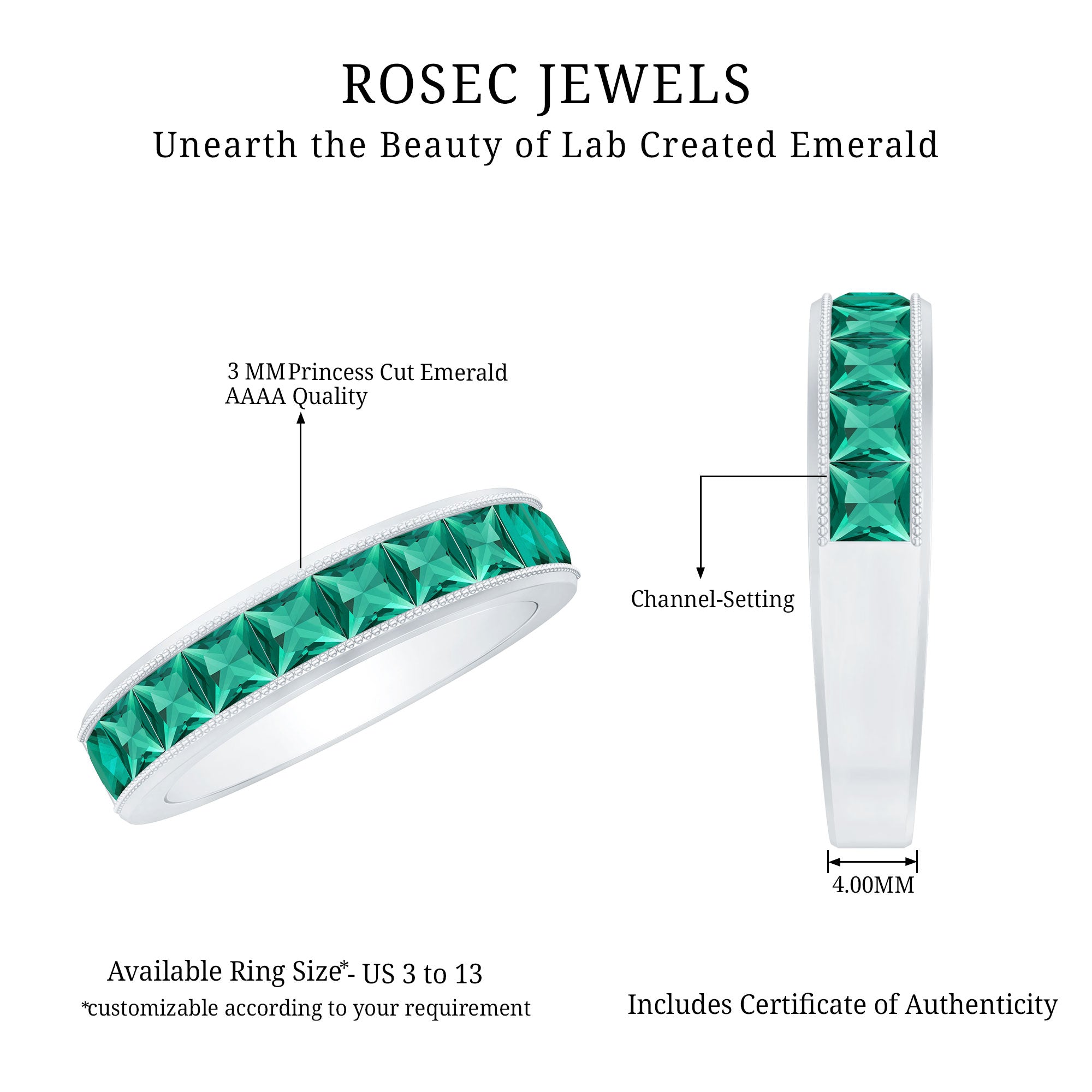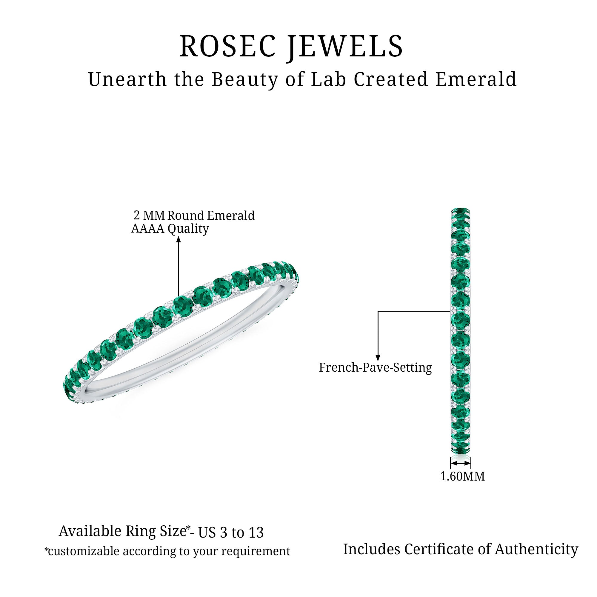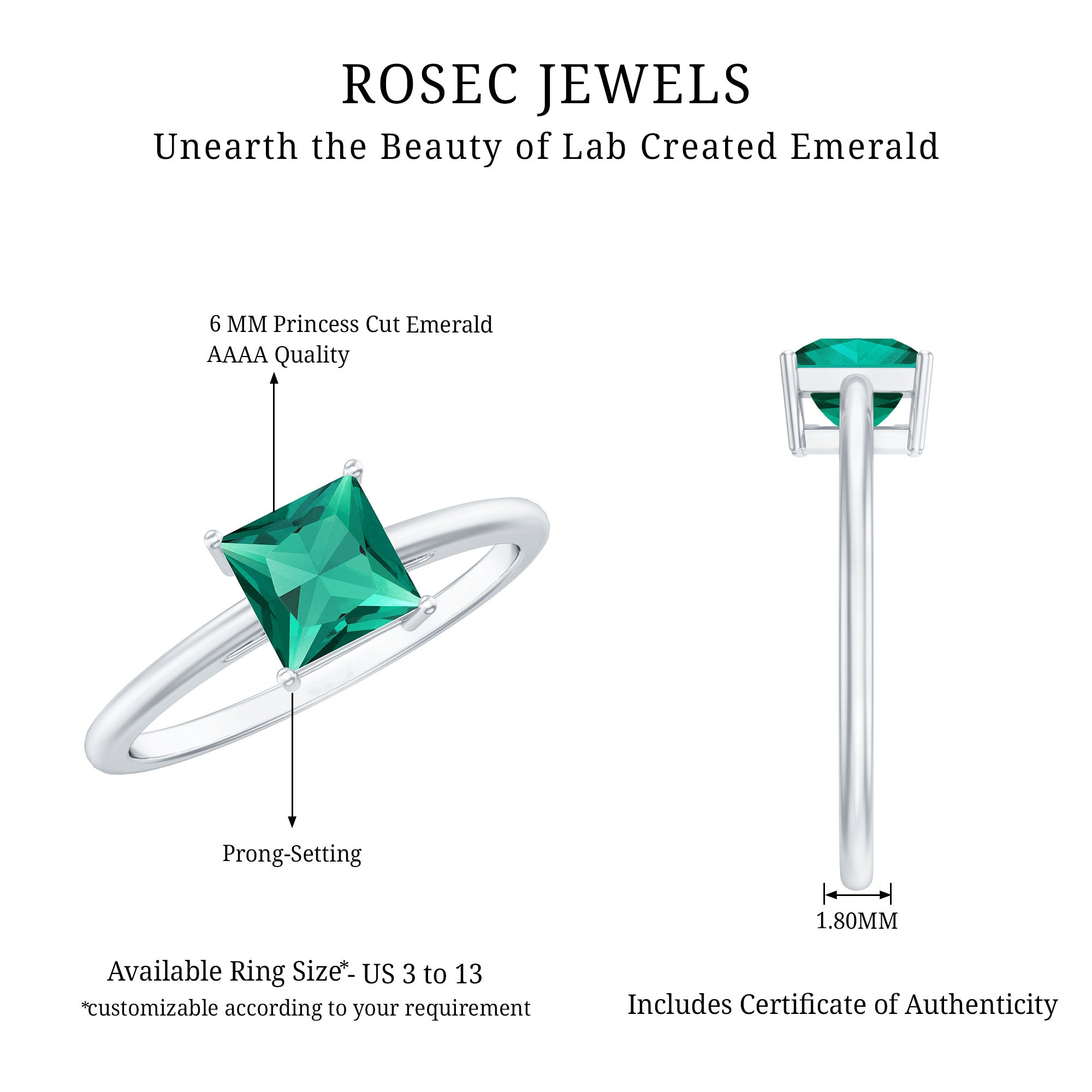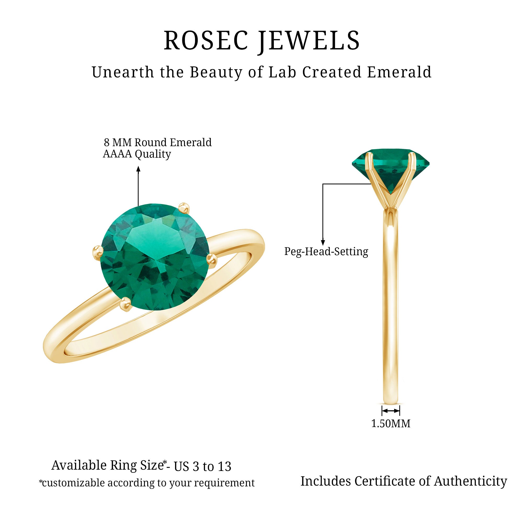 At Rosec Jewels, every piece is crafted with a focus on lasting wear and refined design. For lab grown emerald rings, we prioritize setting security and balanced proportions across everyday and statement styles. We provide our own certificate of stone authenticity/details with purchase.