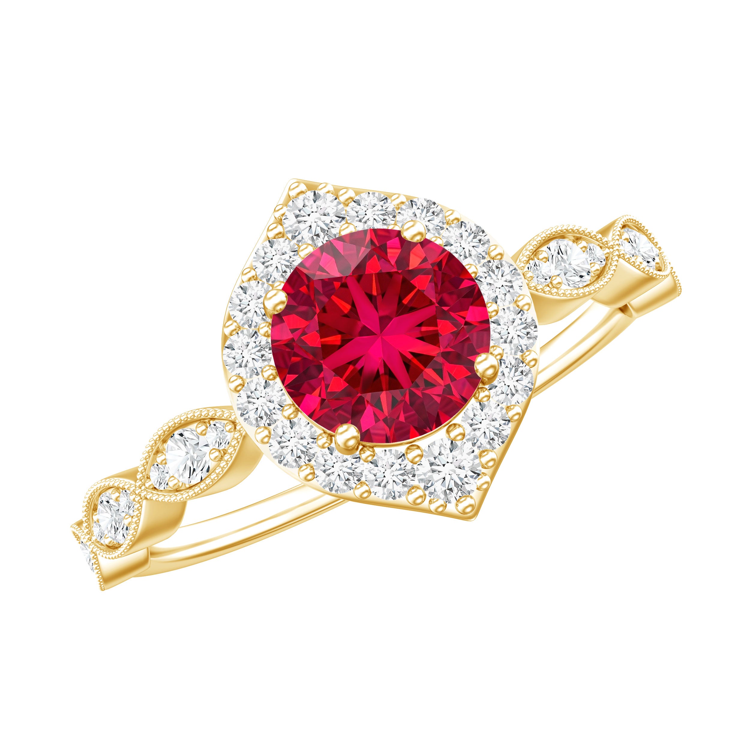 Solitaire and halo styles are the most popular because they highlight ruby color and sparkle. Three-stone and vintage-inspired designs are also top picks.