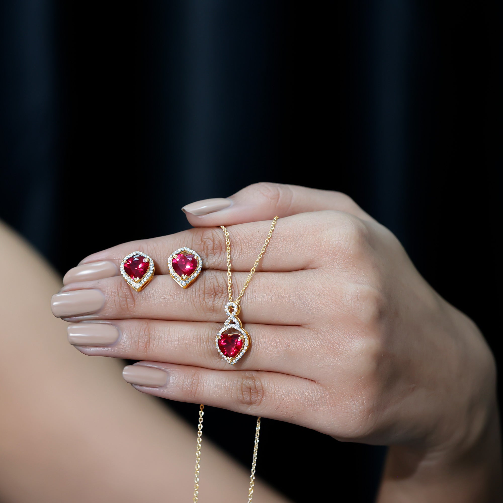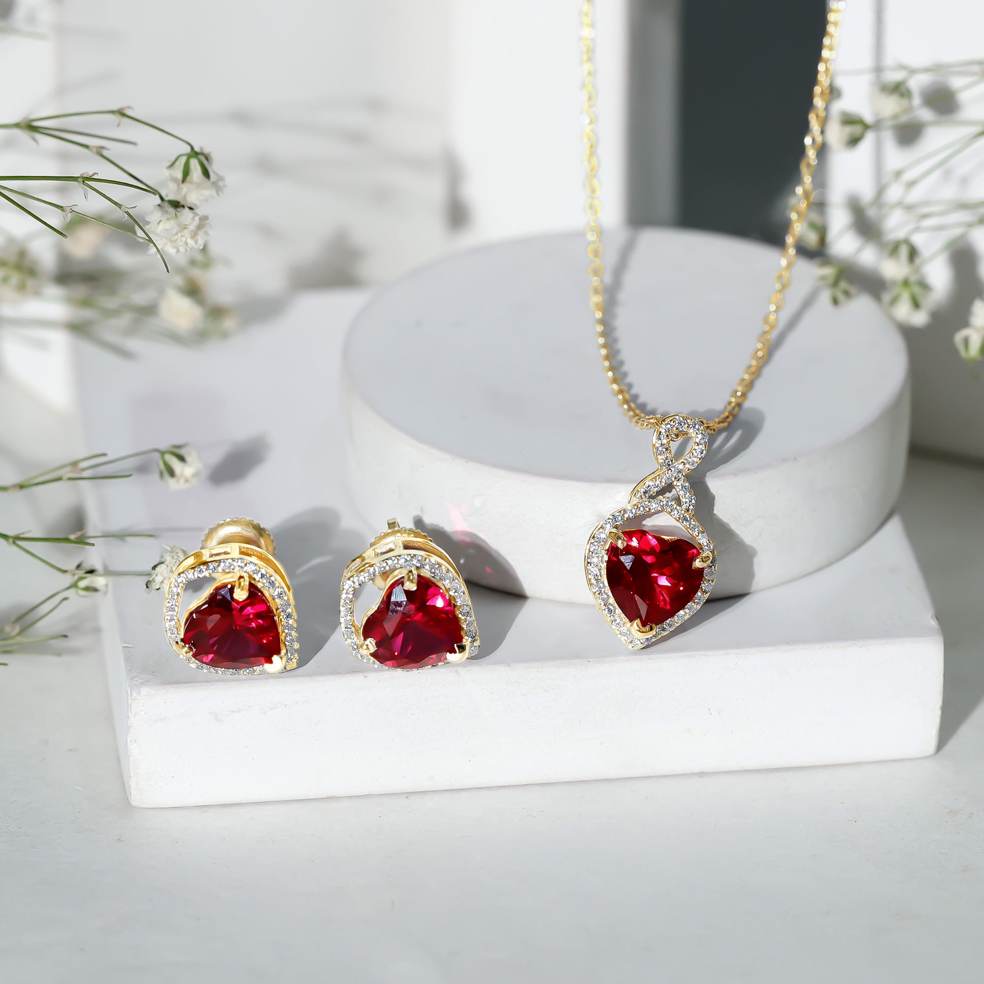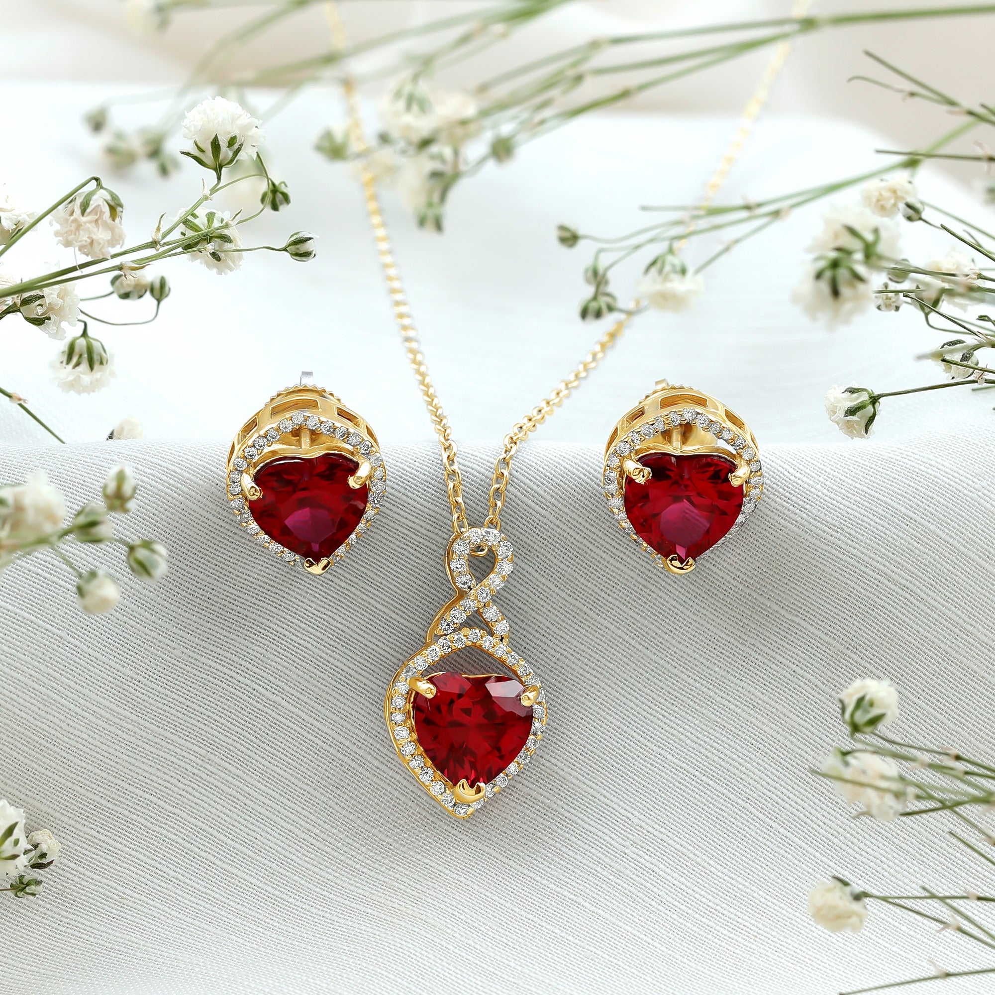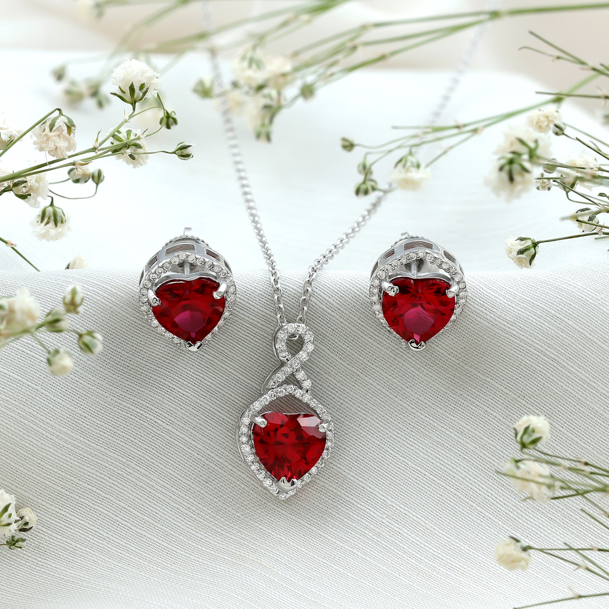 Many shoppers choose lab rubies for consistent red color in pendants and matching sets. Natural rubies can vary more in tone and inclusions.