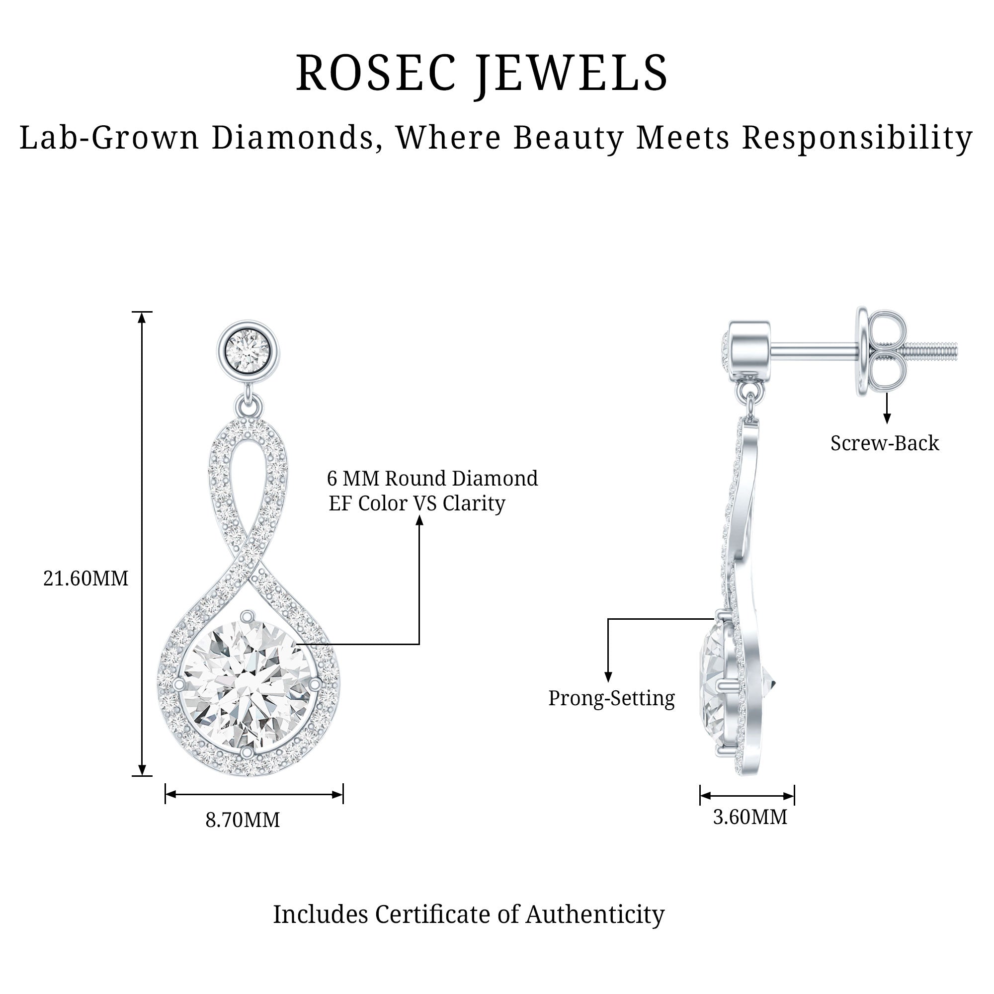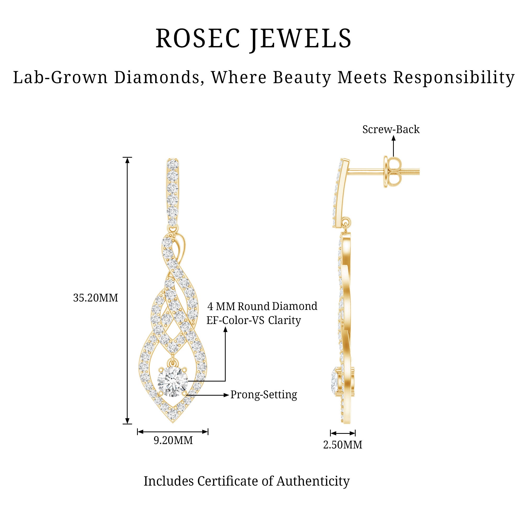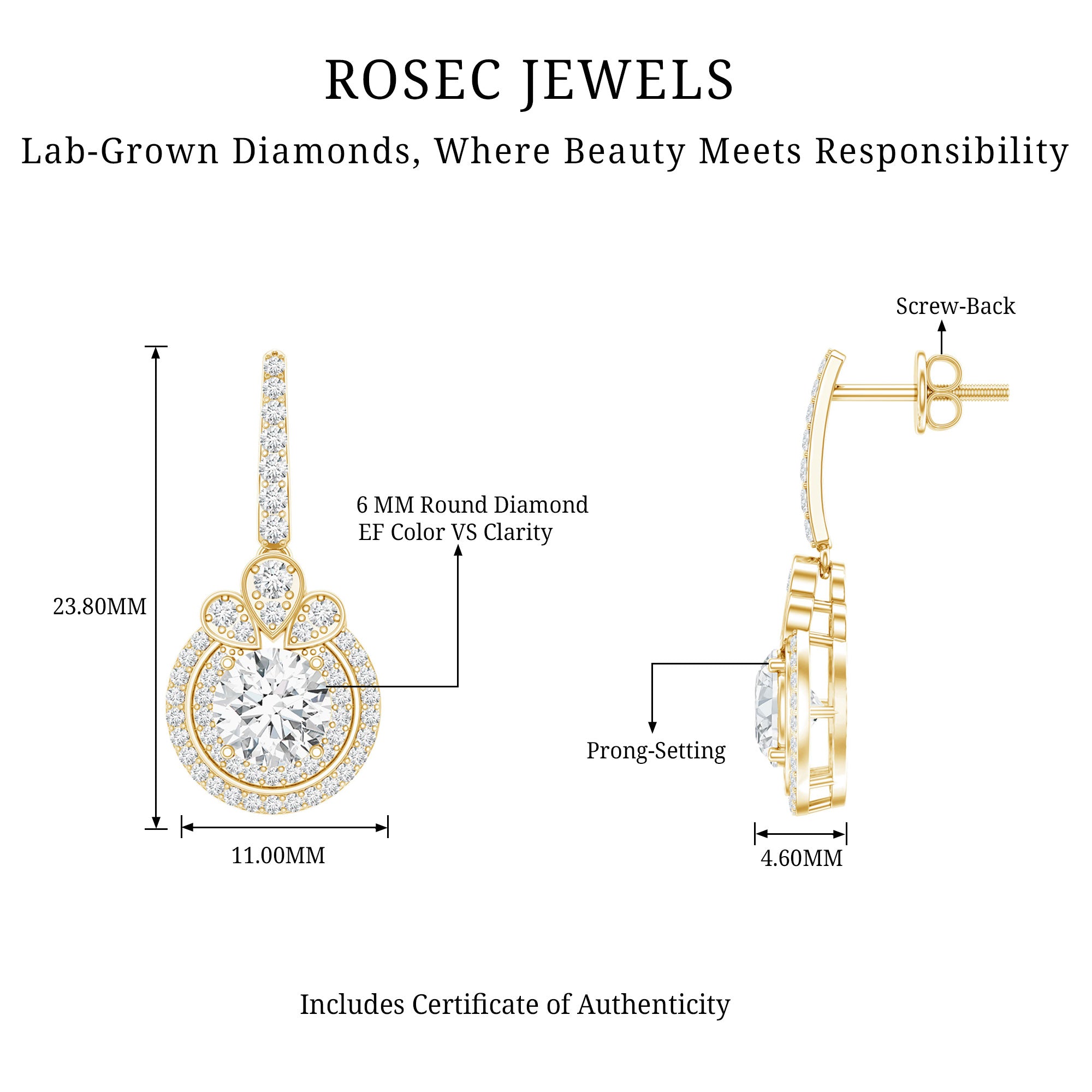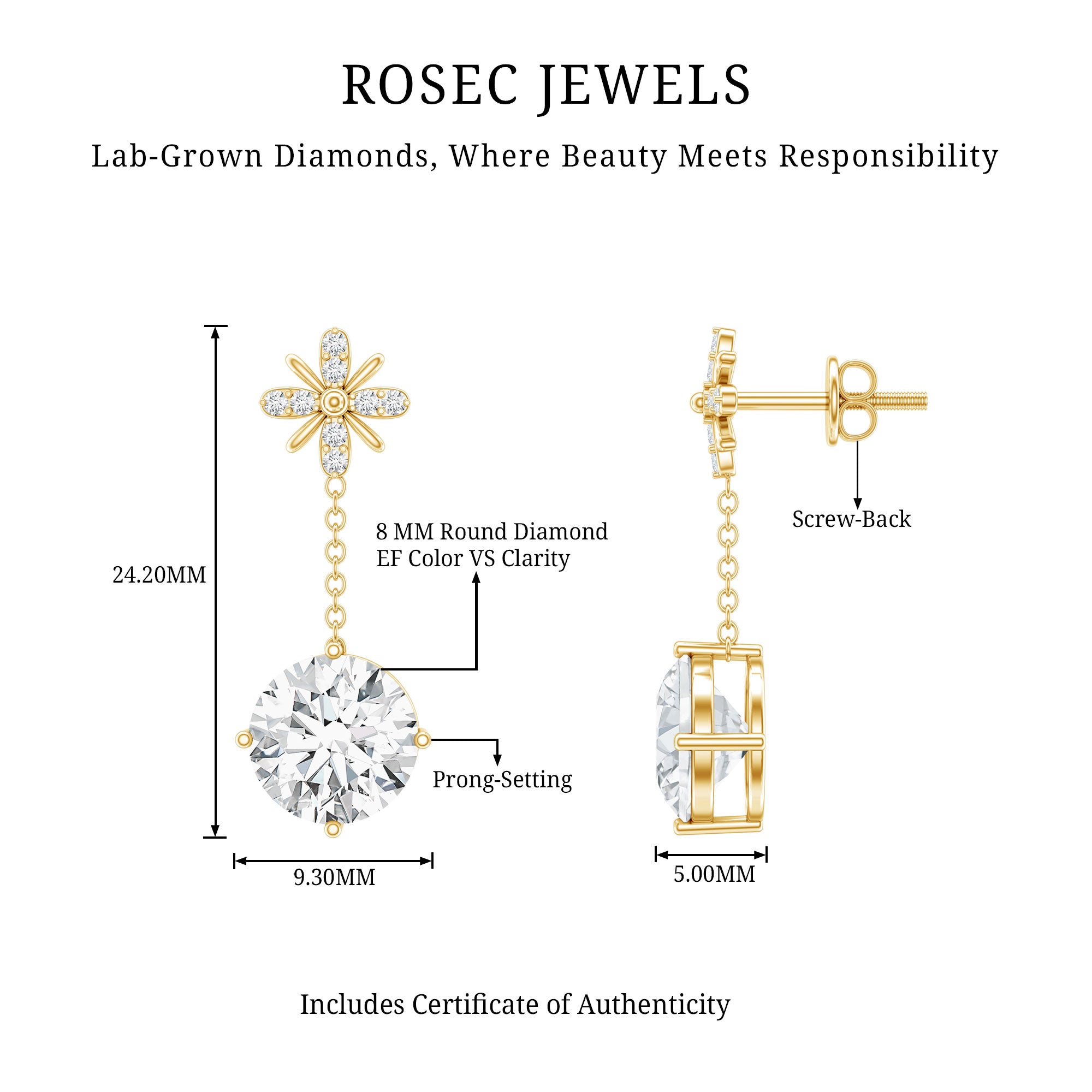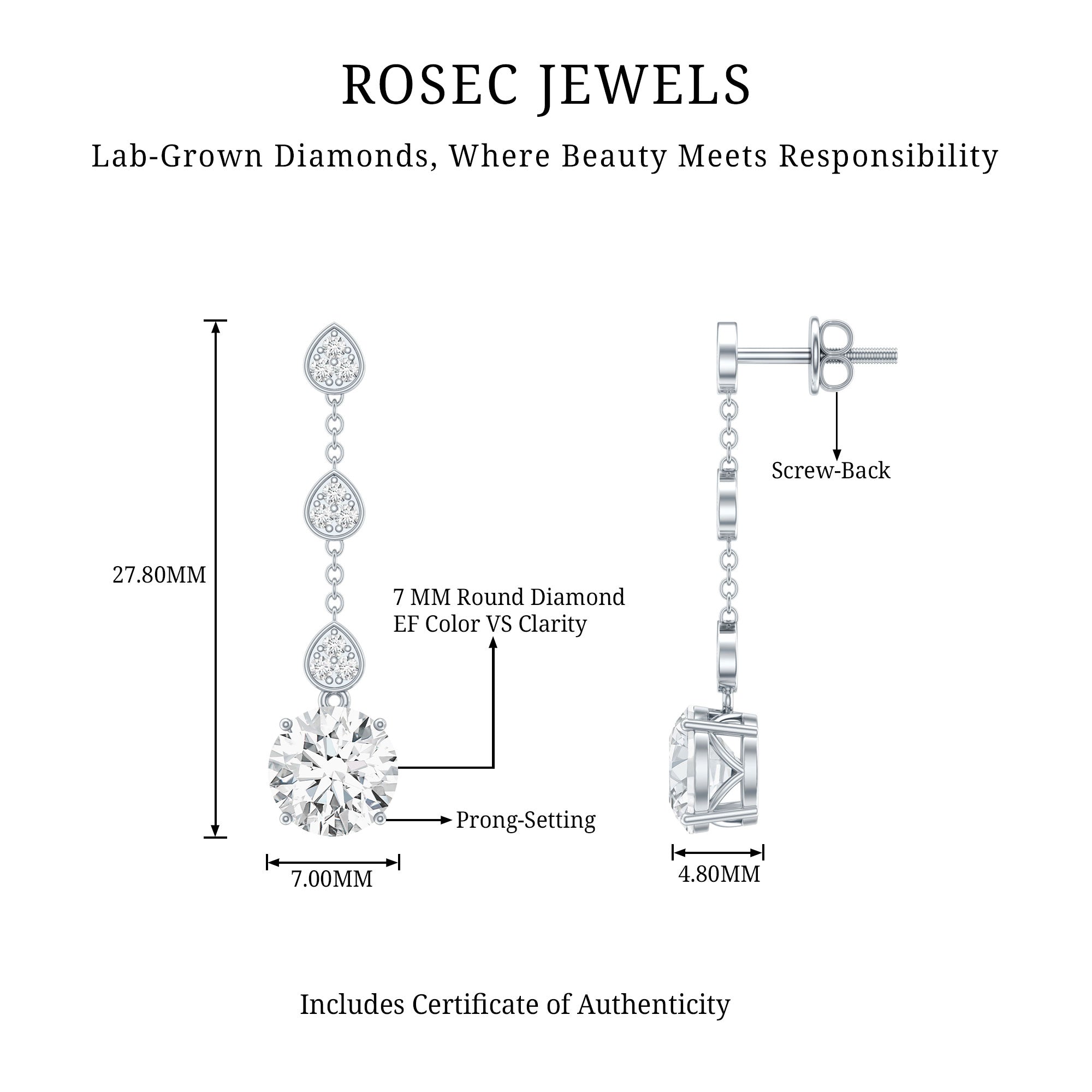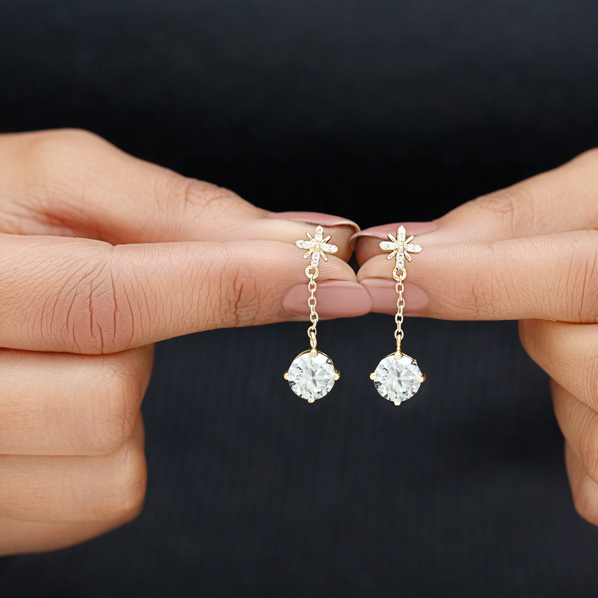 Drop earrings usually hang under an inch to a few inches in length, below the earlobe. The shorter lab grown diamond drops are usually preferred for casual occasions, while longer styles make a striking statement for formal events.