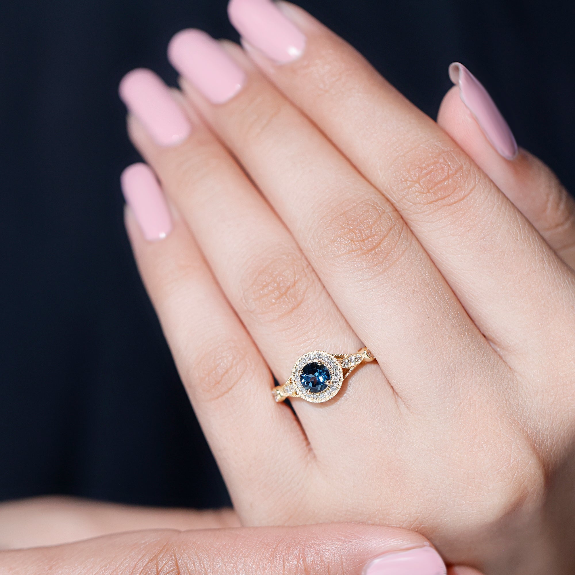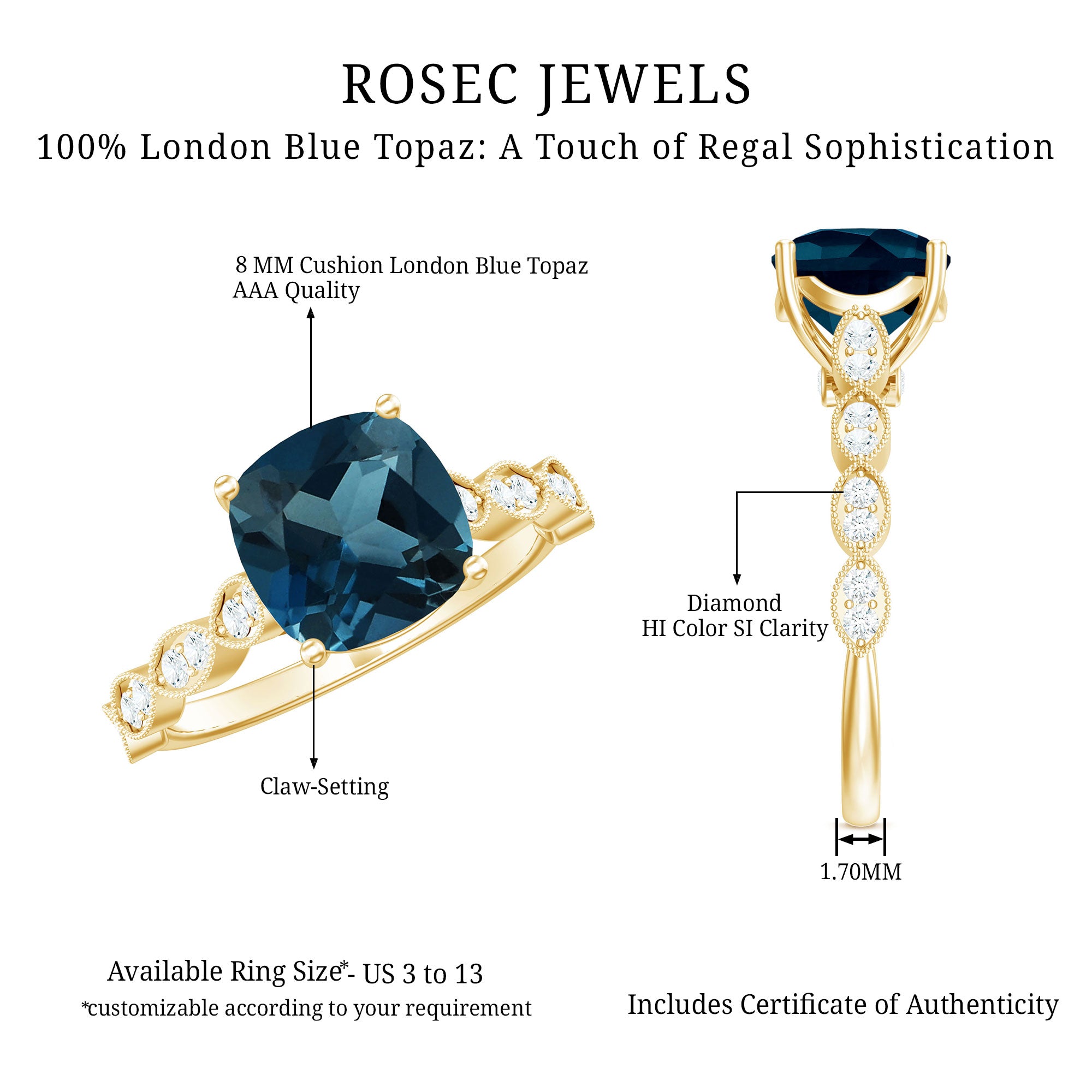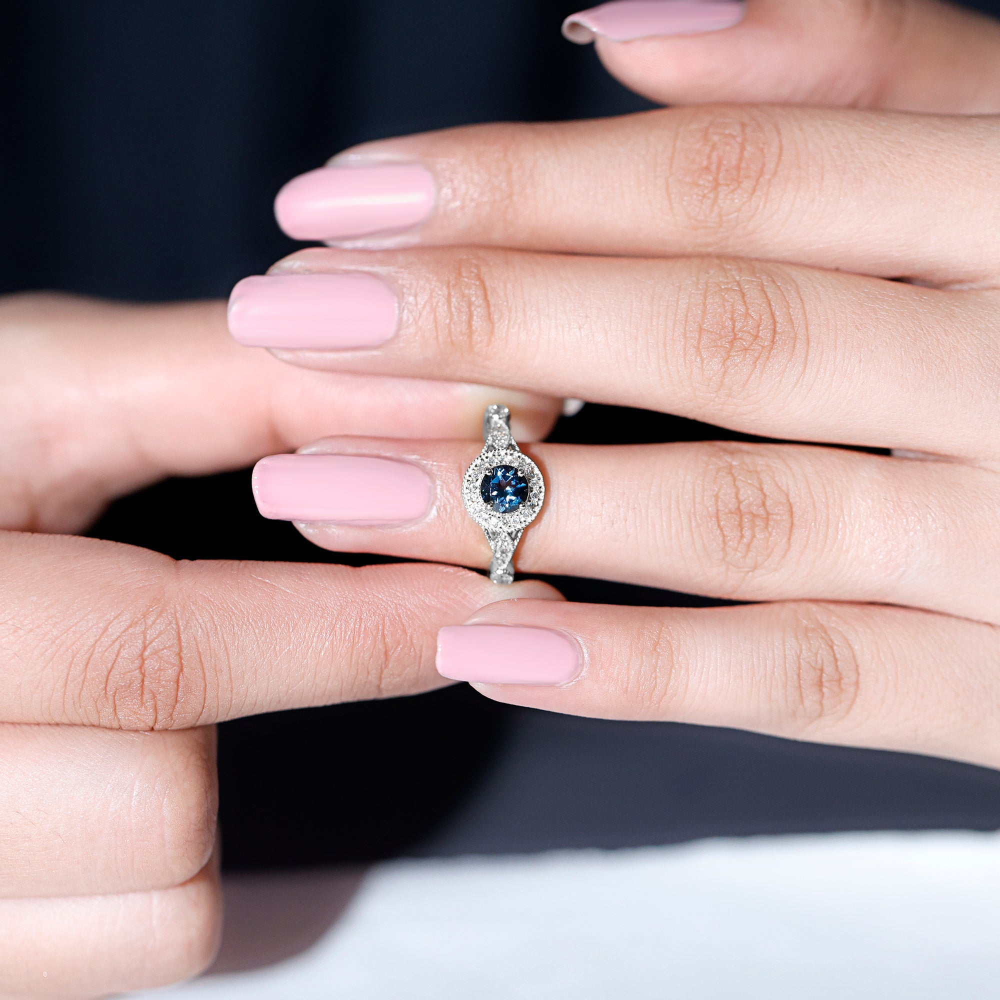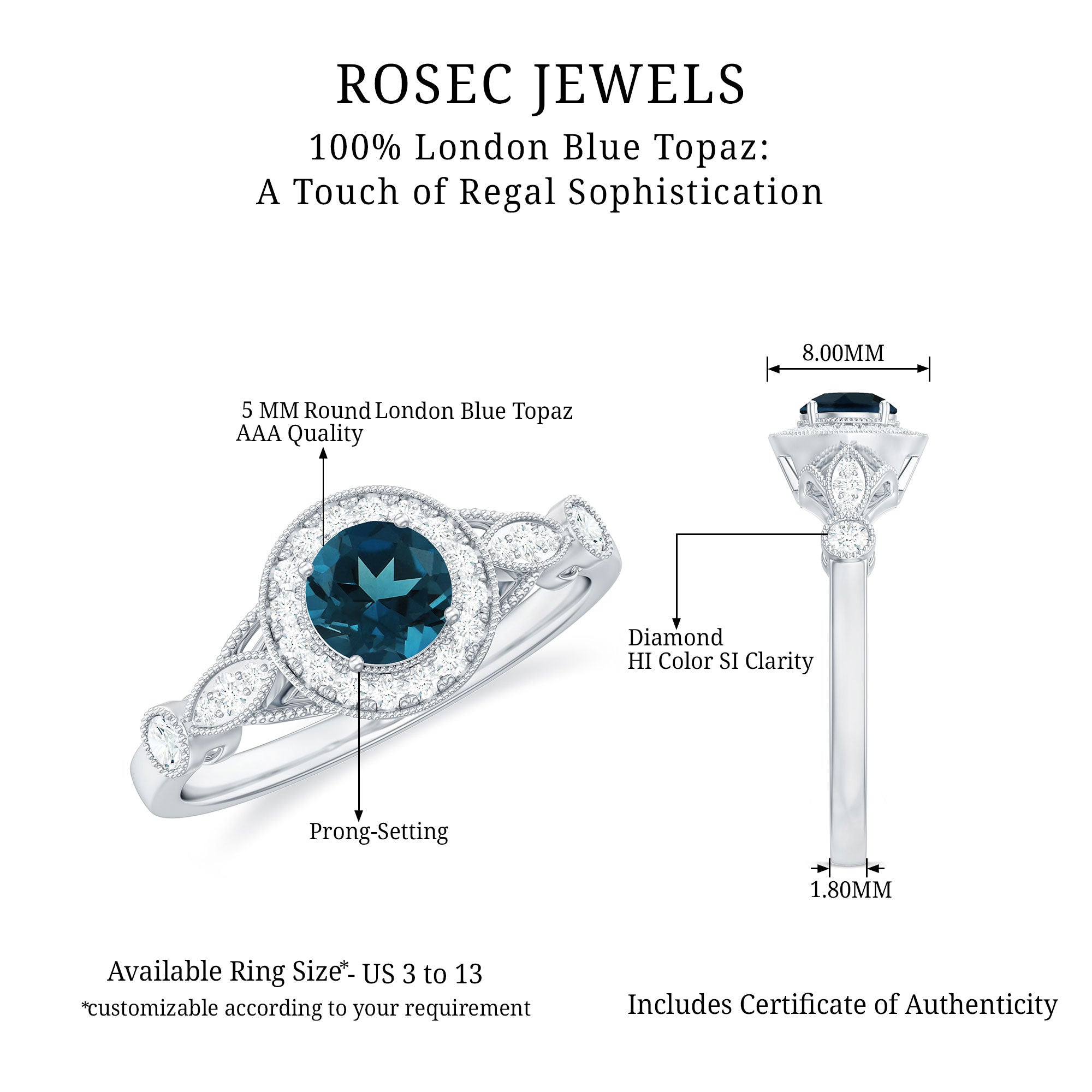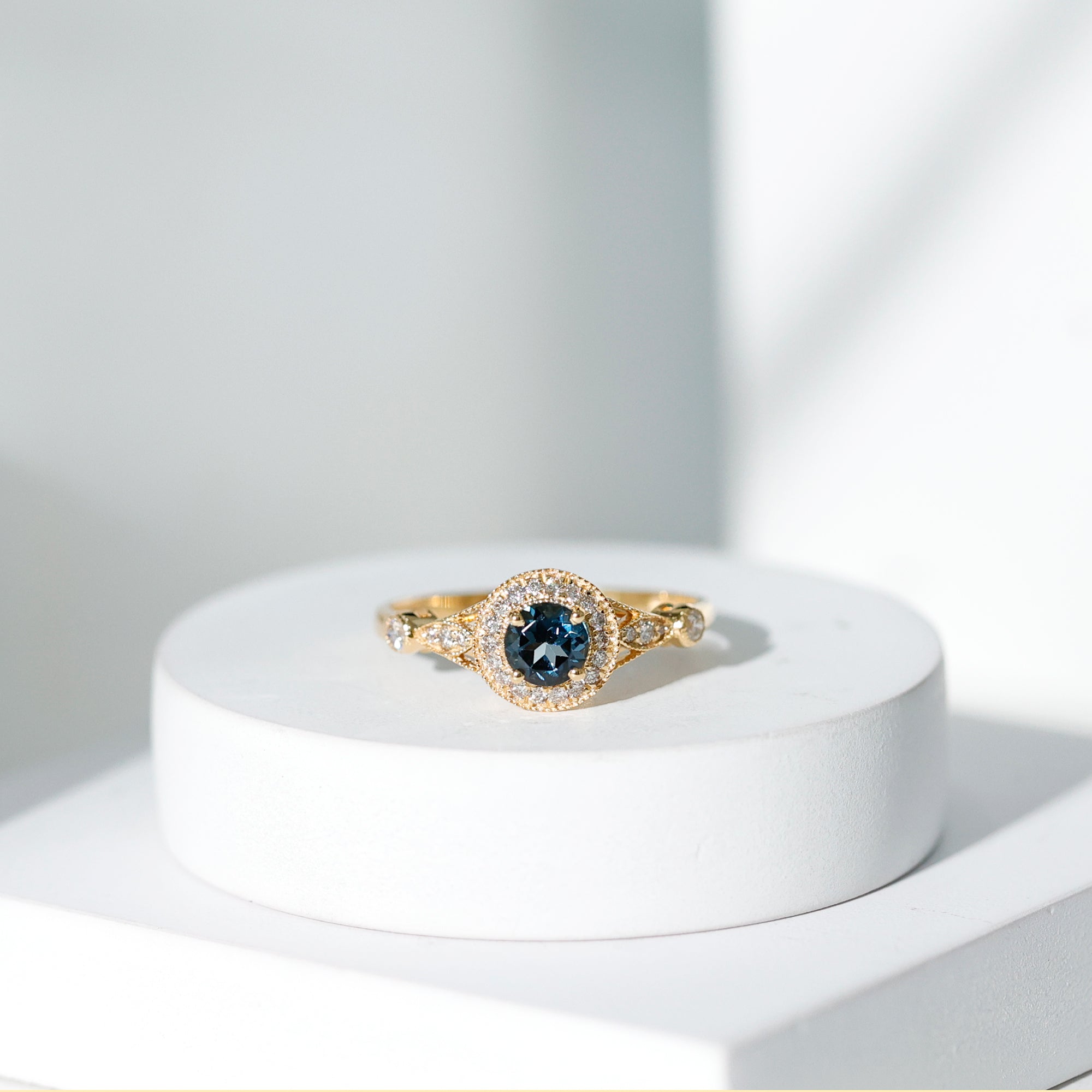 This style of engagement ring stands out unique due to its artistic elegance and nostalgic vibe, drawing inspiration from the classic Art Deco Victorian Eras and Edwardian eras. Our London blue topaz vintage-inspired rings highlight intricate details such as milgran and filigree along with abstract geometric patterns and historic engravings, making the best timeless charming accessory that offers an antique feel. The London Blue Topaz is graced by vintage design, making it a perfect ring for those couples who are inspired by old-school romance.