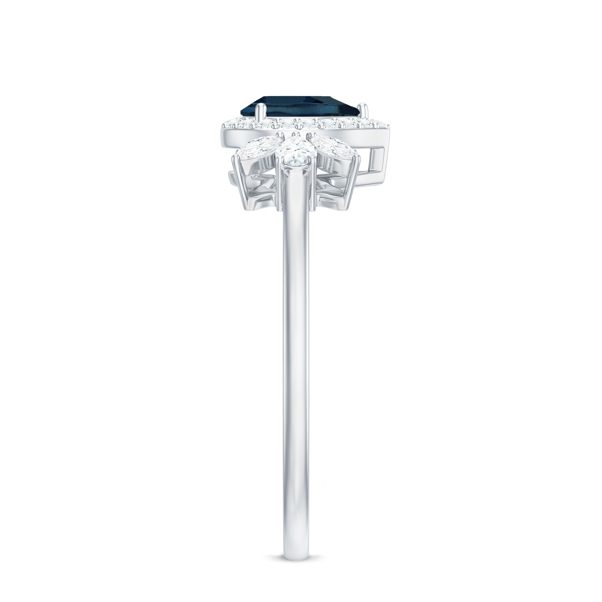 Our London blue topaz engagement ring graced by nature-inspired design is unique and inspired by the natural world. The floral, and leaf design enhances the beauty of the center stone, all are in perfect harmony. Precisely crafted, these London blue topaz nature-inspired rings are made to a high polish, and the natural design came out from a magical forest. These rings are available in white gold, and yellow gold precious metals, comfortable for everyday wear.