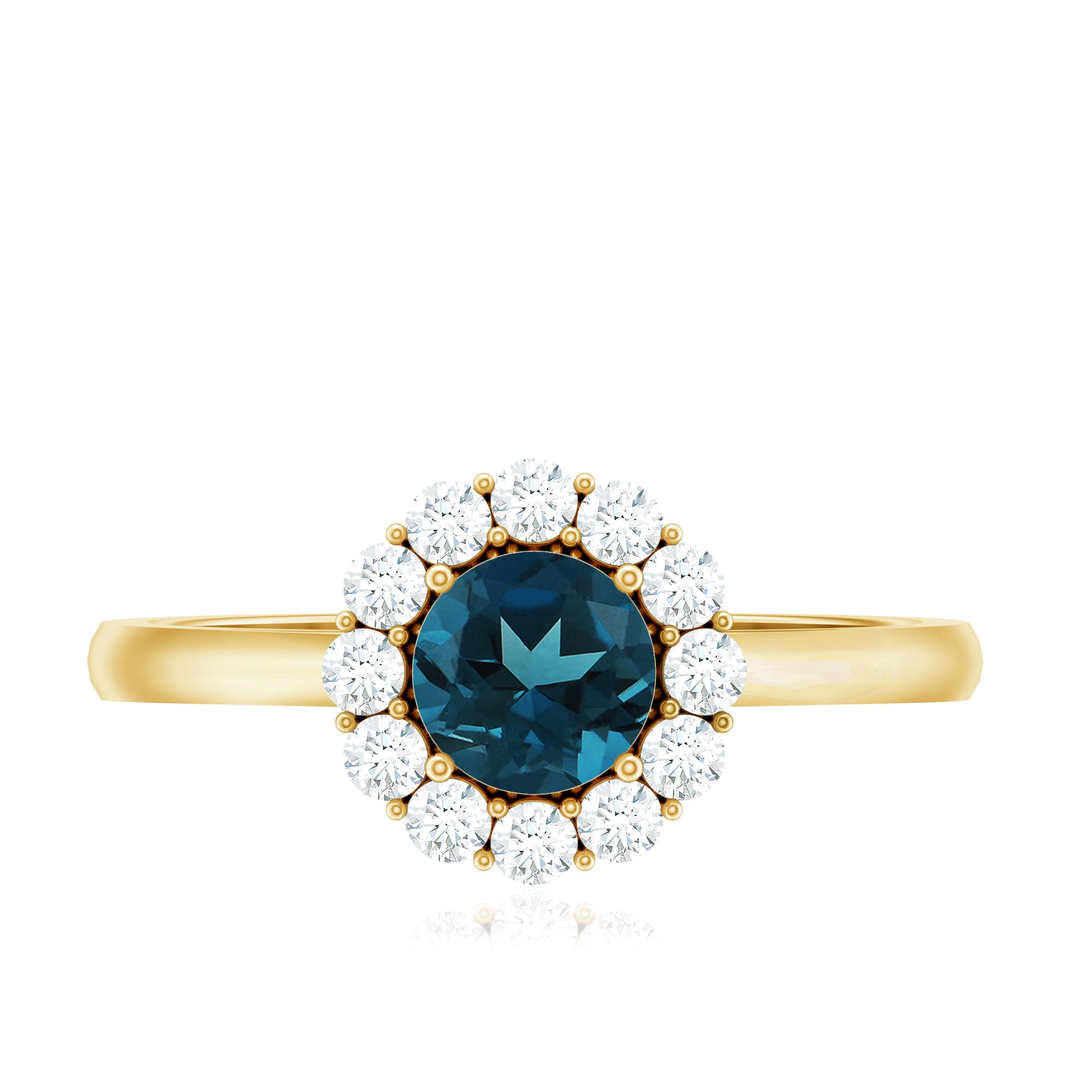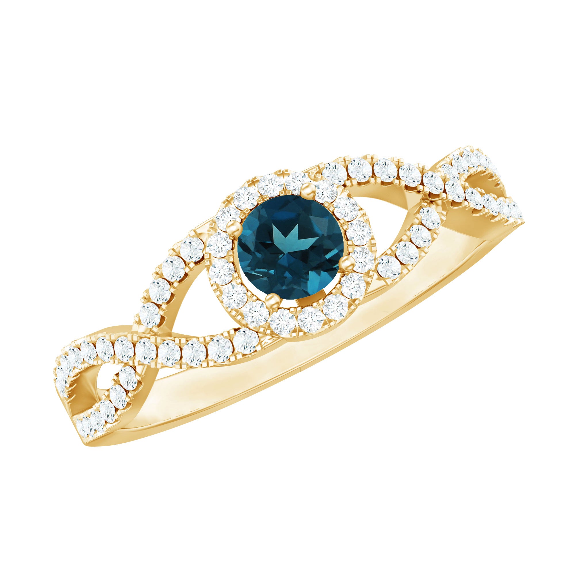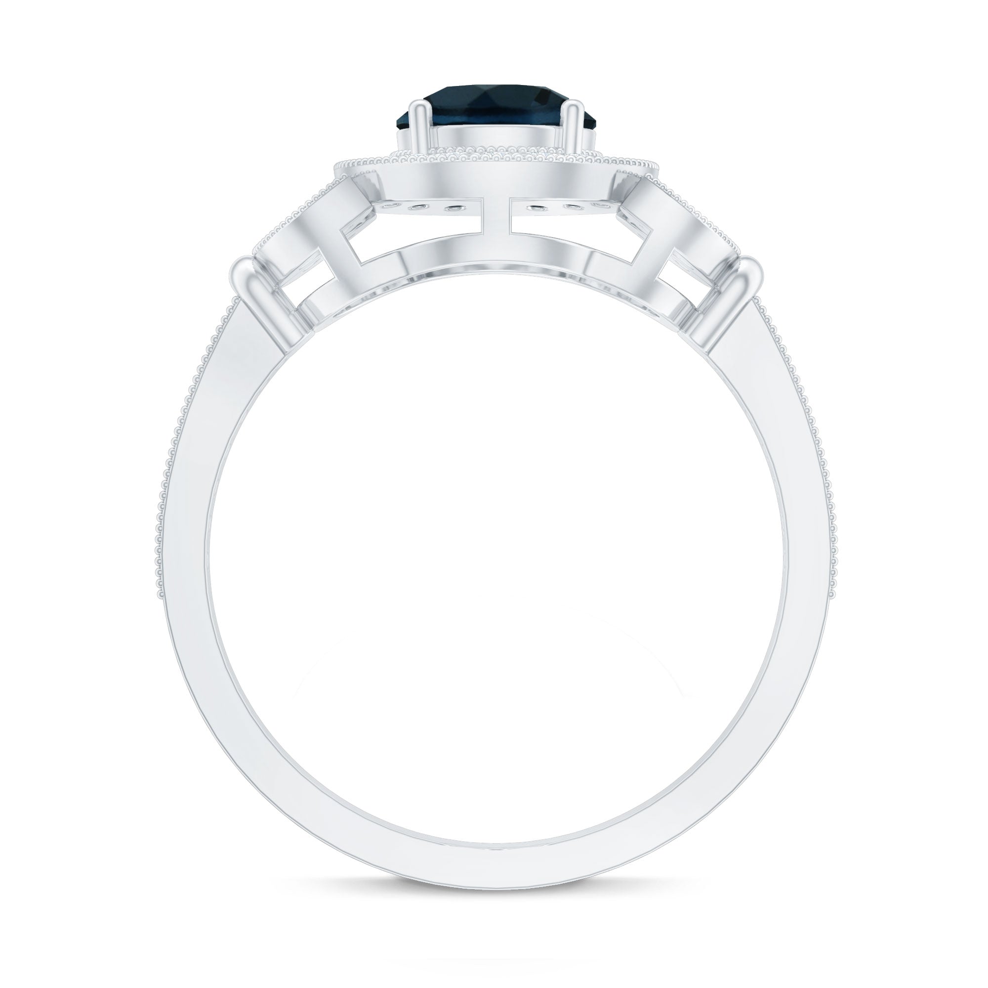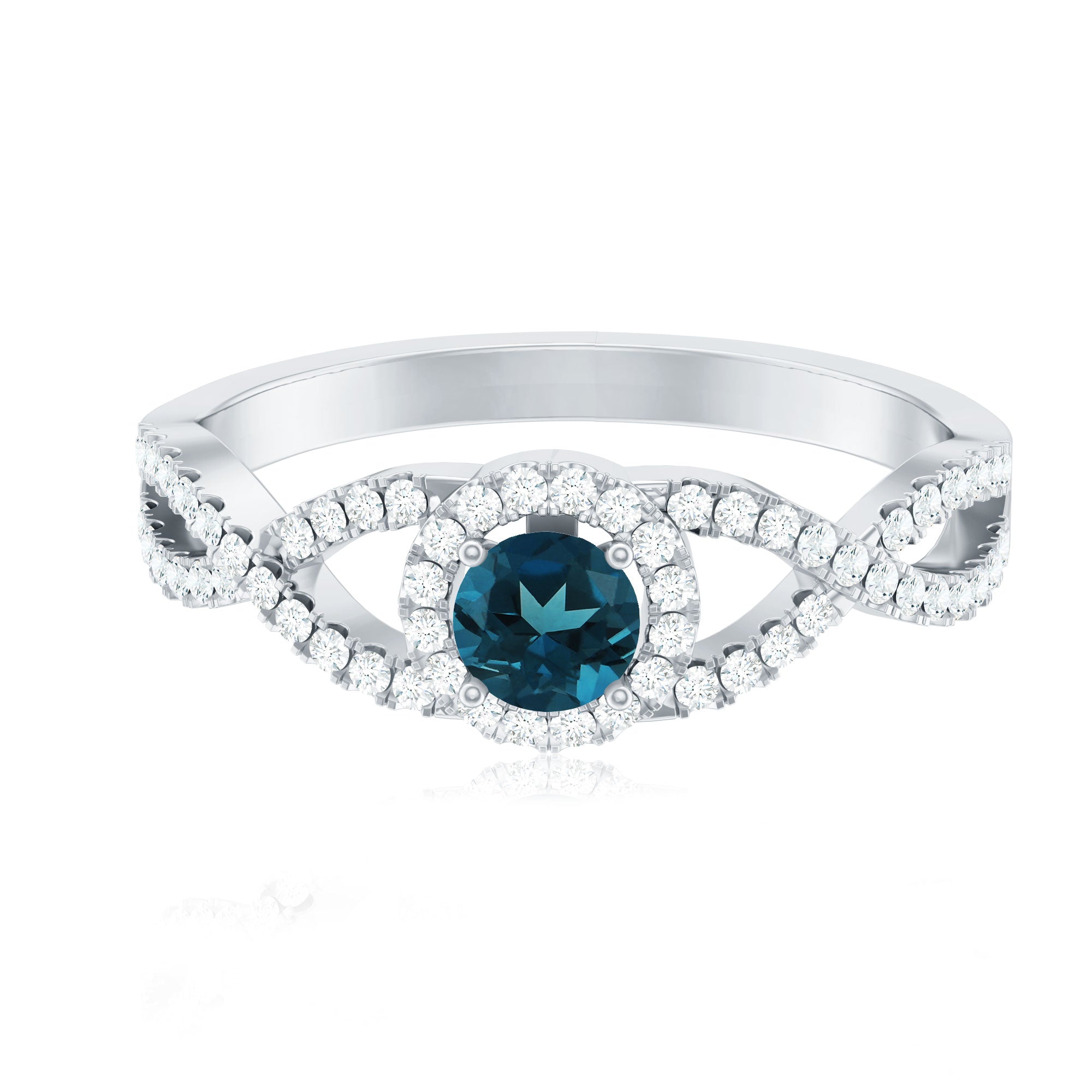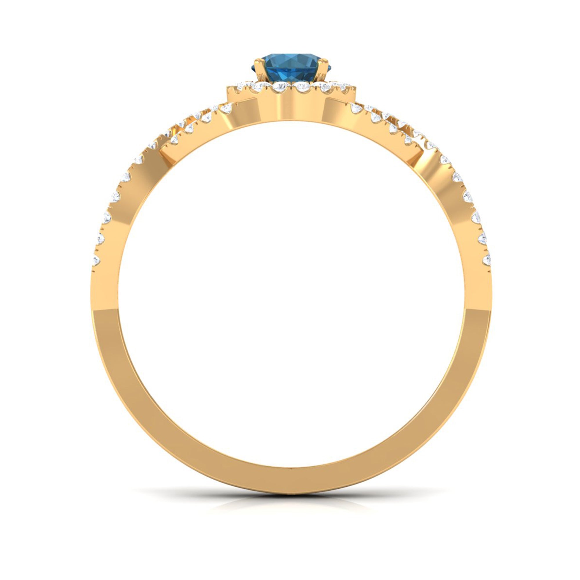 A unique and edgy take to the classic Solitaire style, the Center Stone of London Blue Topaz here is adorned by a shimmering row of Diamond/Moissanite all around. The Halo doesn’t just lend more character to the Blue Topaz Ring, but also deceives your eyes by making your Topaz appear slightly bigger in size. It is the go-to style for those who fancy a London Blue Topaz and Diamond Ring.