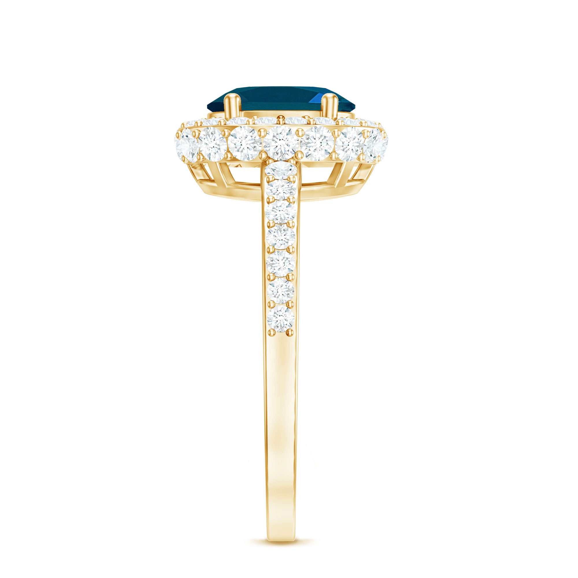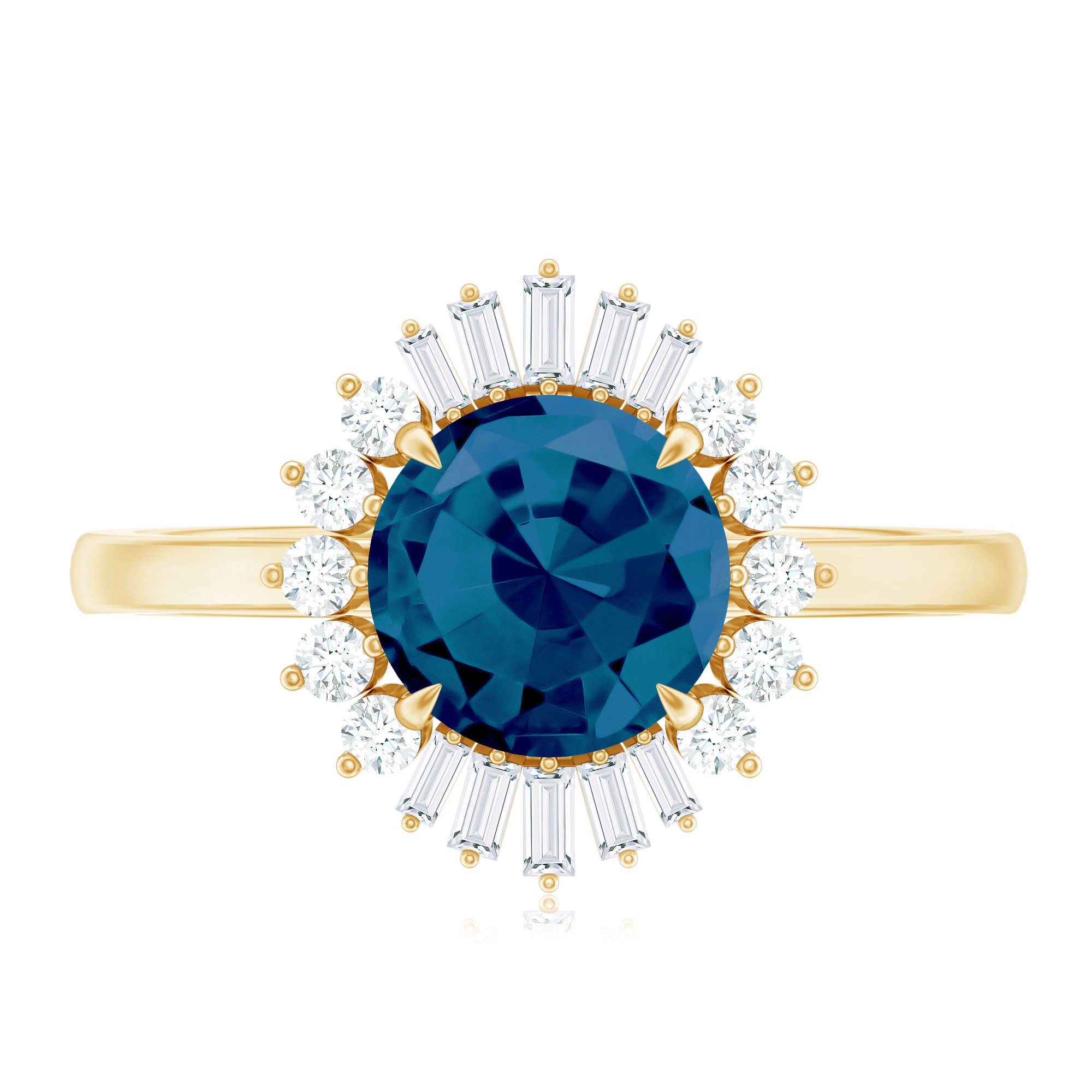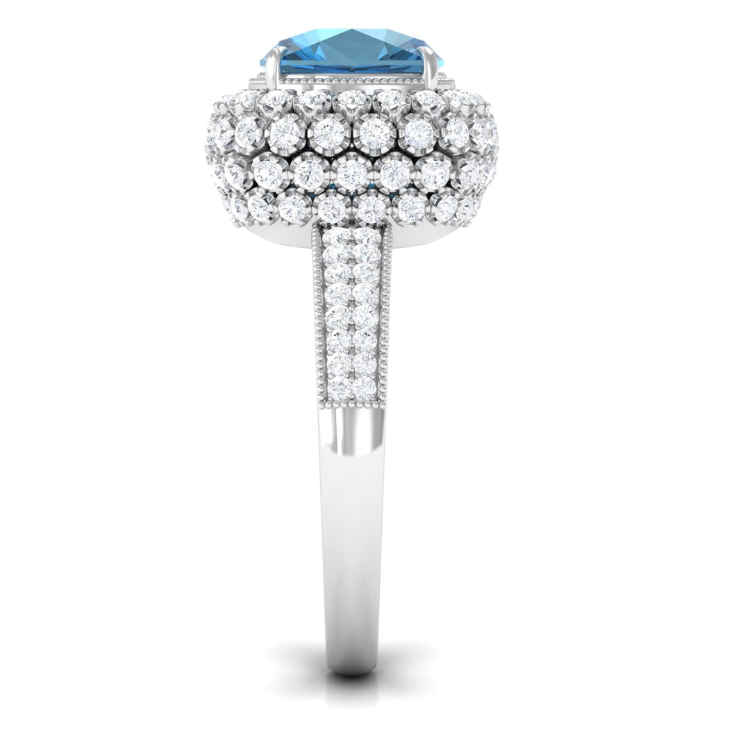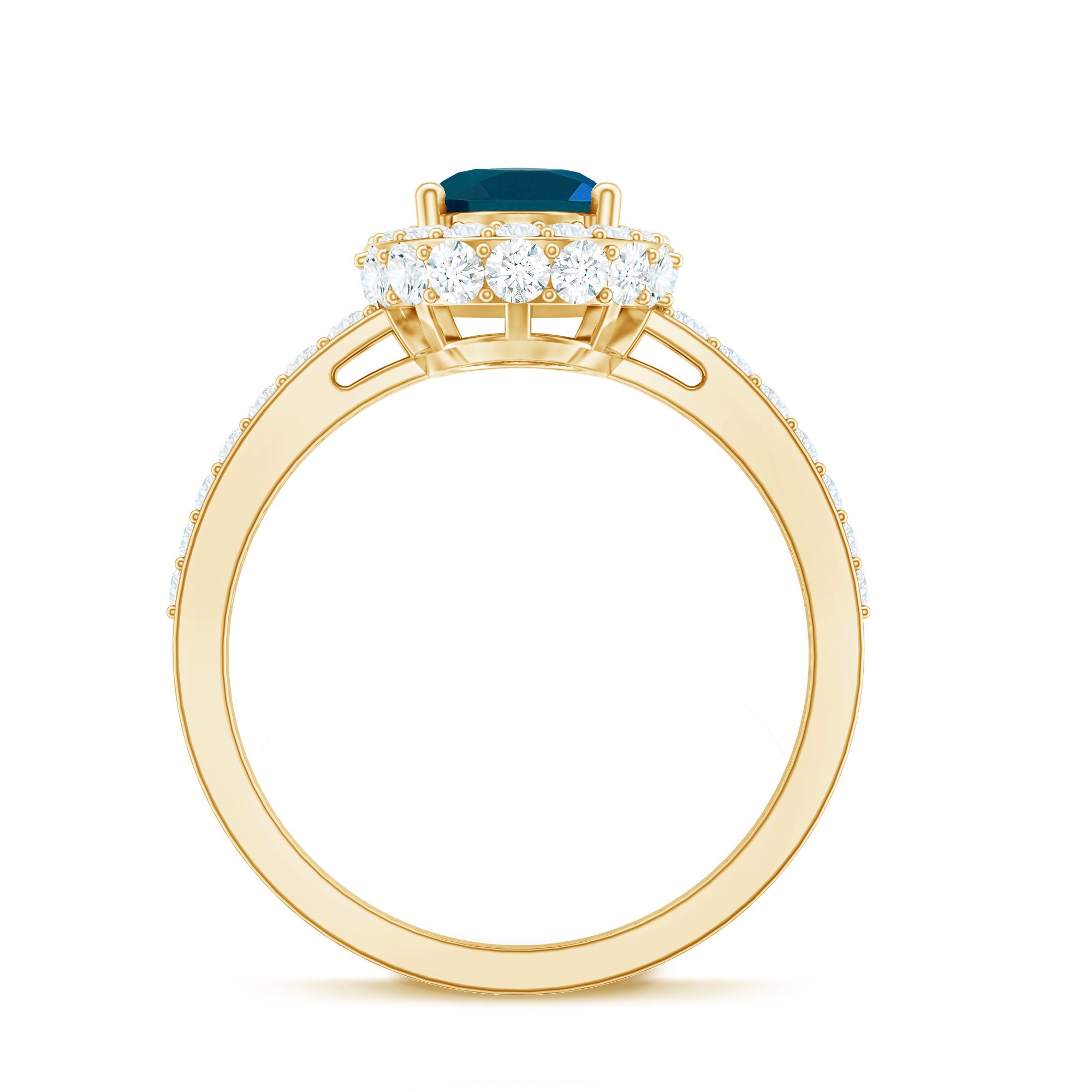 A unique and edgy take to the classic Solitaire style, the Center Stone of London Blue Topaz here is adorned by a shimmering row of Diamond/Moissanite all around. The Halo doesn’t just lend more character to the Blue Topaz Ring, but also deceives your eyes by making your Topaz appear slightly bigger in size. It is the go-to style for those who fancy a London Blue Topaz and Diamond Ring.