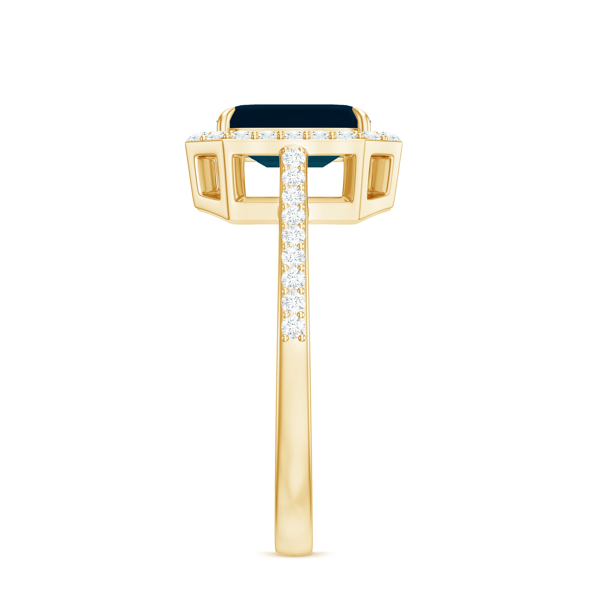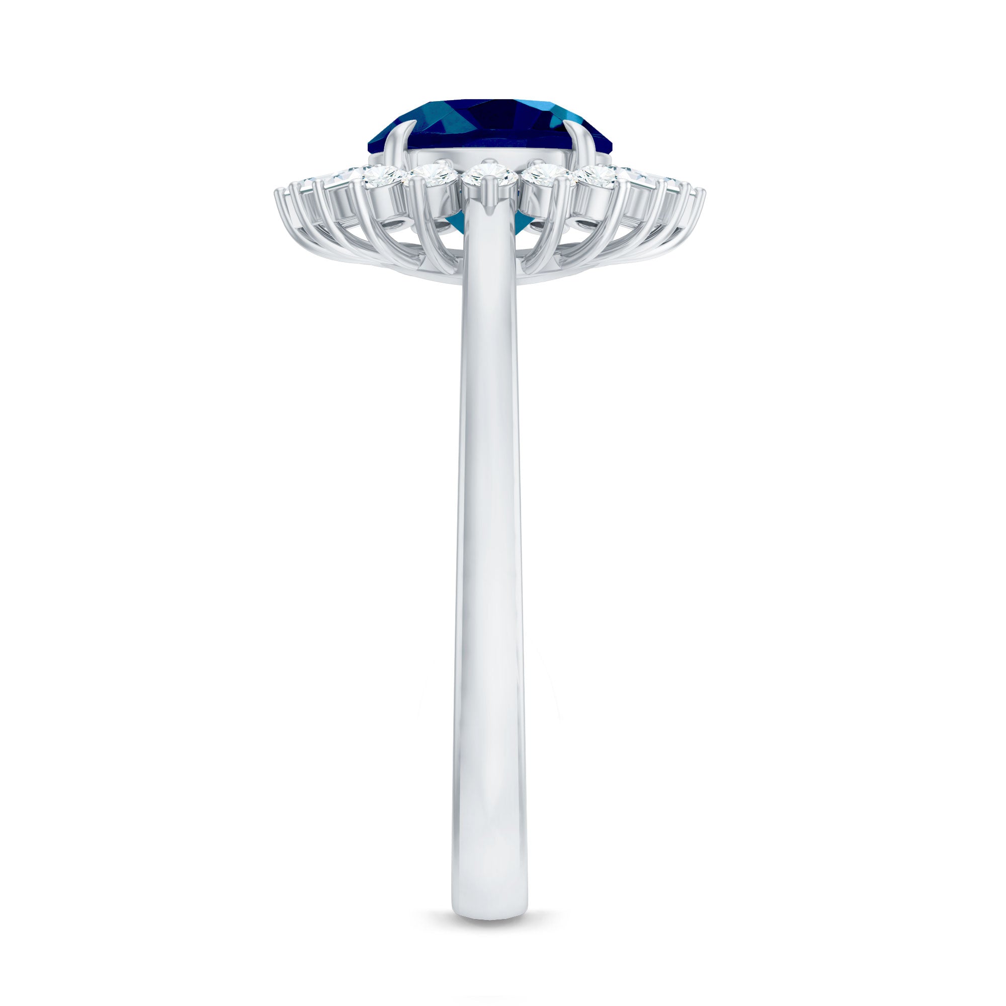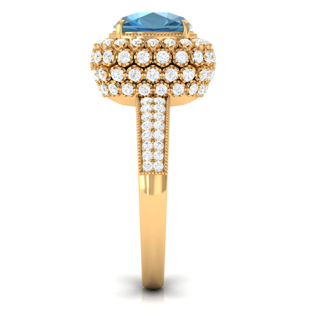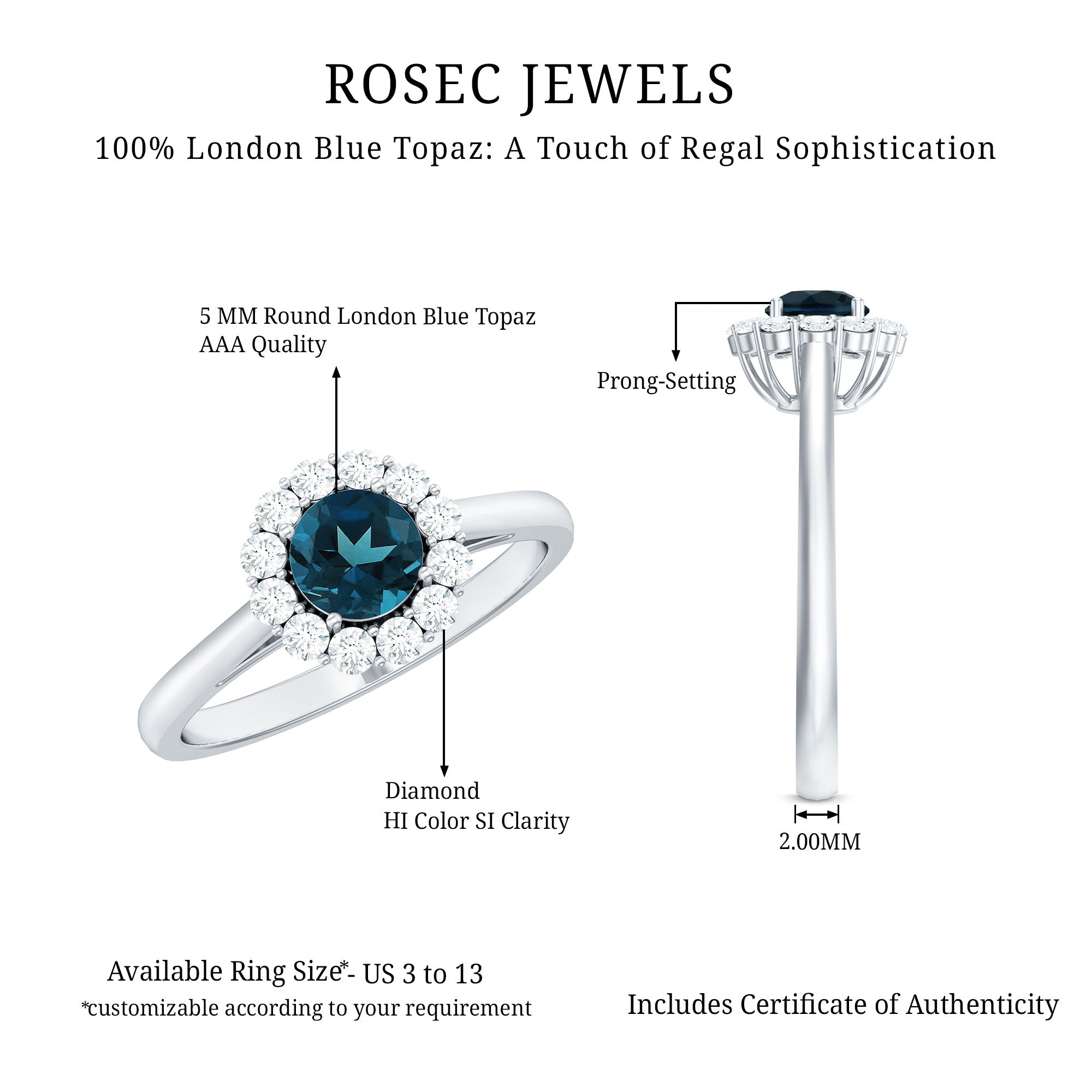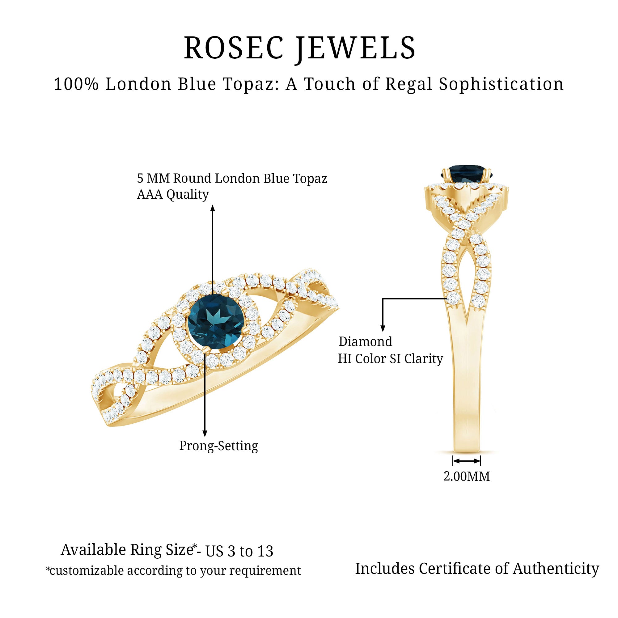 A unique and edgy take to the classic Solitaire style, the Center Stone of London Blue Topaz here is adorned by a shimmering row of Diamond/Moissanite all around. The Halo doesn’t just lend more character to the Blue Topaz Ring, but also deceives your eyes by making your Topaz appear slightly bigger in size. It is the go-to style for those who fancy a London Blue Topaz and Diamond Ring.