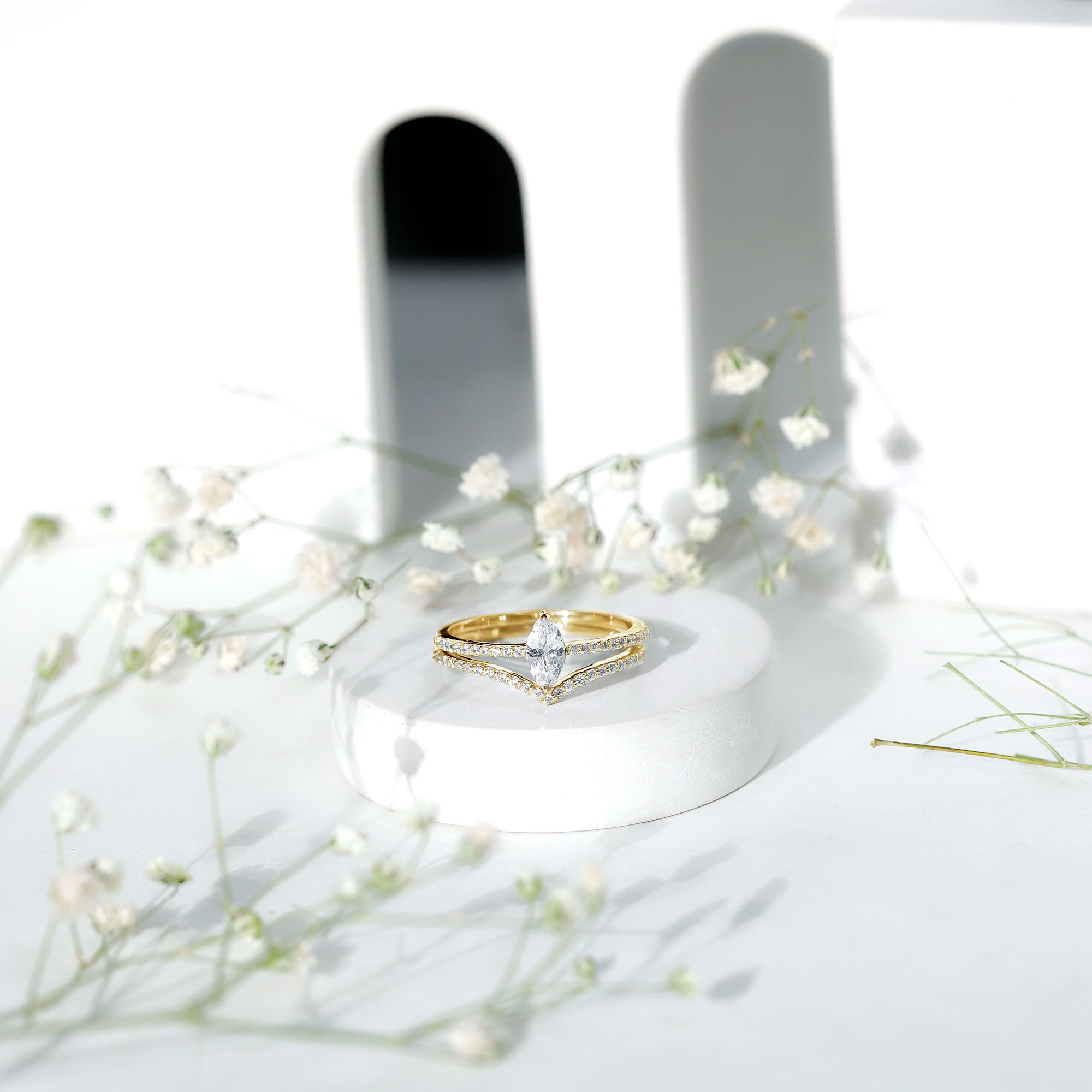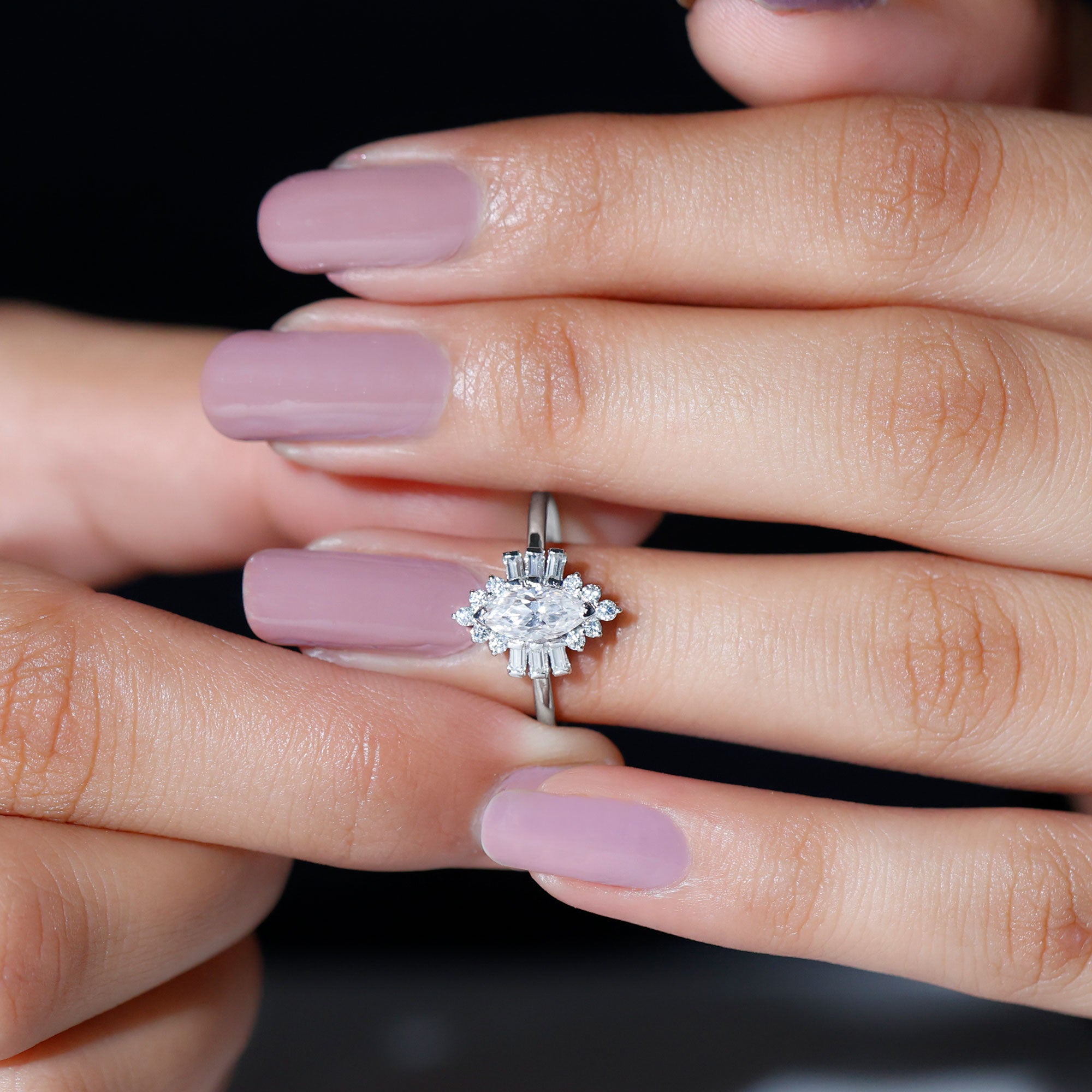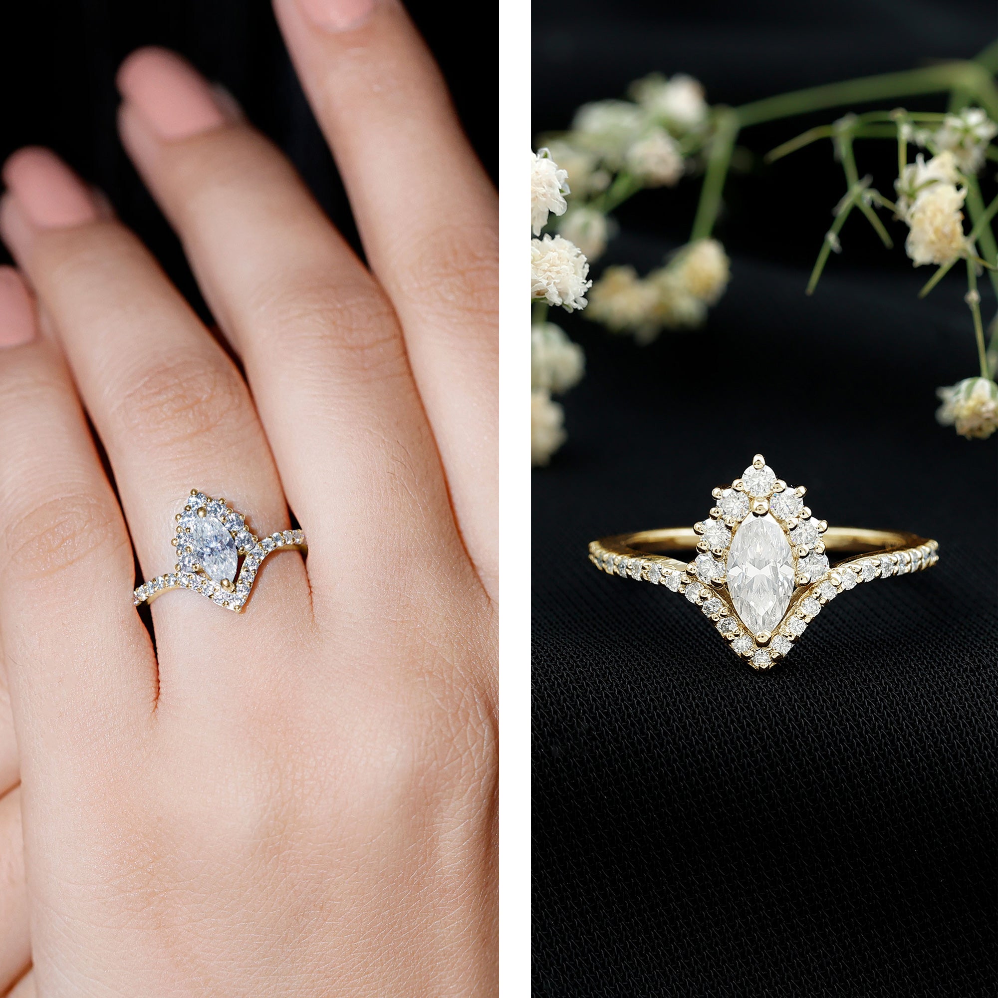 The fragile tips of marquise rings make it vulnerable to damages. So it's important to choose a setting wisely. Bezel, bar, pave and channel settings can be considered for marquise wedding rings, if you are choosing them for day to day wear. Prong or halo settings are preferred for good sparkle and brilliance.
