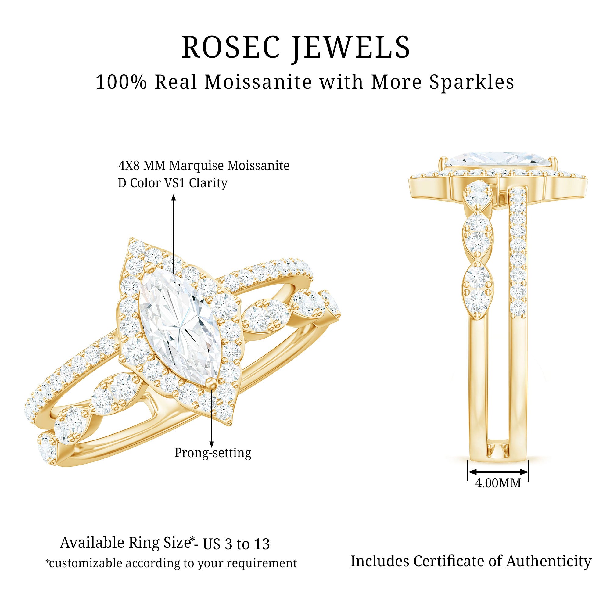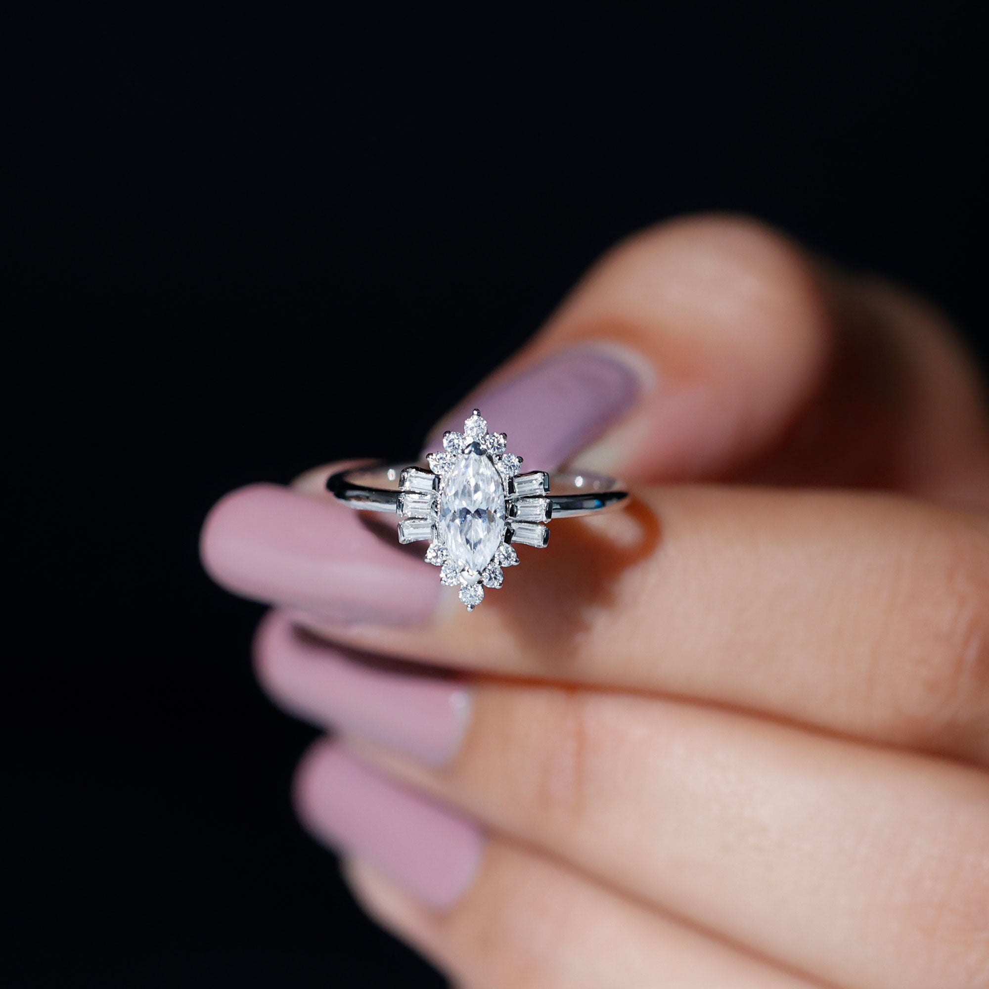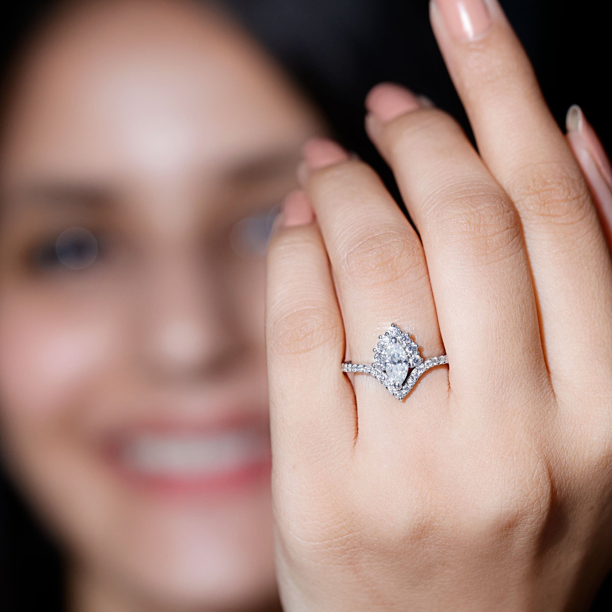 The fragile tips of marquise rings make it vulnerable to damages. So it's important to choose a setting wisely. Bezel, bar, pave and channel settings can be considered for marquise wedding rings, if you are choosing them for day to day wear. Prong or halo settings are preferred for good sparkle and brilliance.