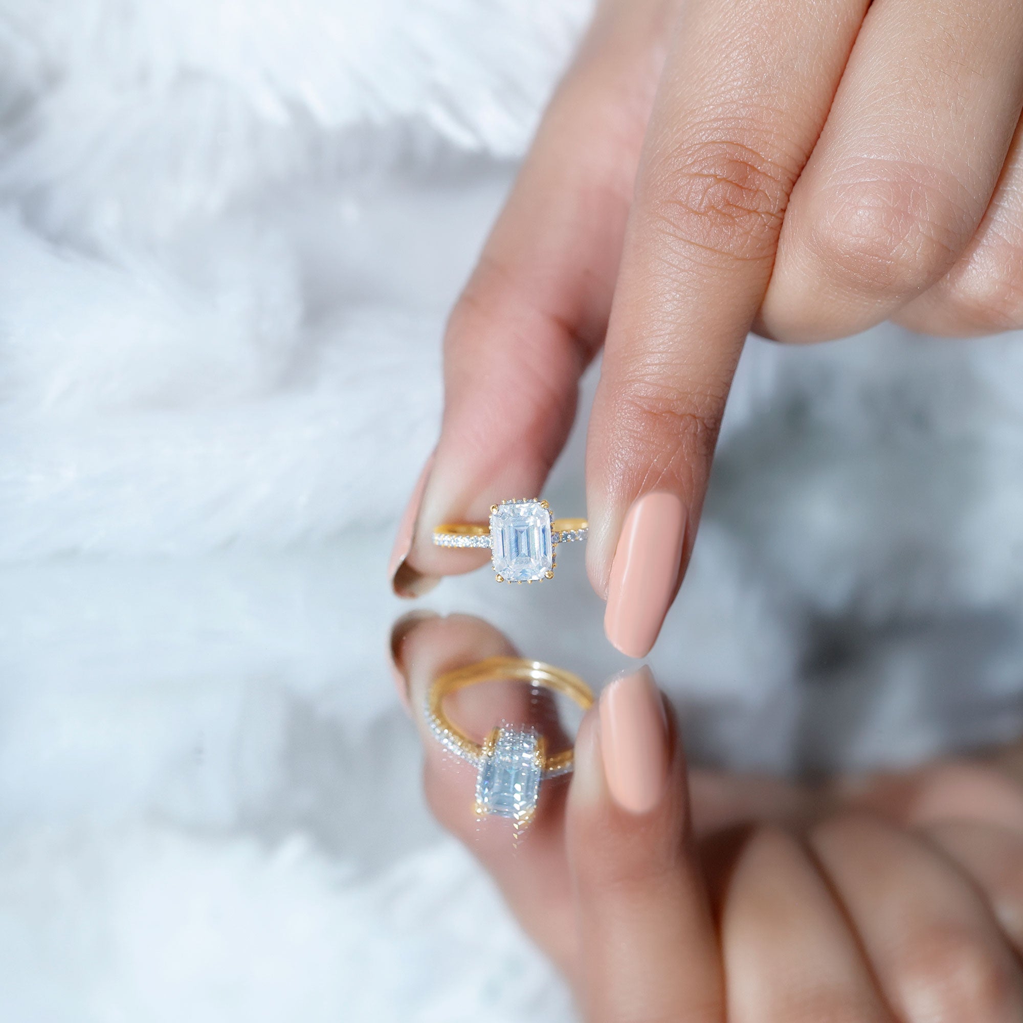 In the simplest terms, an Emerald Cut is characterized by a rectangular shape that stands out with cut-off beveled corners, thus exuding a vintage yet sophisticated aesthetic. On a more technical note, Moissanite Emerald Cut Engagement Rings are home to 57 step-like horizontal facets, a flat table, and long lines that (similar to the Asscher Cut) give off a hall of mirrors effect.