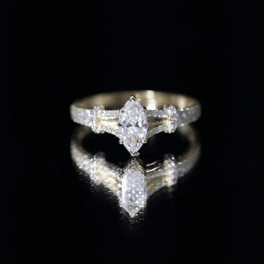 Hailed as a standout for its unique and fancy aesthetic, a Marquise Moissanite Engagement Ring features pointy ends and curved sides (making it look close to a football). Featuring 58 facets, it appeals with its unique bow-tie effect (that you’ll notice at the center of the Moissanite).