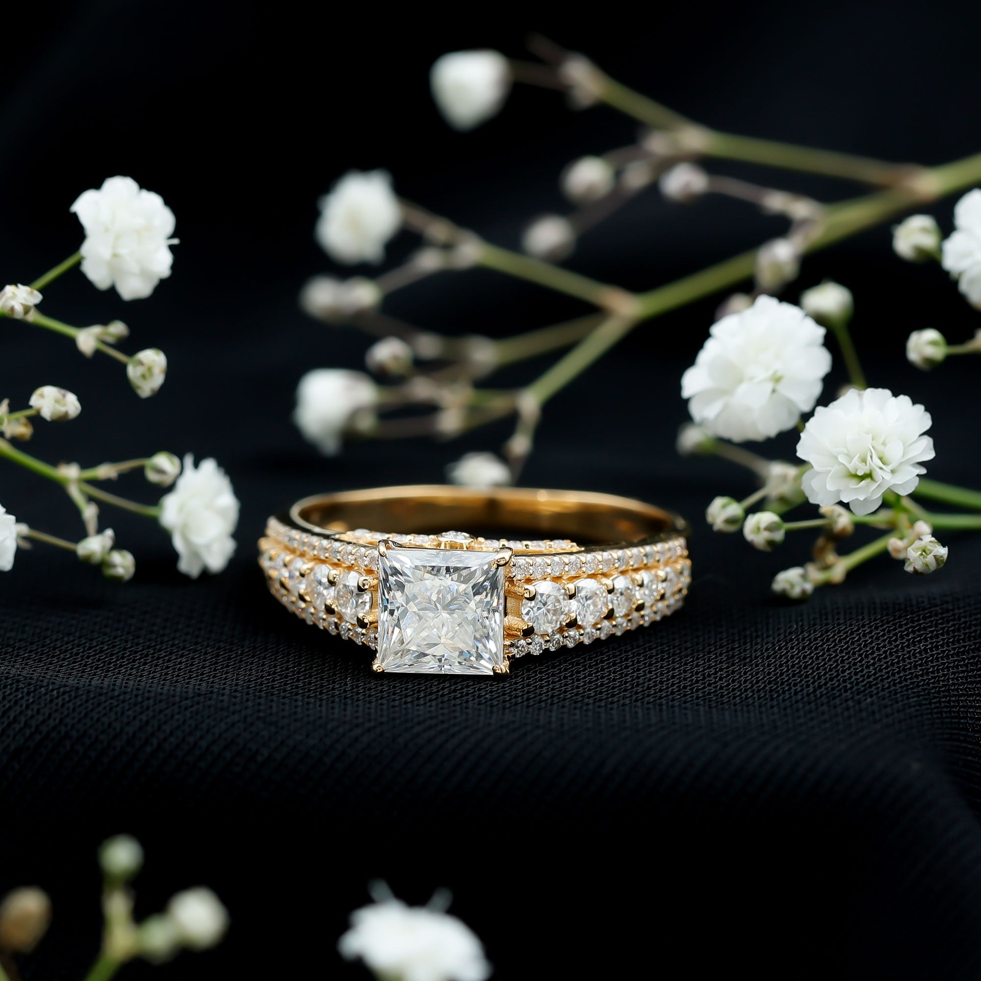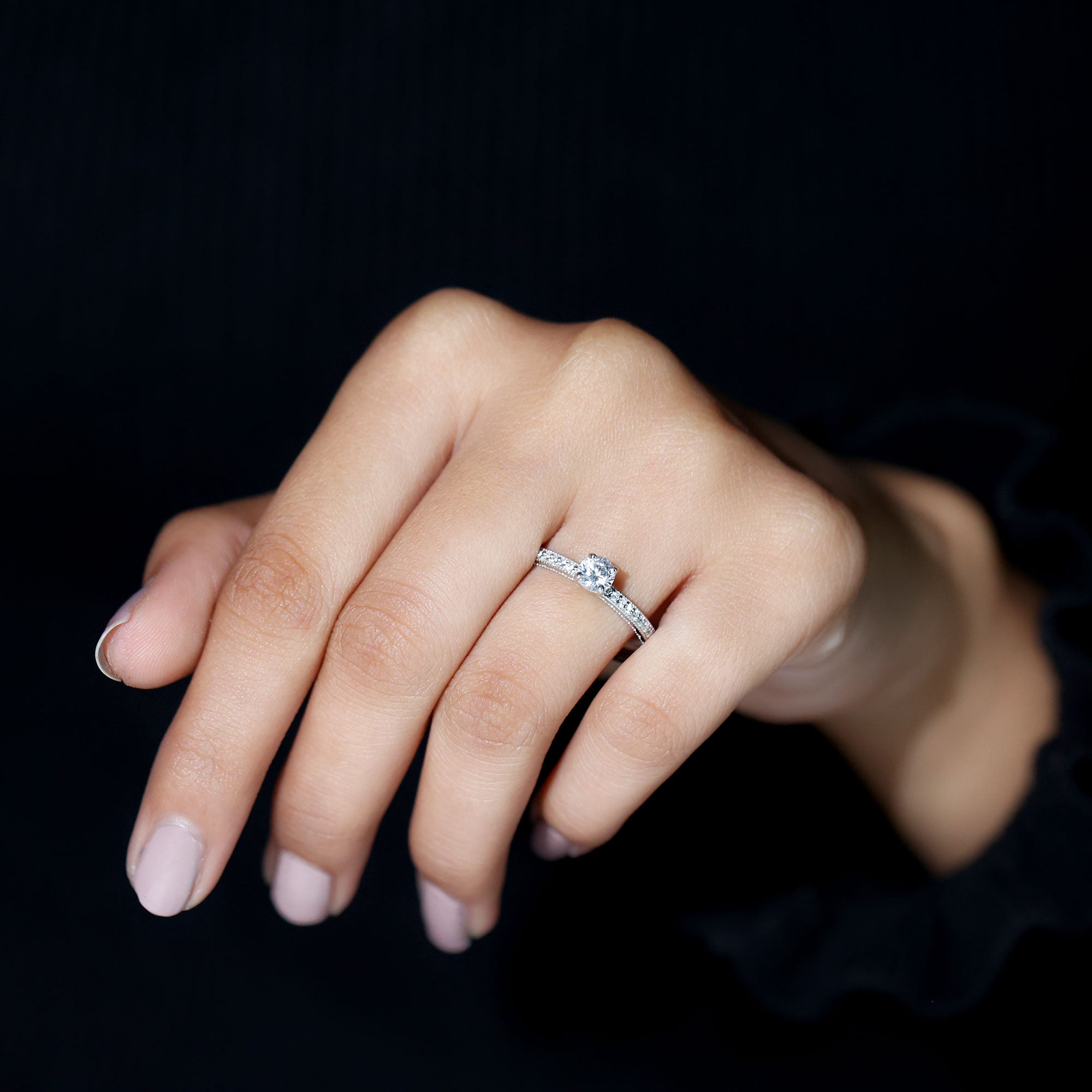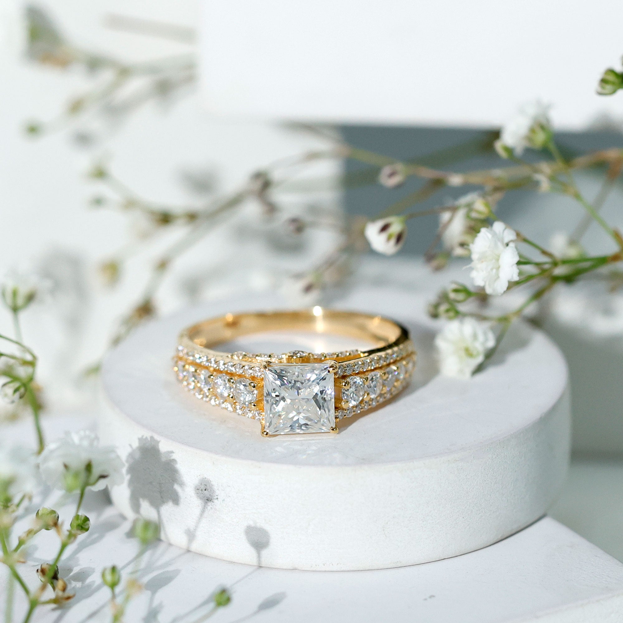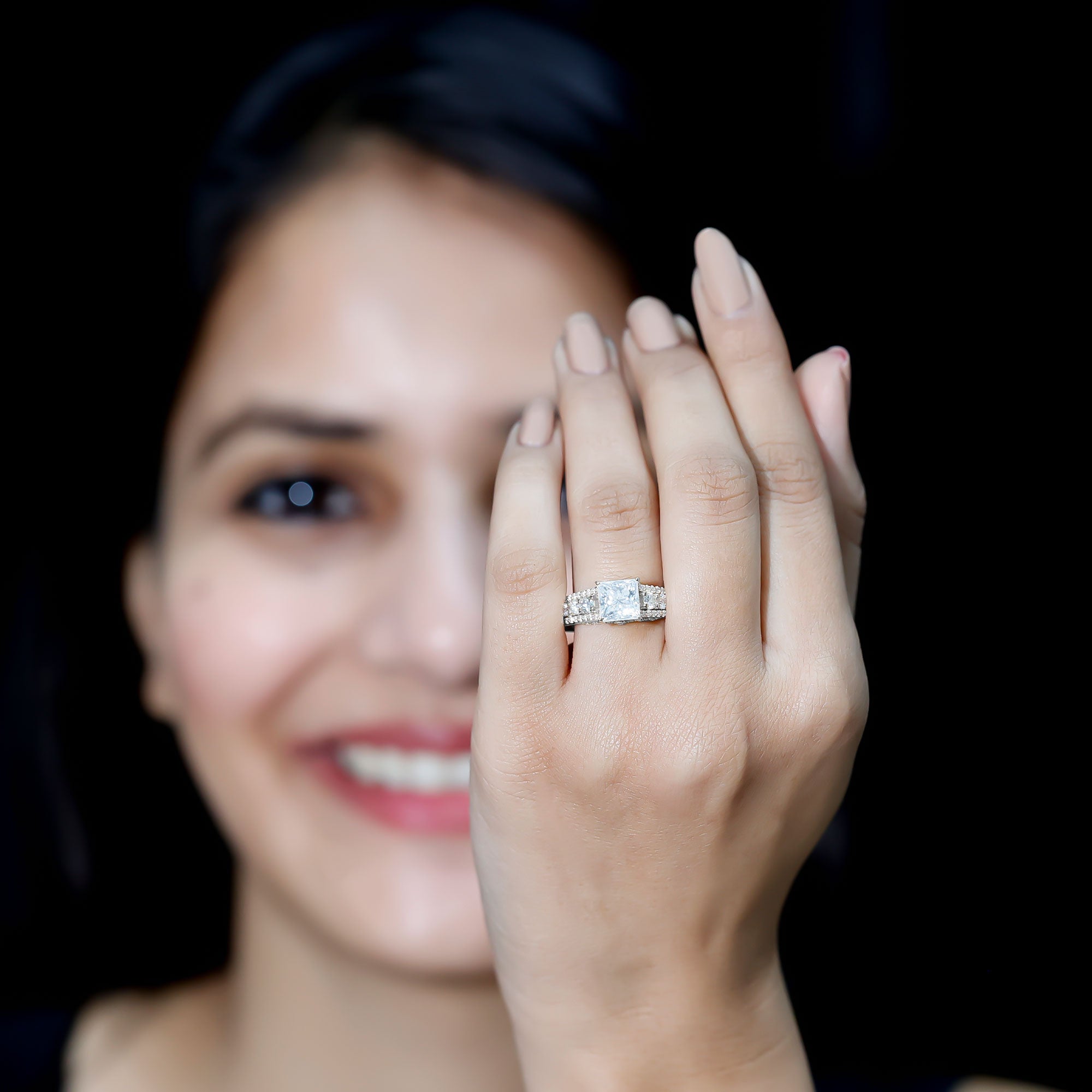 Moissanite and diamond engagement rings share a similar luxurious appearance, but moissanite is known for producing even more fire and colorful sparkle in certain lighting conditions. Many couples choose moissanite because it offers exceptional brilliance while remaining significantly more affordable than traditional diamonds.