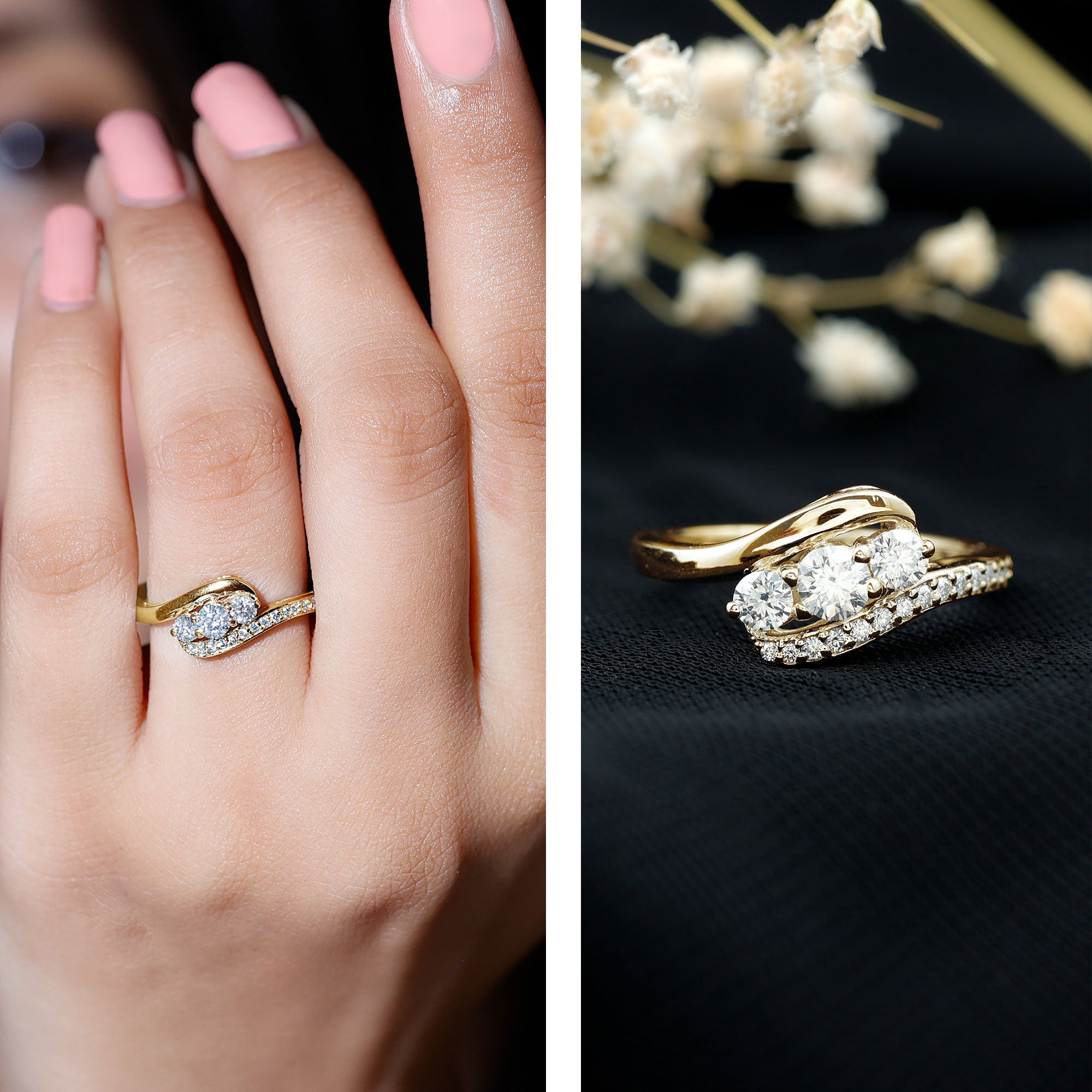 Moissanite and diamond engagement rings share a similar luxurious appearance, but moissanite is known for producing even more fire and colorful sparkle in certain lighting conditions. Many couples choose moissanite because it offers exceptional brilliance while remaining significantly more affordable than traditional diamonds.