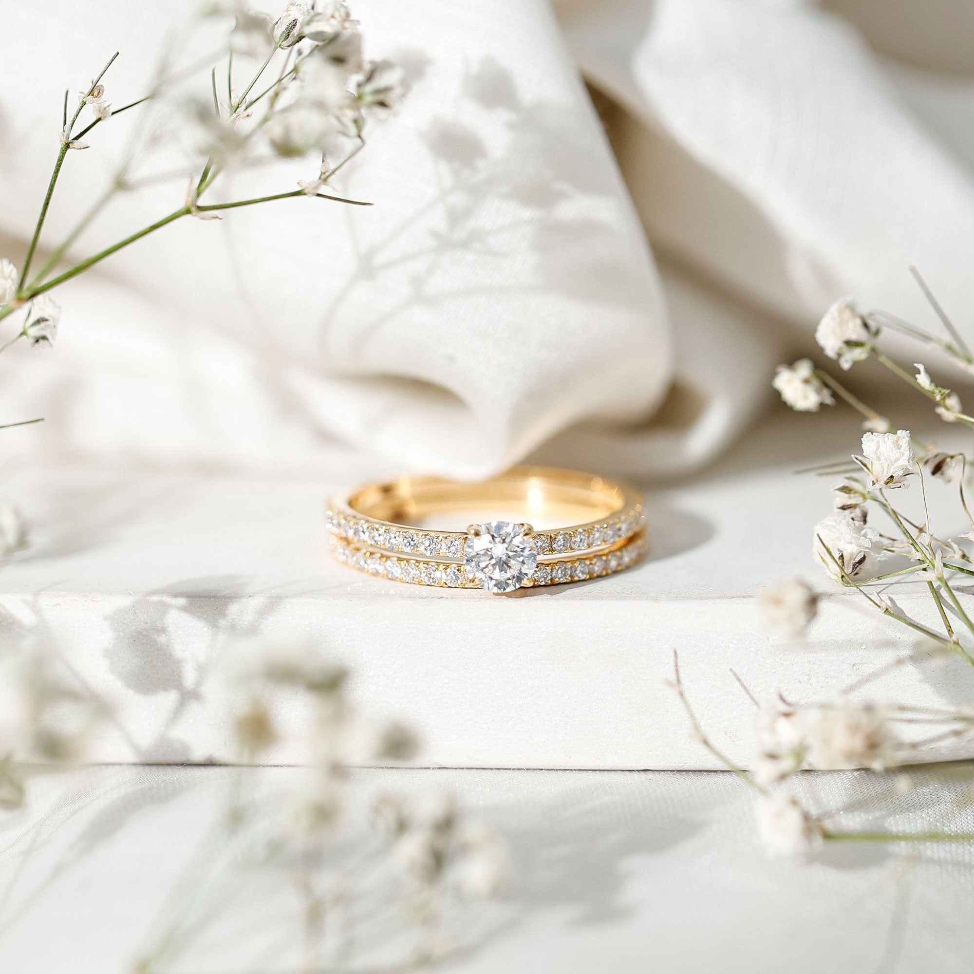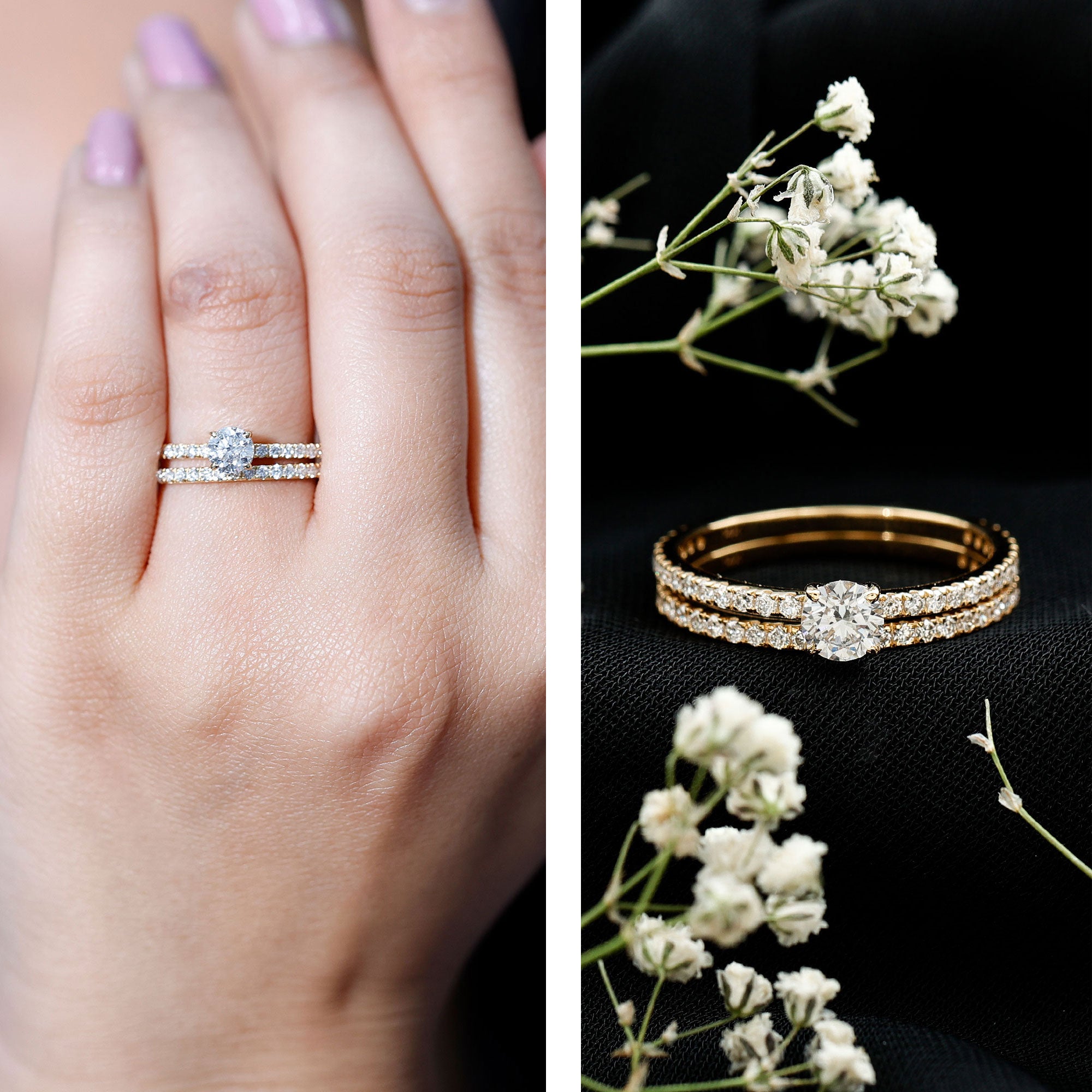 Moissanite has a diamond-like appearance but produces even more fire and colorful sparkle in certain lighting conditions. Many couples appreciate its unique brilliance while enjoying a similar luxury look.