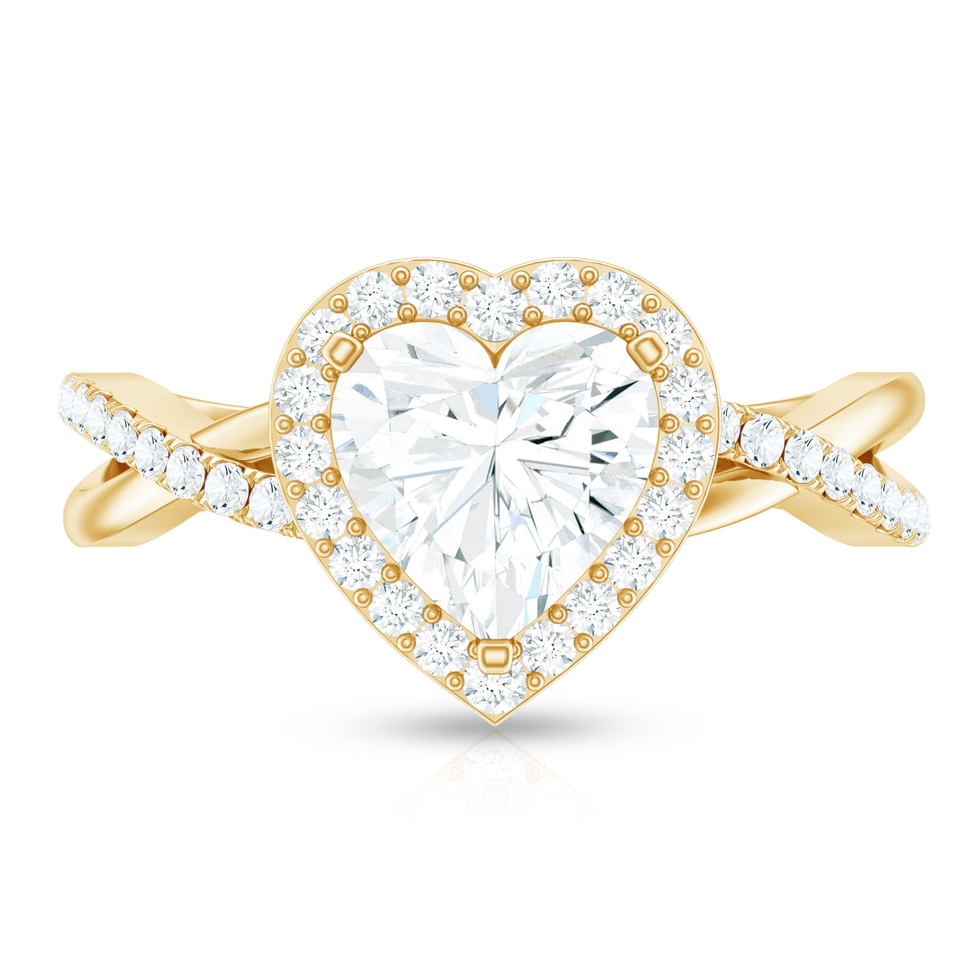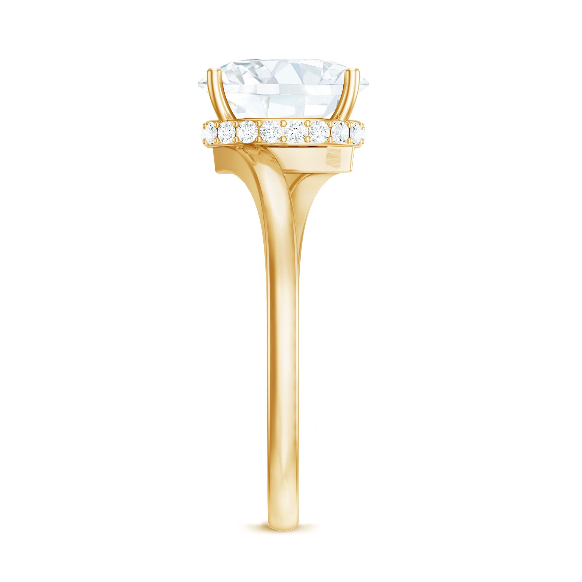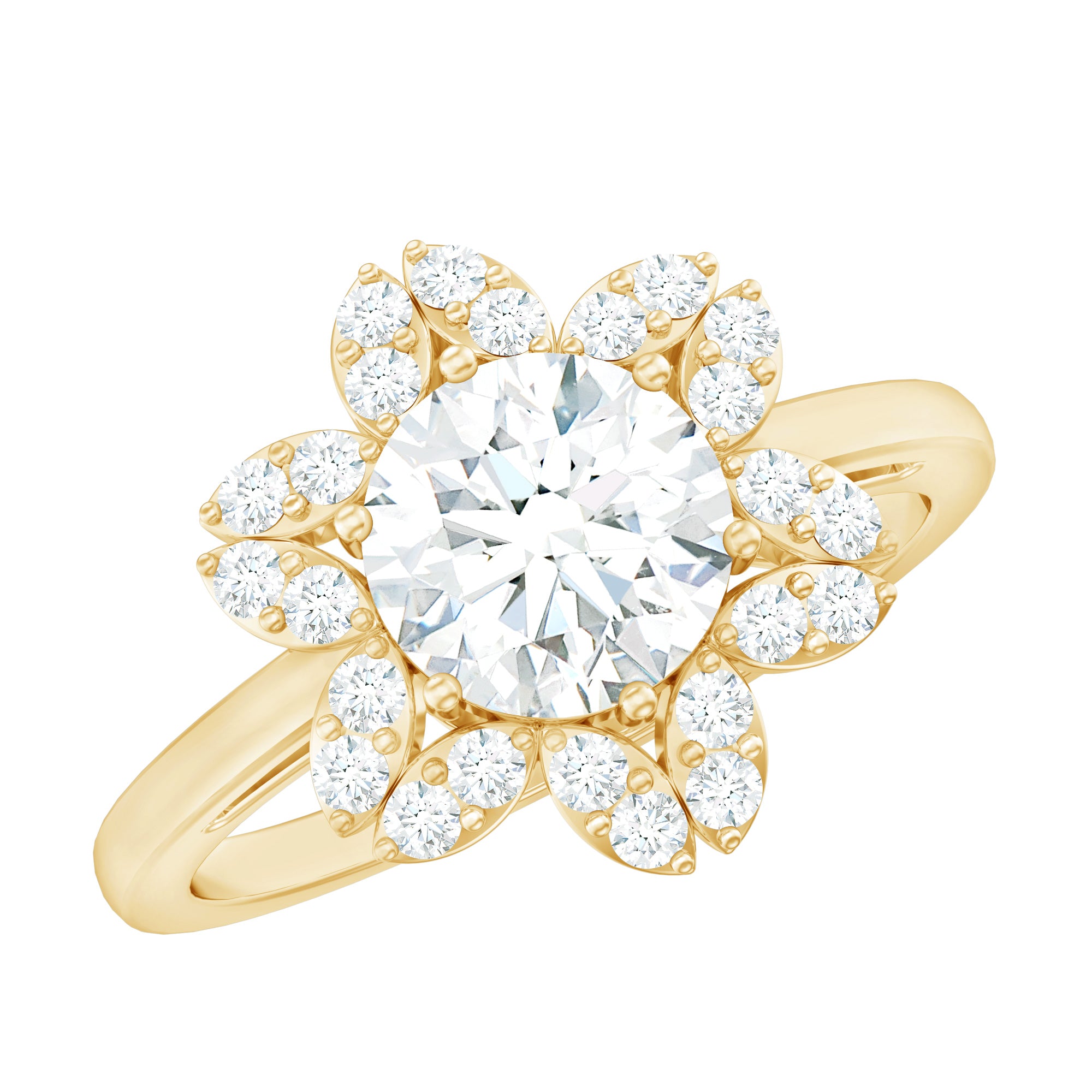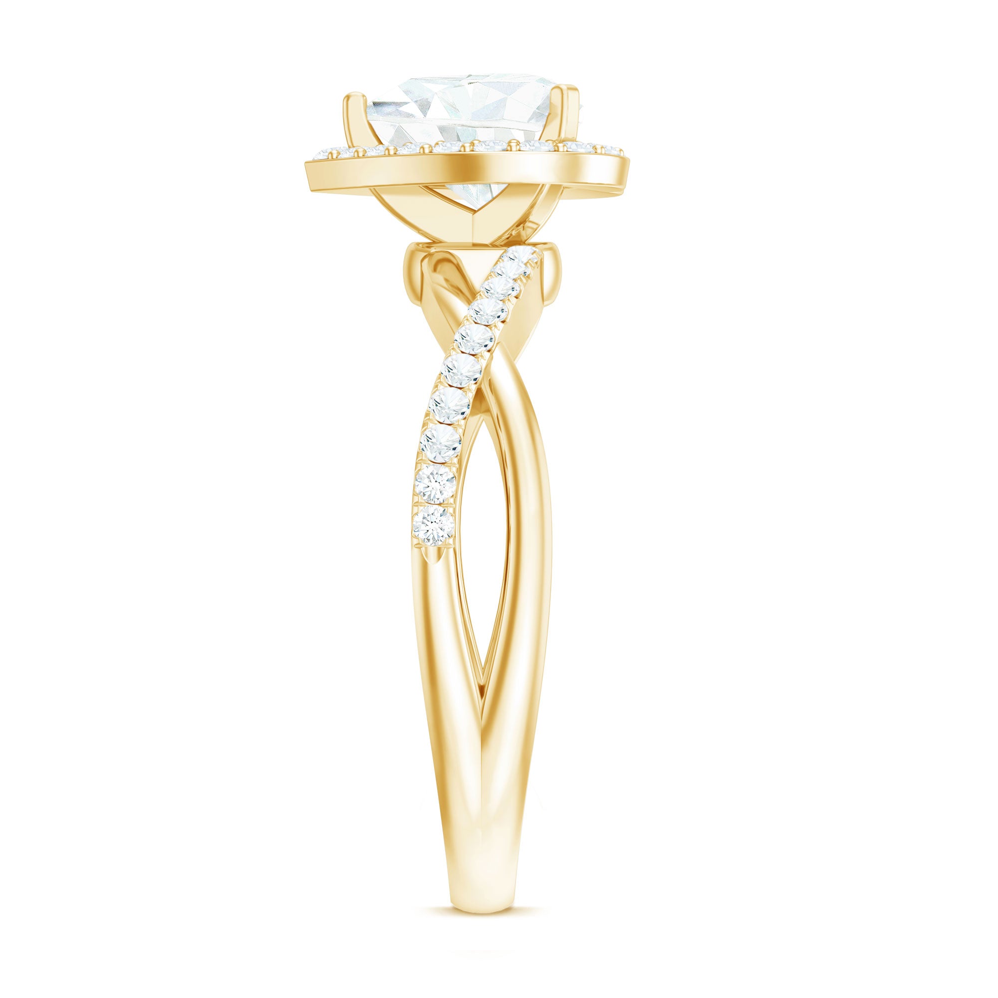 Halo moissanite rings: One center moissanite piece is surrounded by small accent moissanite, which is a halo moissanite setting. Halo gemstone settings are more affordable than gemstone solitaire rings, in case of the same total carat weight, and look similar. the side moissanite in yellow gold moissanite rings creates the illusion of a bigger gemstone.