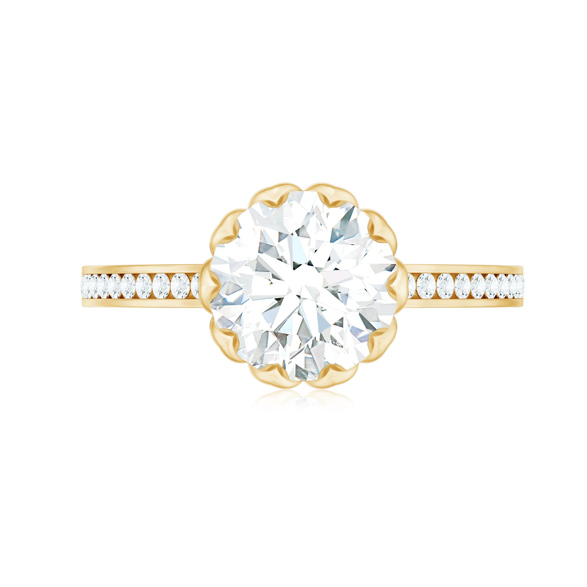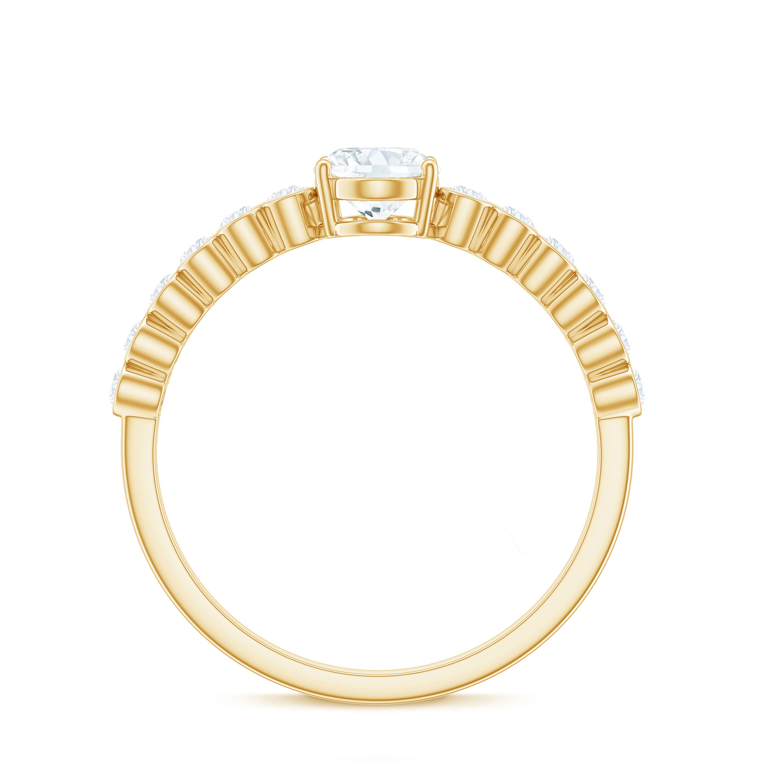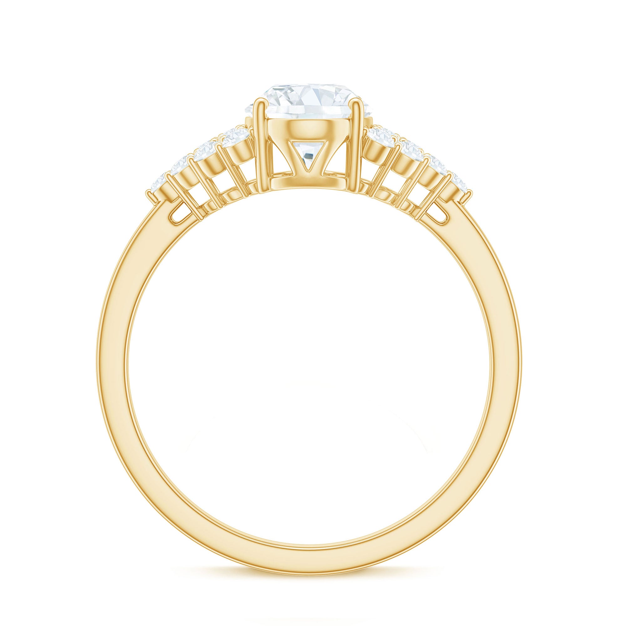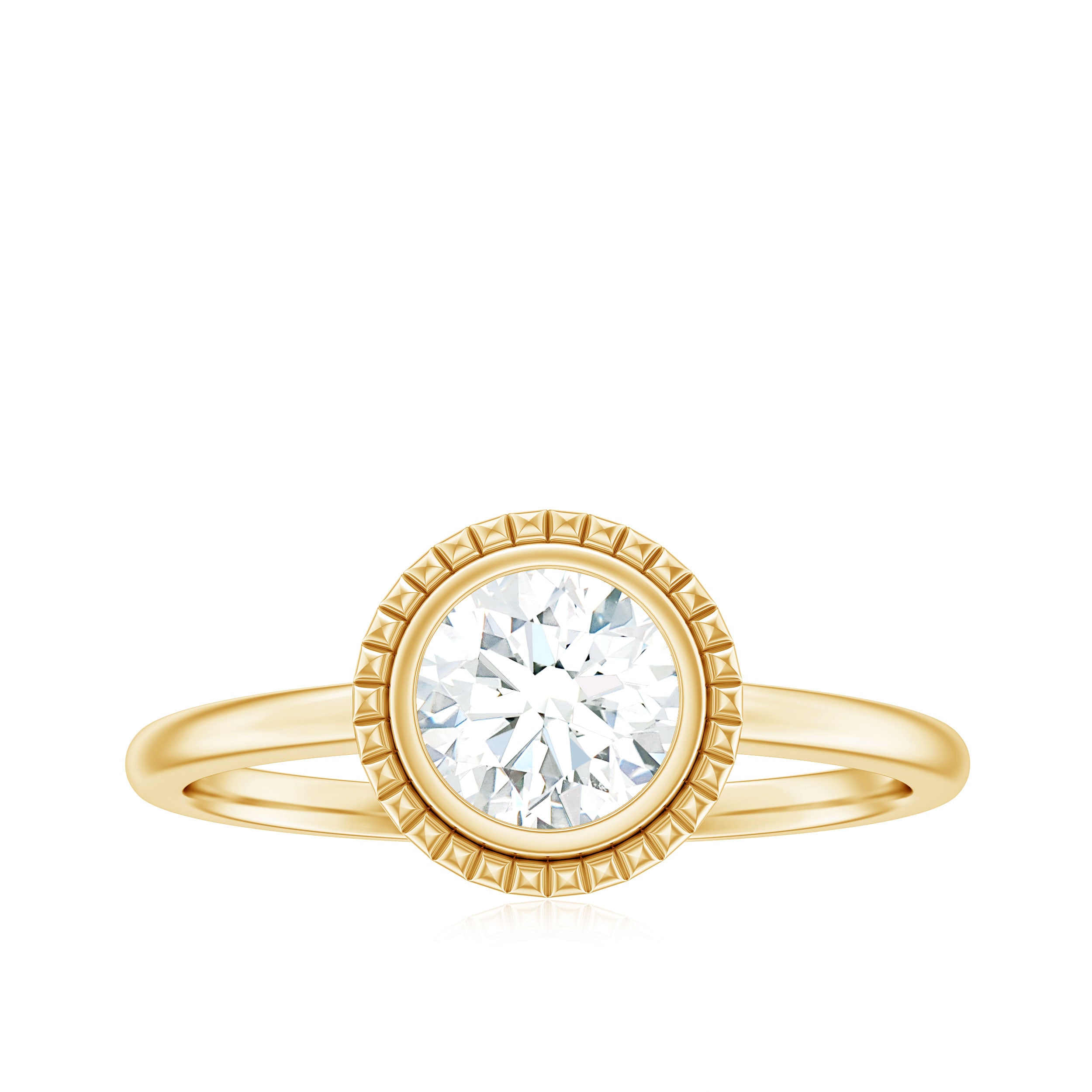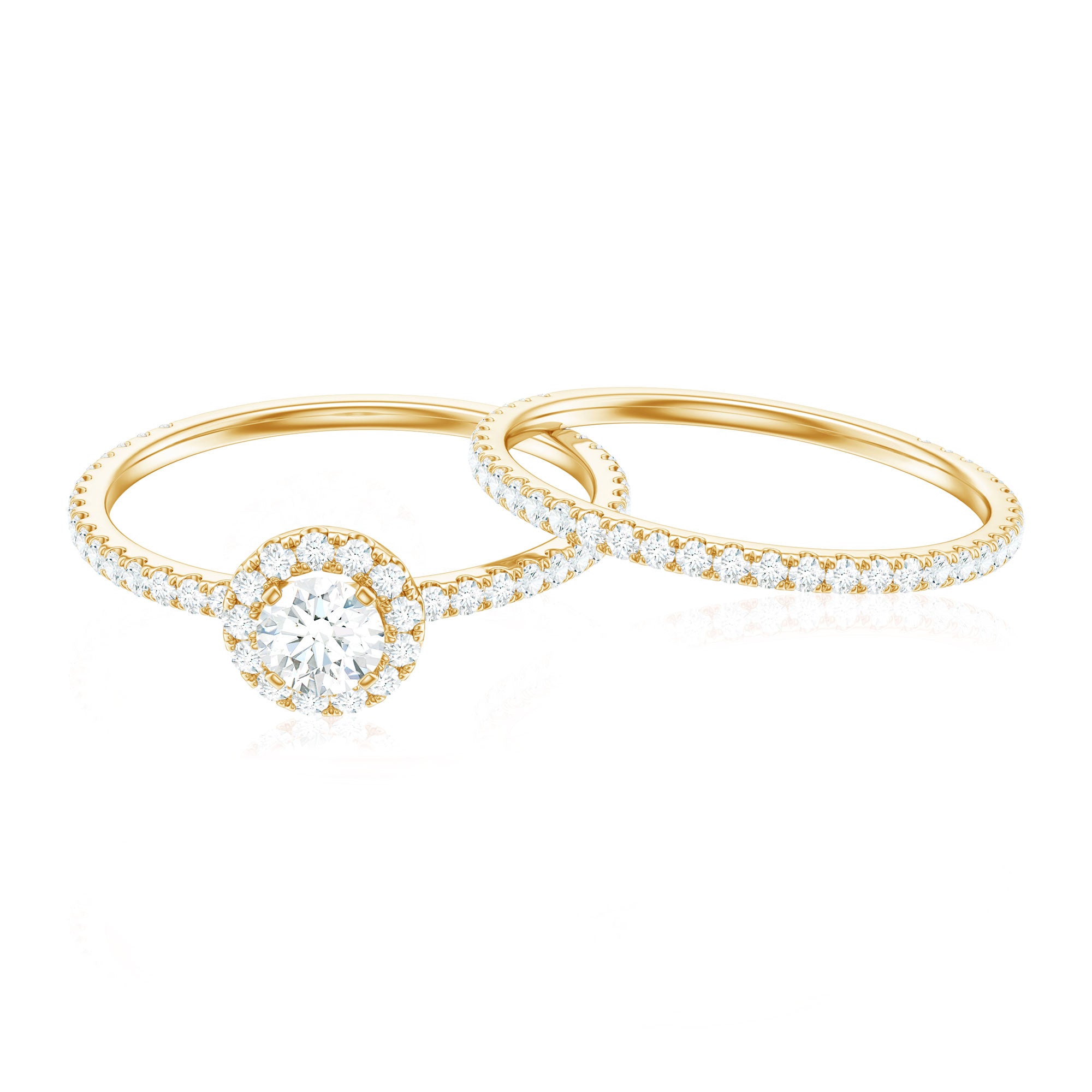 Halo moissanite rings: One center moissanite piece is surrounded by small accent moissanite, which is a halo moissanite setting. Halo gemstone settings are more affordable than gemstone solitaire rings, in case of the same total carat weight, and look similar. the side moissanite in yellow gold moissanite rings creates the illusion of a bigger gemstone.