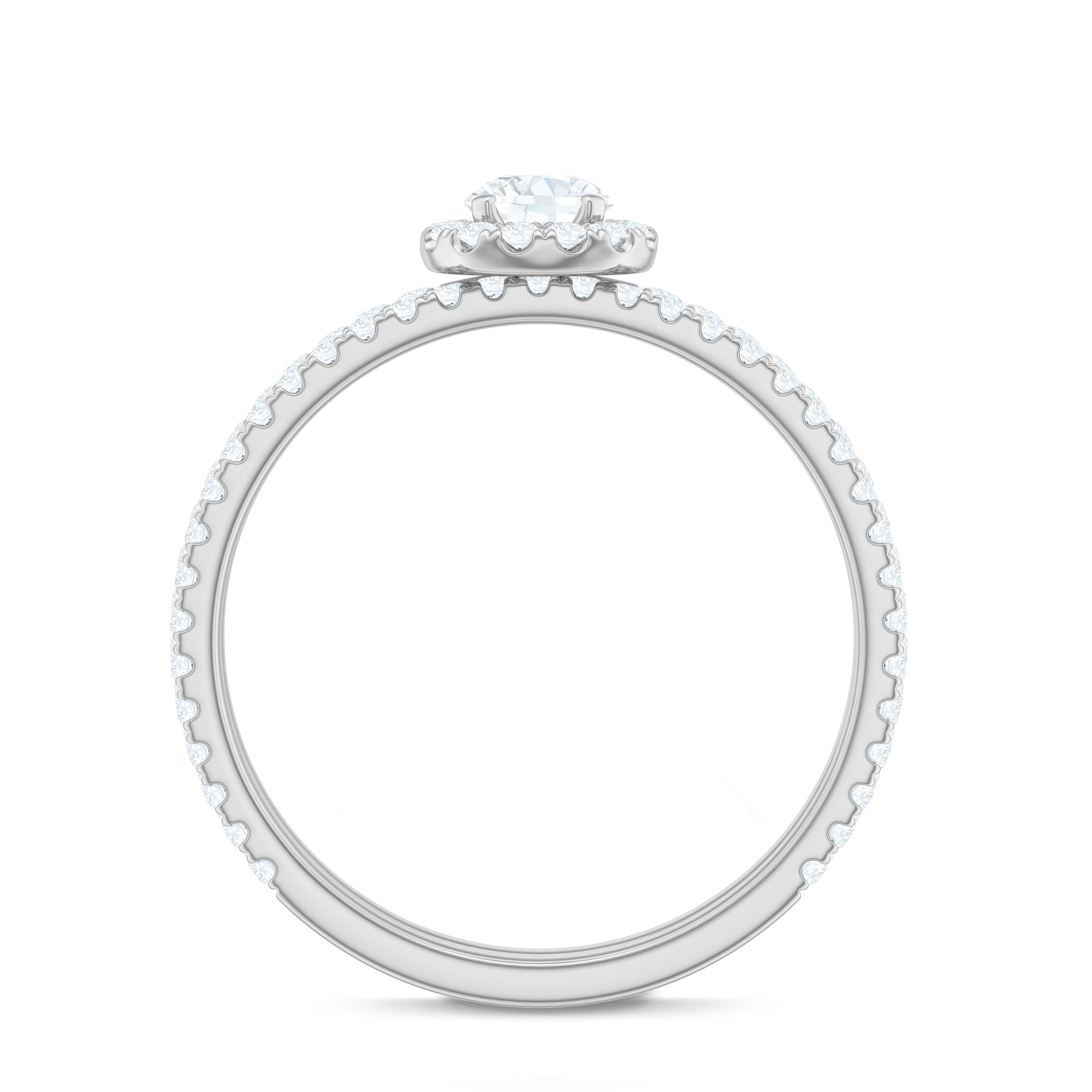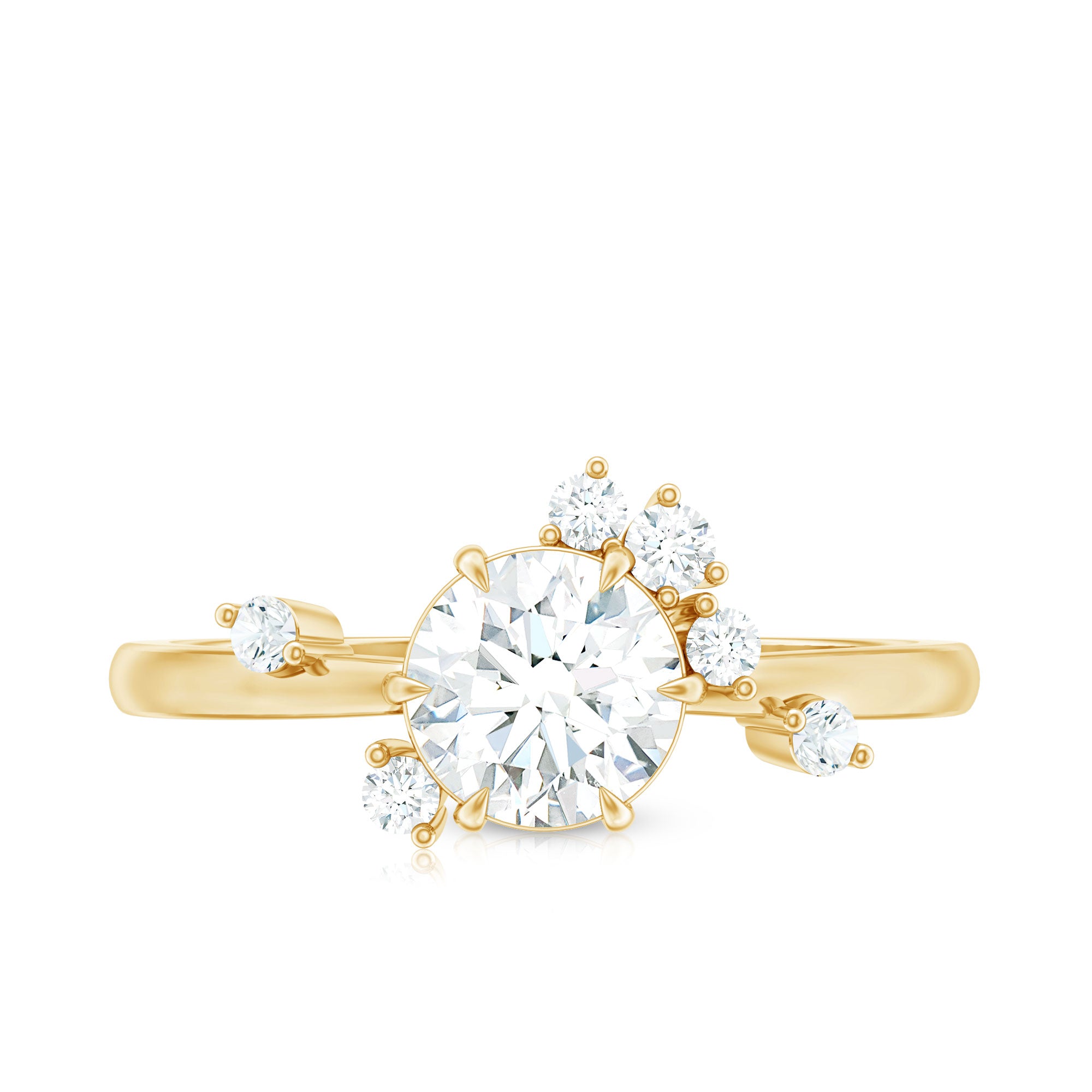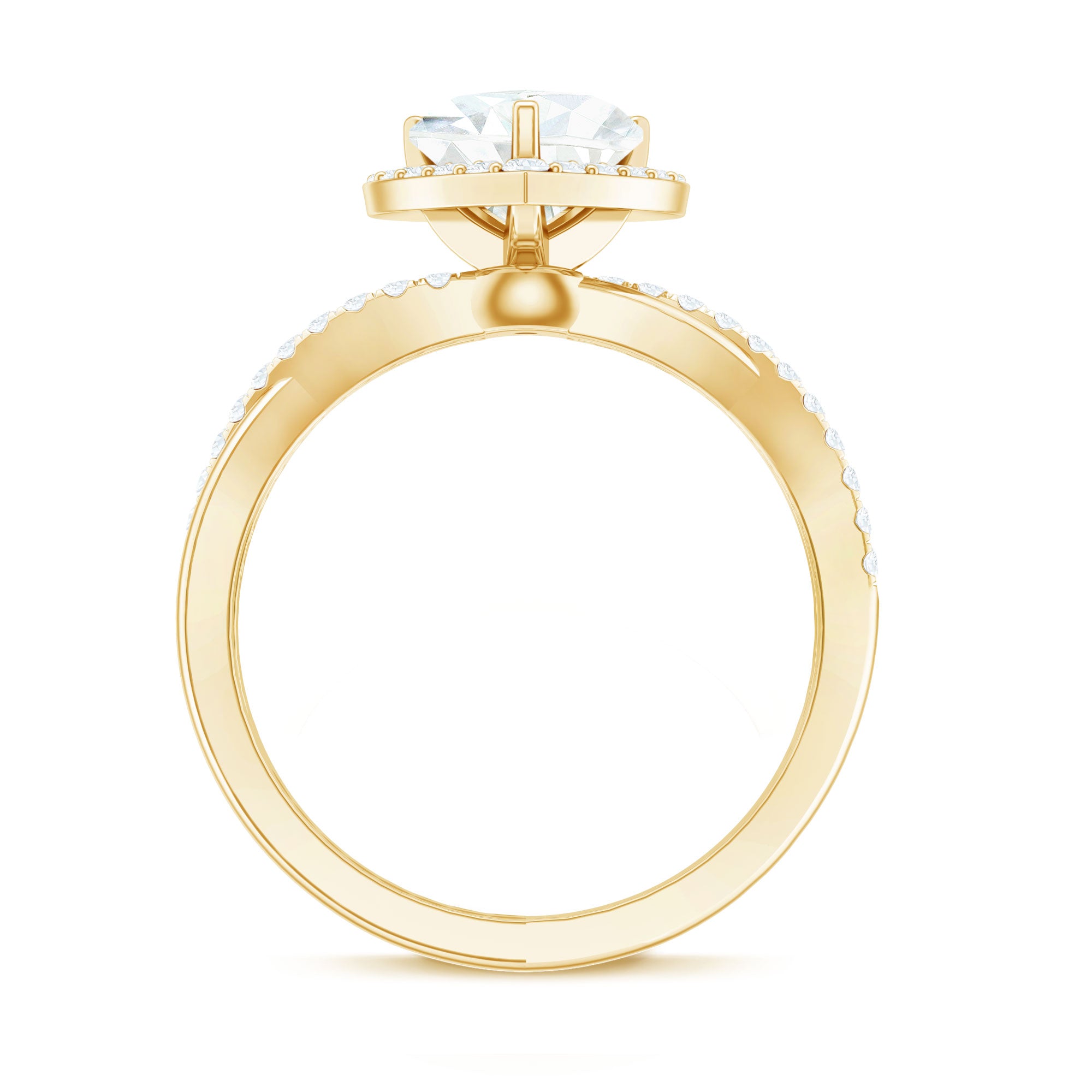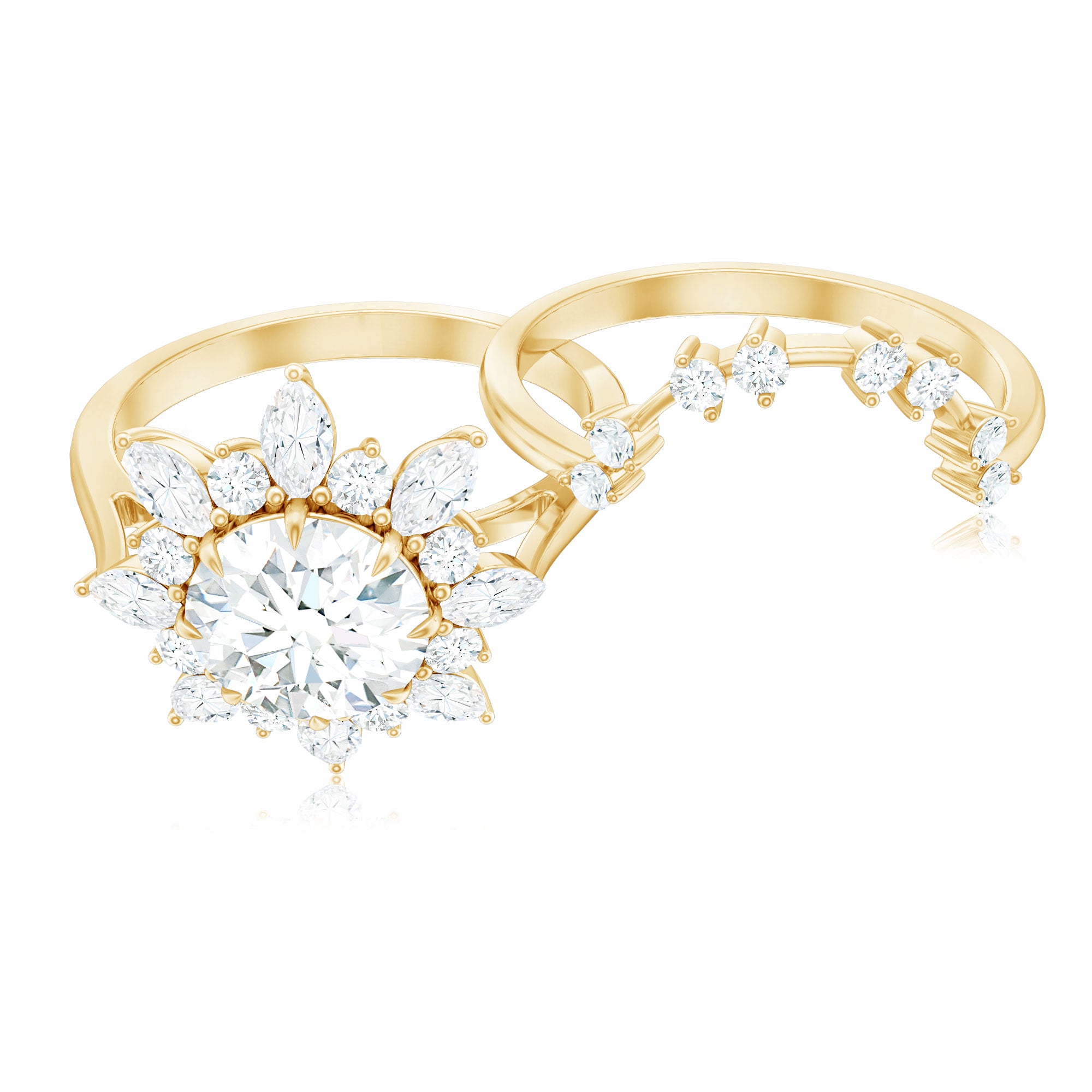 Halo moissanite rings: One center moissanite piece is surrounded by small accent moissanite, which is a halo moissanite setting. Halo gemstone settings are more affordable than gemstone solitaire rings, in case of the same total carat weight, and look similar. the side moissanite in yellow gold moissanite rings creates the illusion of a bigger gemstone.
