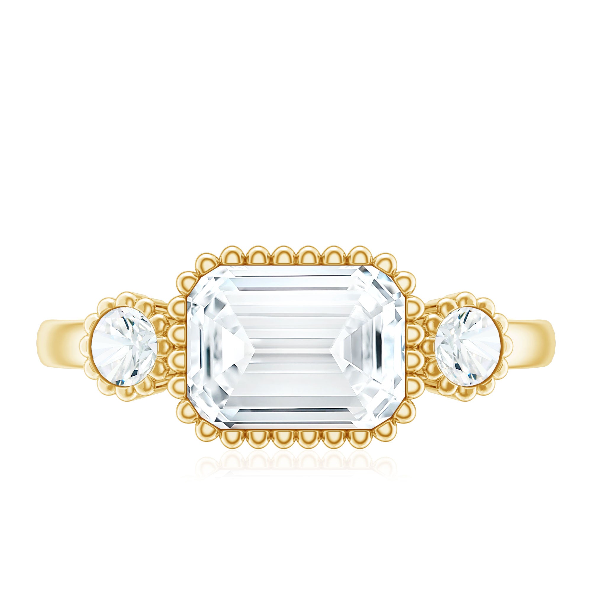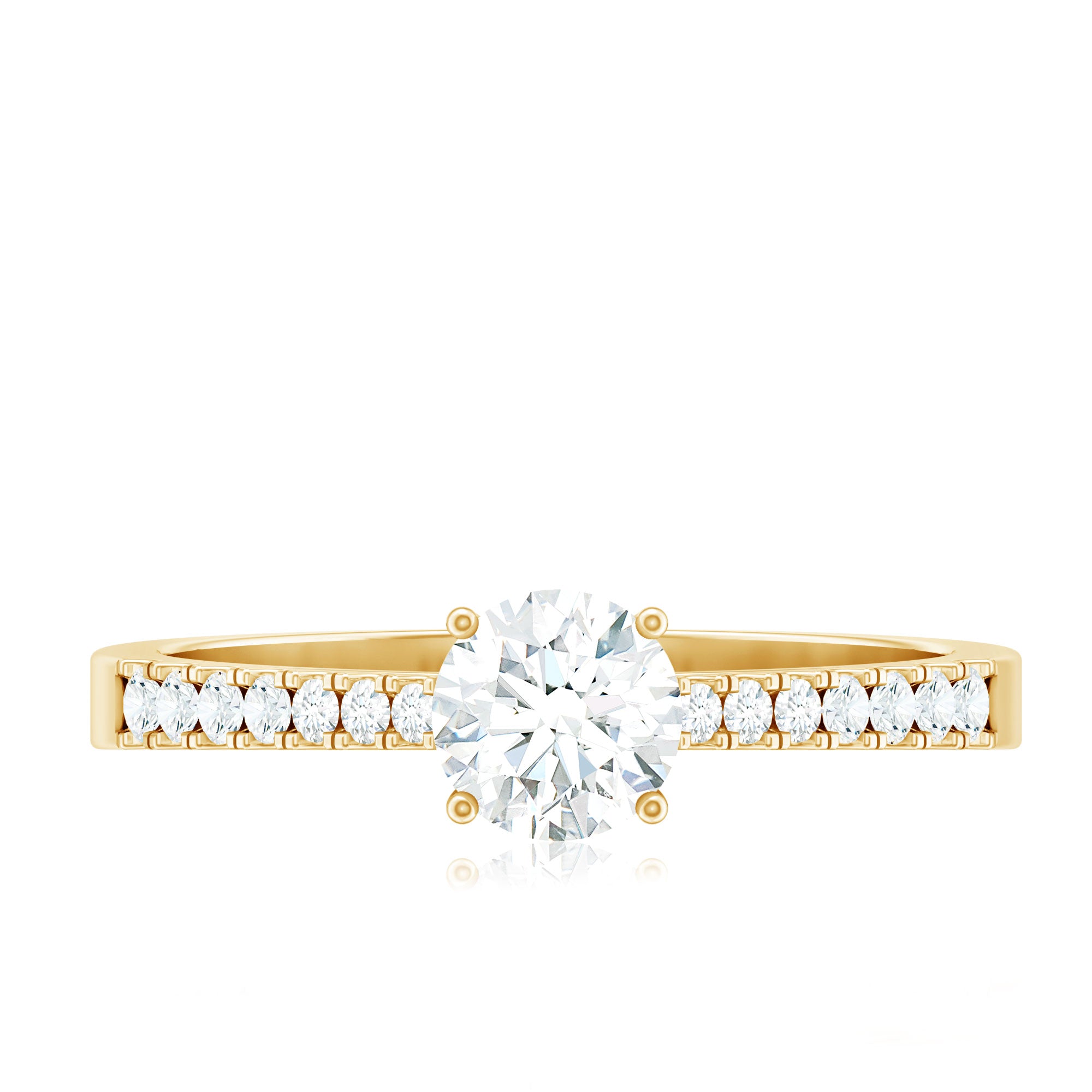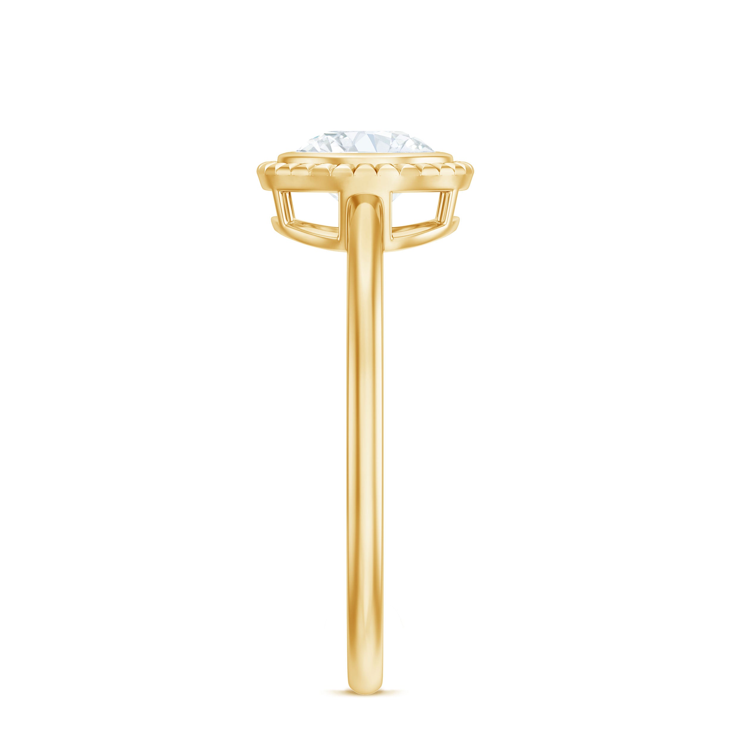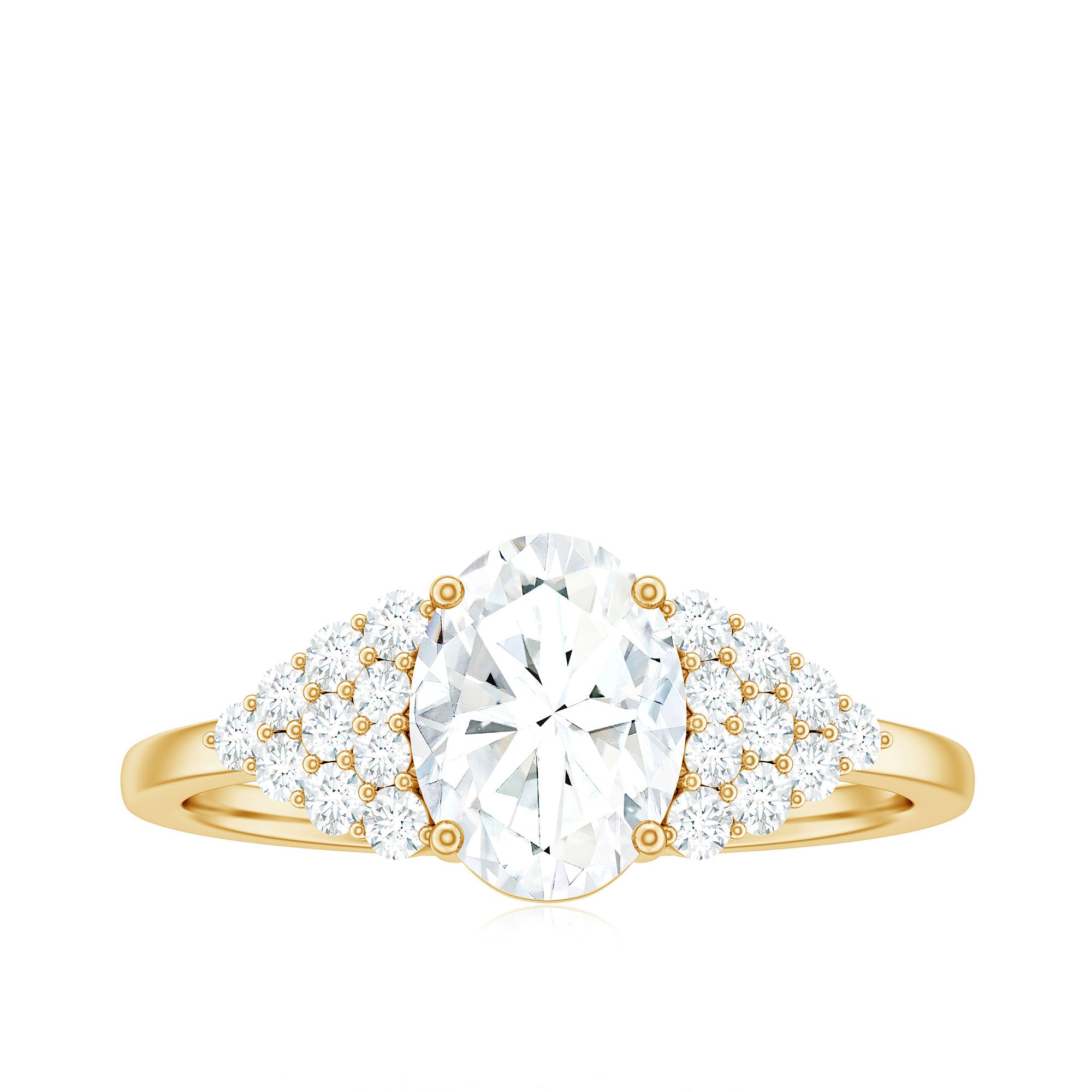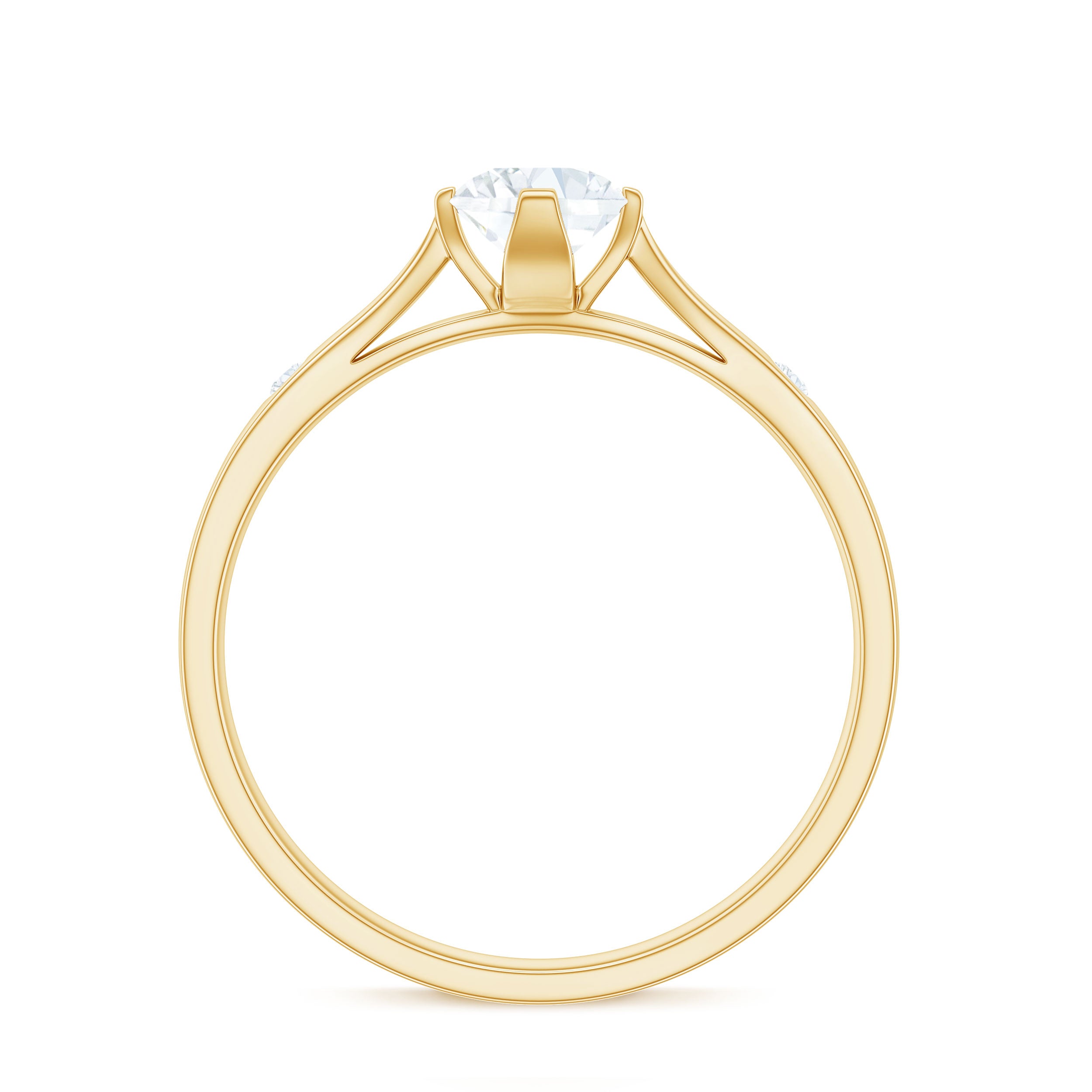 Halo moissanite rings: One center moissanite piece is surrounded by small accent moissanite, which is a halo moissanite setting. Halo gemstone settings are more affordable than gemstone solitaire rings, in case of the same total carat weight, and look similar. the side moissanite in yellow gold moissanite rings creates the illusion of a bigger gemstone.