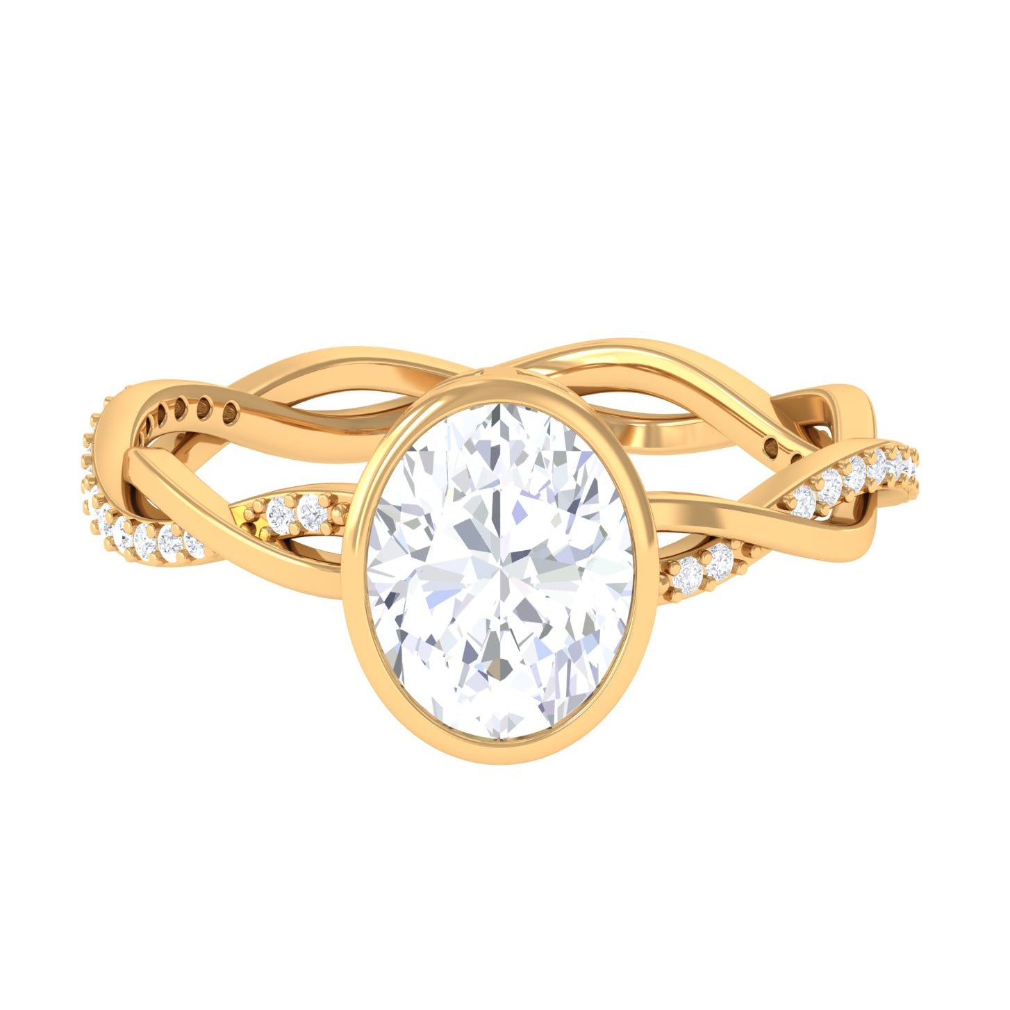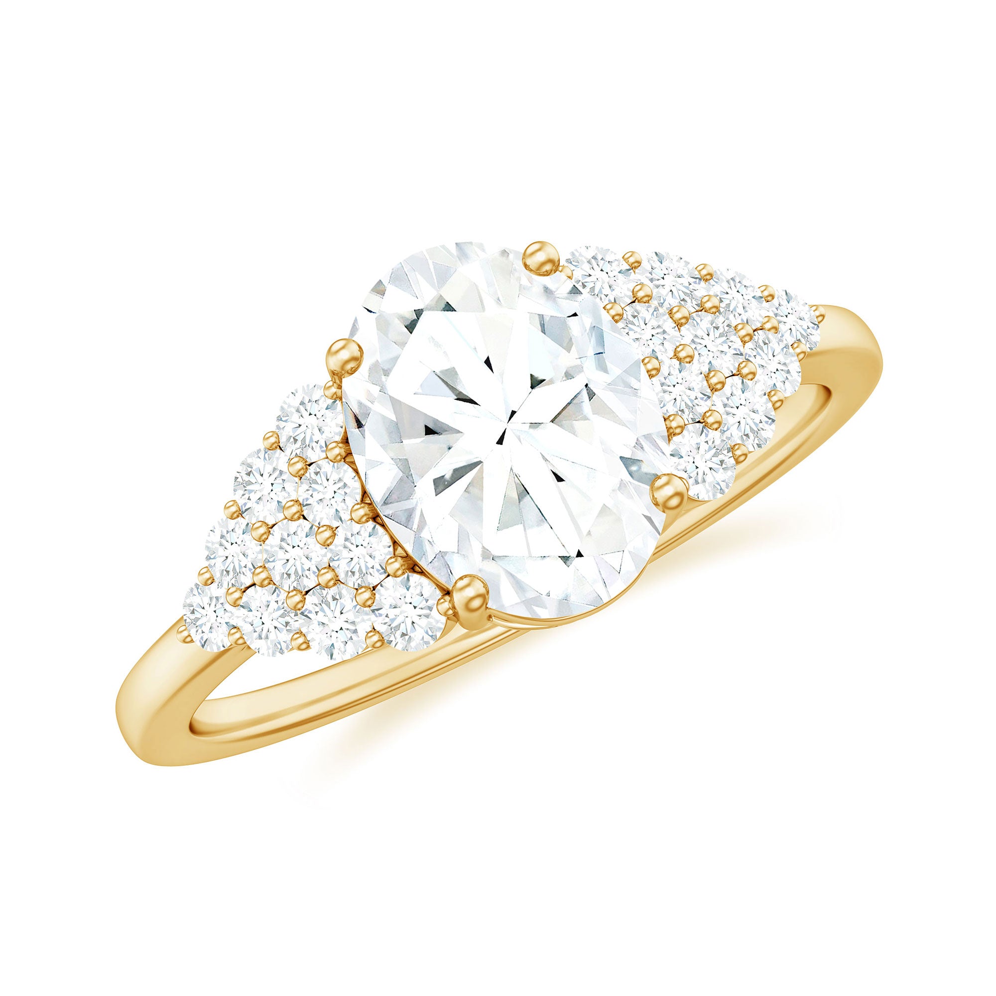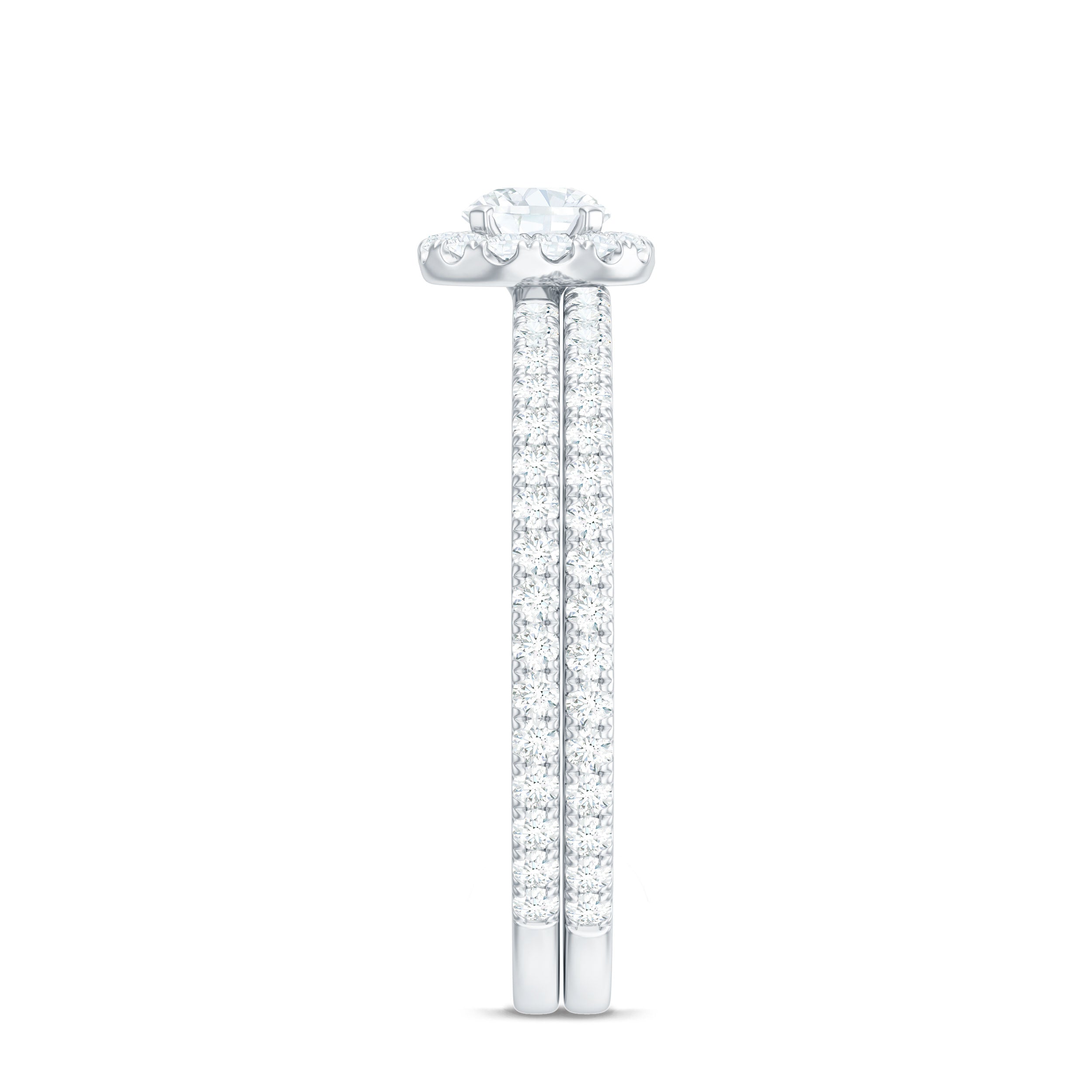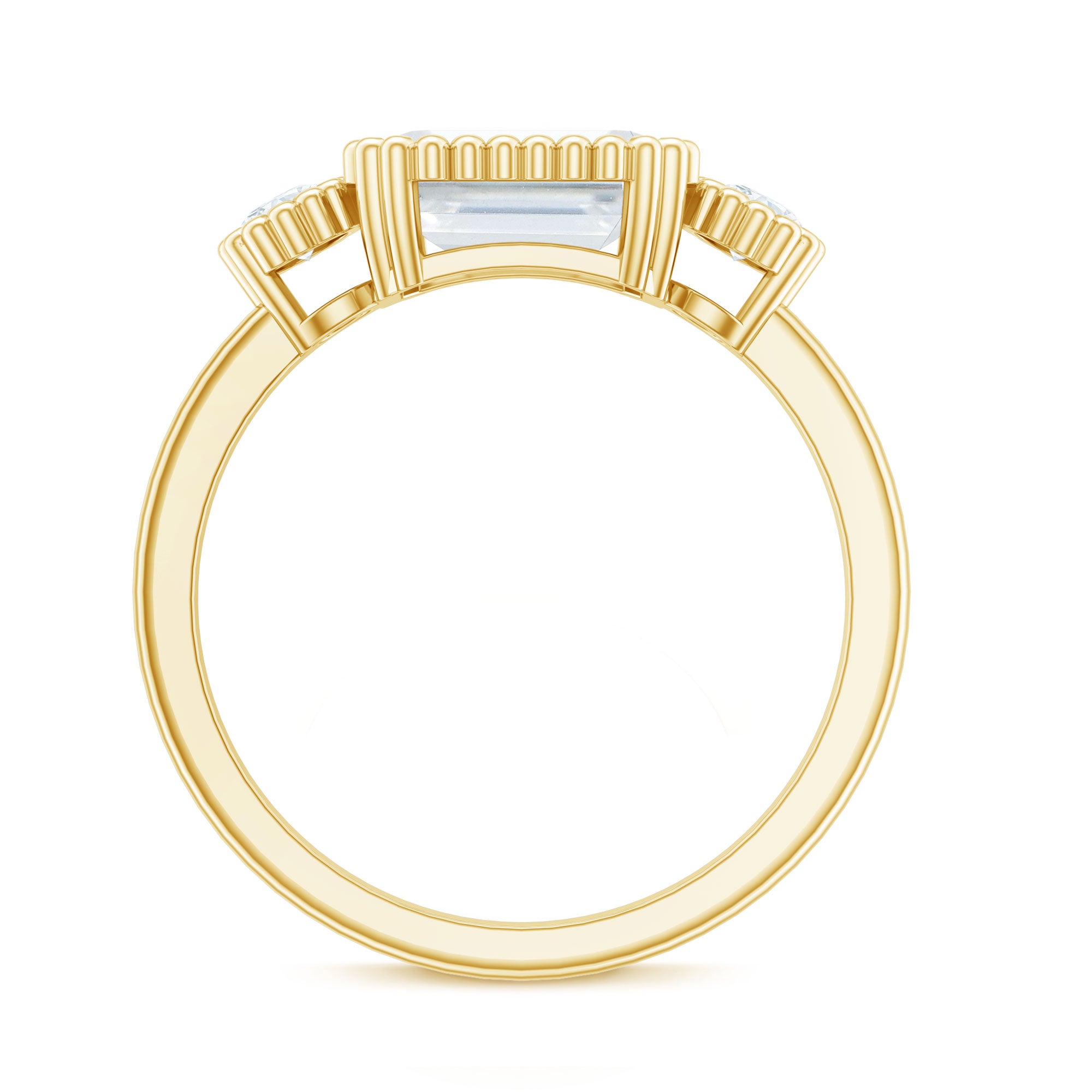 Halo moissanite rings: One center moissanite piece is surrounded by small accent moissanite, which is a halo moissanite setting. Halo gemstone settings are more affordable than gemstone solitaire rings, in case of the same total carat weight, and look similar. the side moissanite in yellow gold moissanite rings creates the illusion of a bigger gemstone.