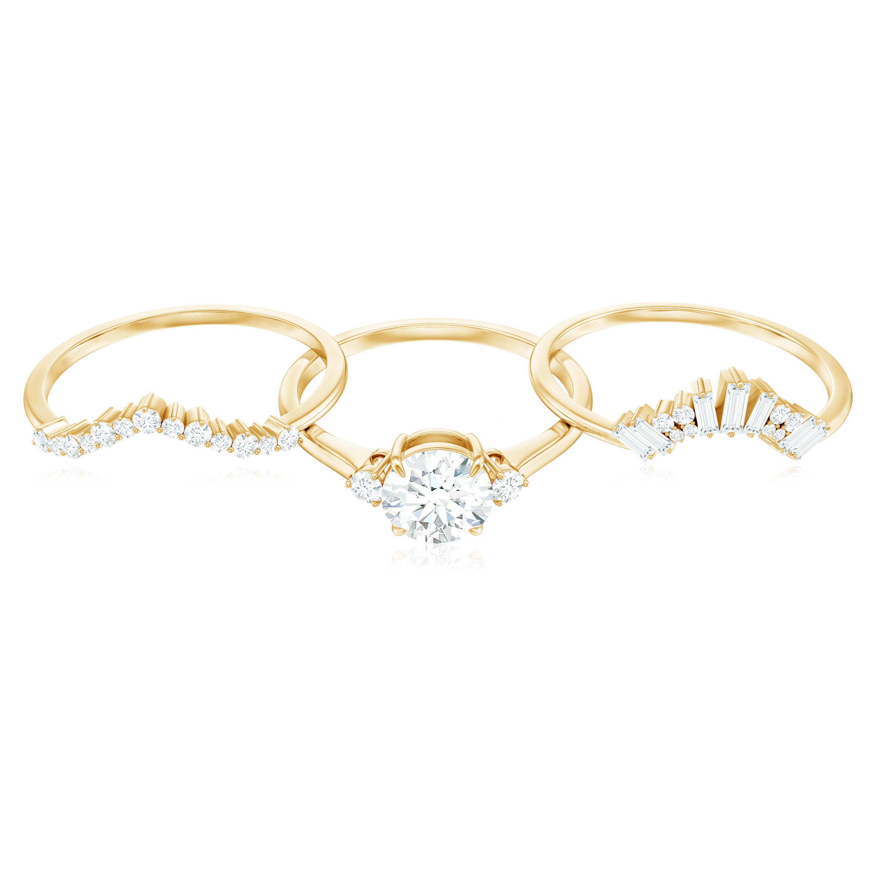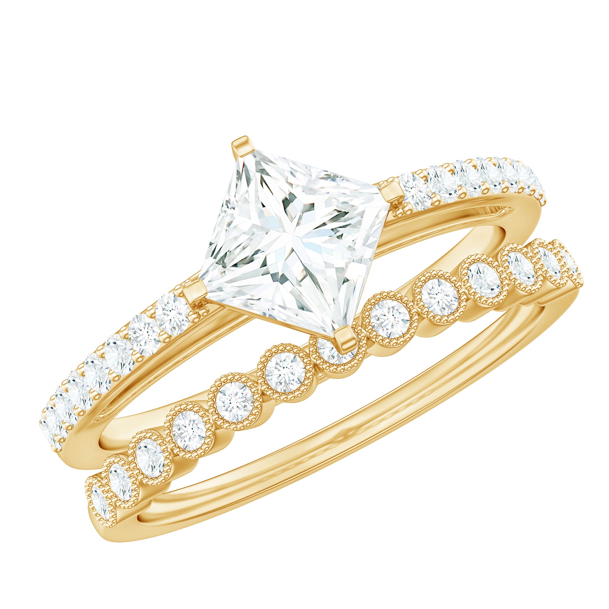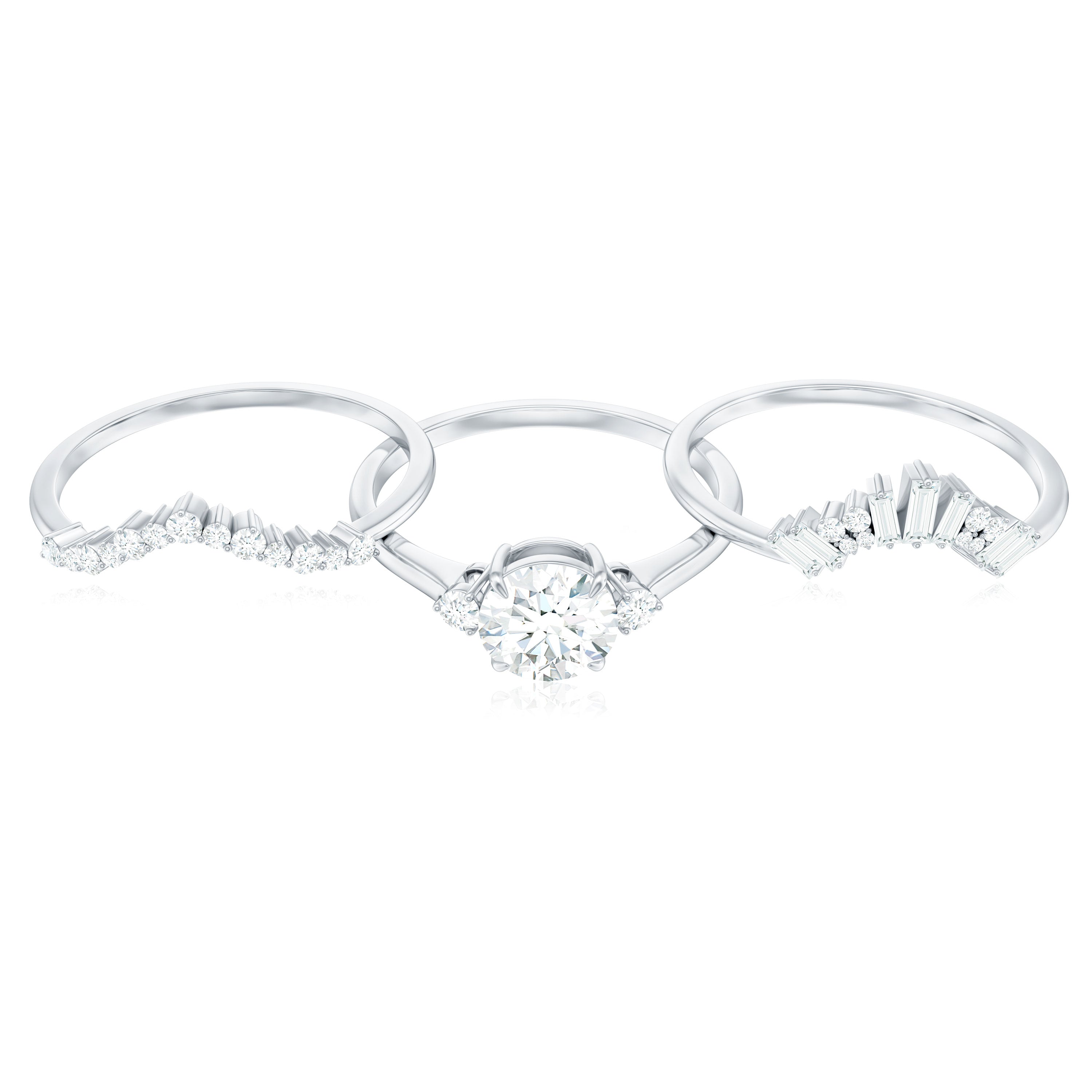 Moissanite Bridal Ring Sets: One of the popular choices for engagements and weddings is you can buy a ring set. The Bridal Ring Set is the perfect stacking combination of engagement rings and moissanite wedding rings. Two different styles create sets of rings that look premium and classy. The wedding band compliments the engagement ring and works as an enhancer.