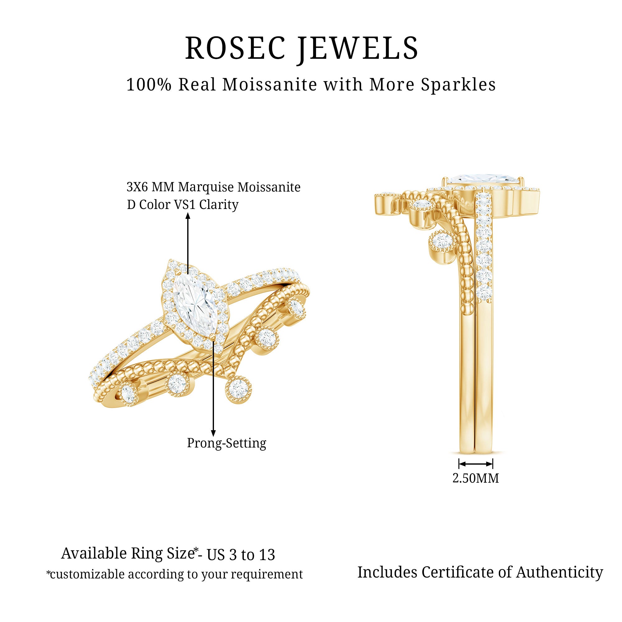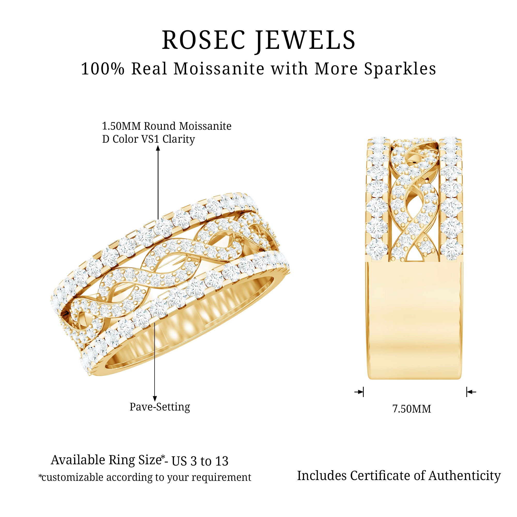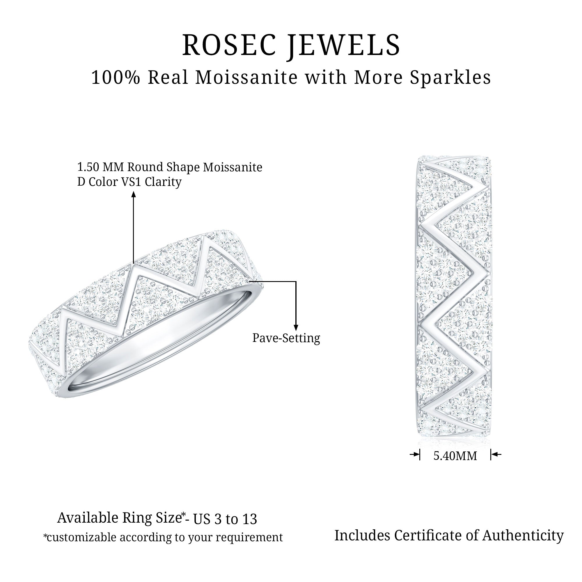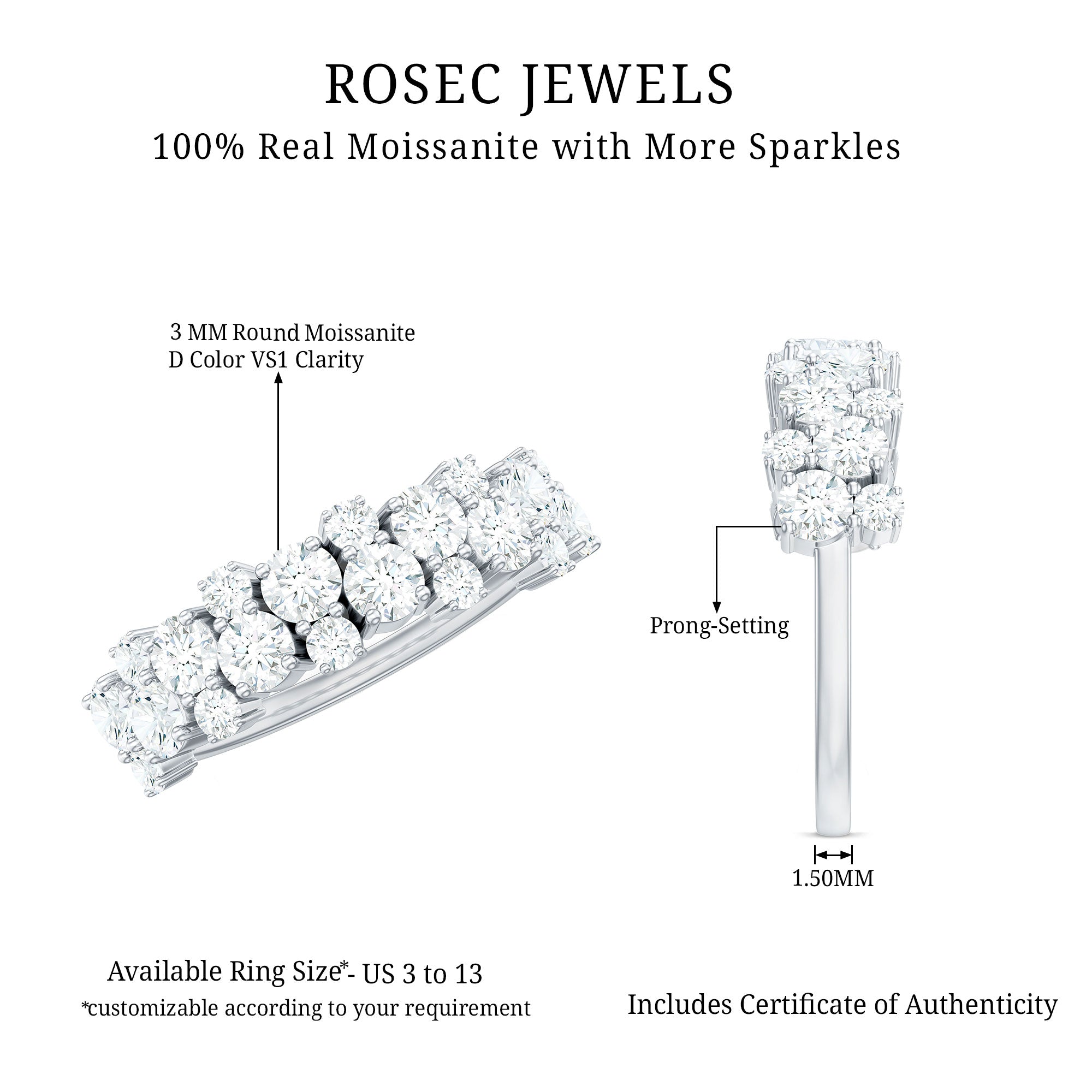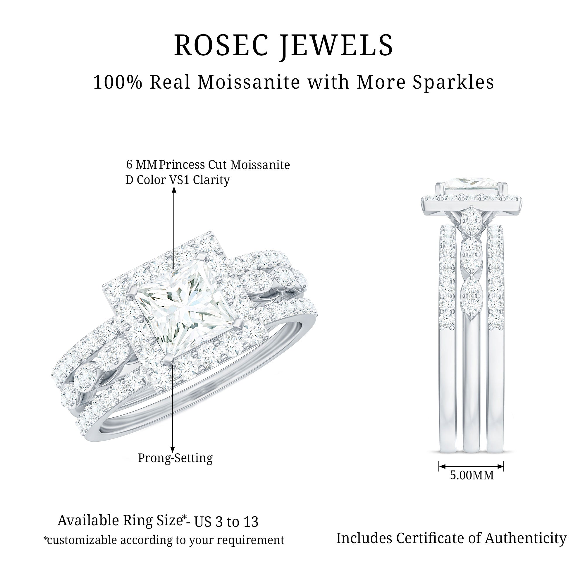 Rosec Jewels handcrafts moissanite wedding ring set with utmost care and perfection that you’ll fall in love with every single piece. The moissanite we choose to mount on men’s and women’s moissanite wedding bands are of highest quality. Moissanite is an ethical stone and now it has been widely accepted for traditional vows. So why don’t you witness the moissanite love in person?