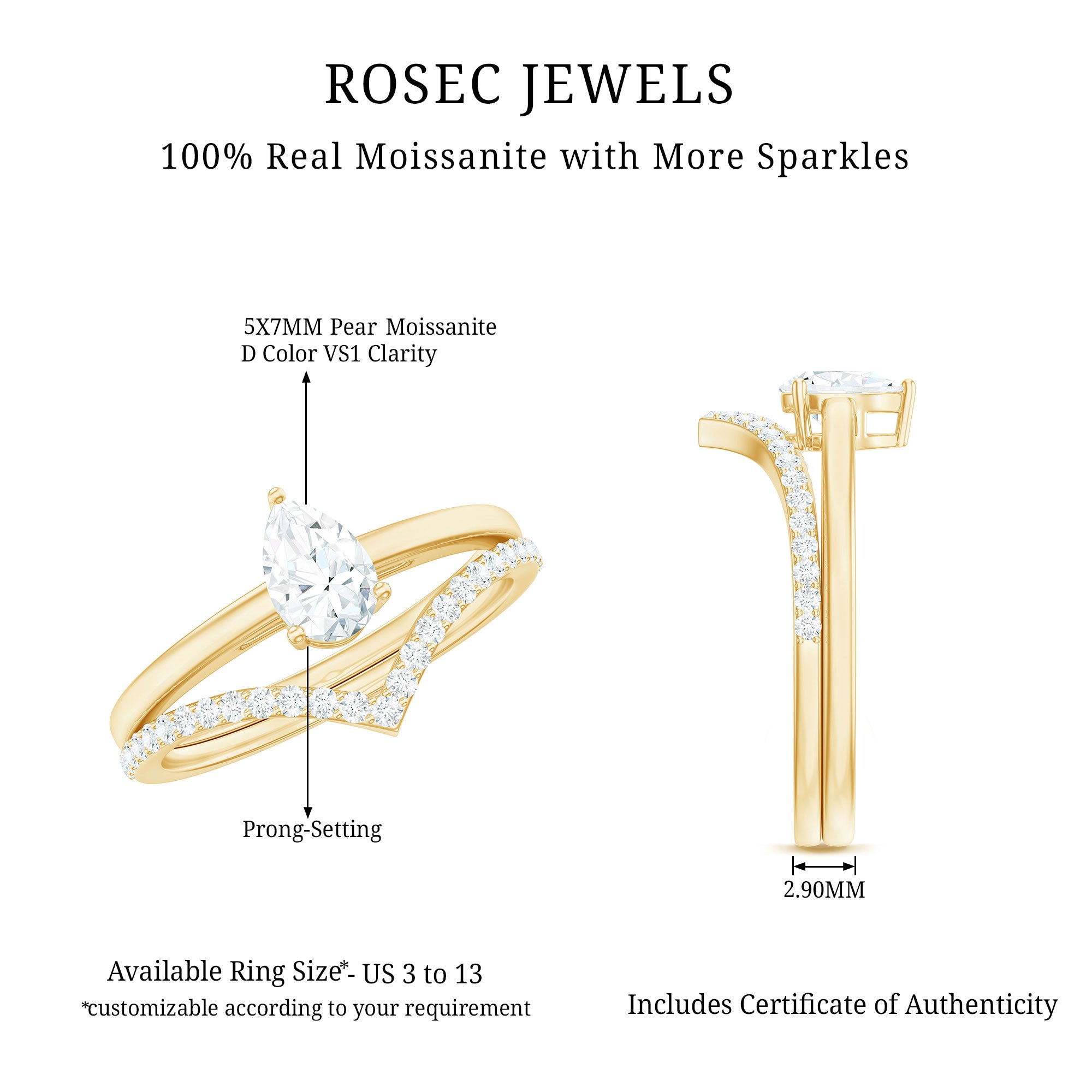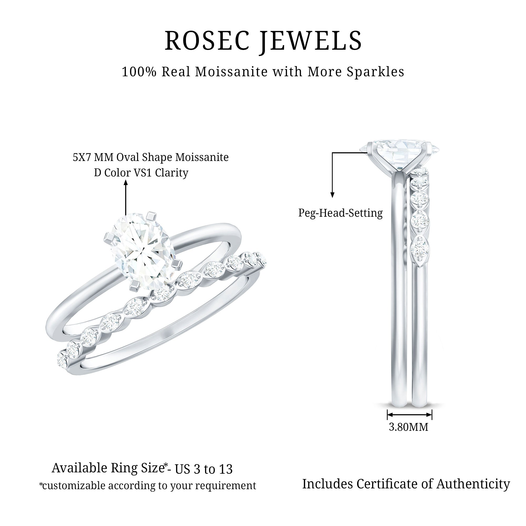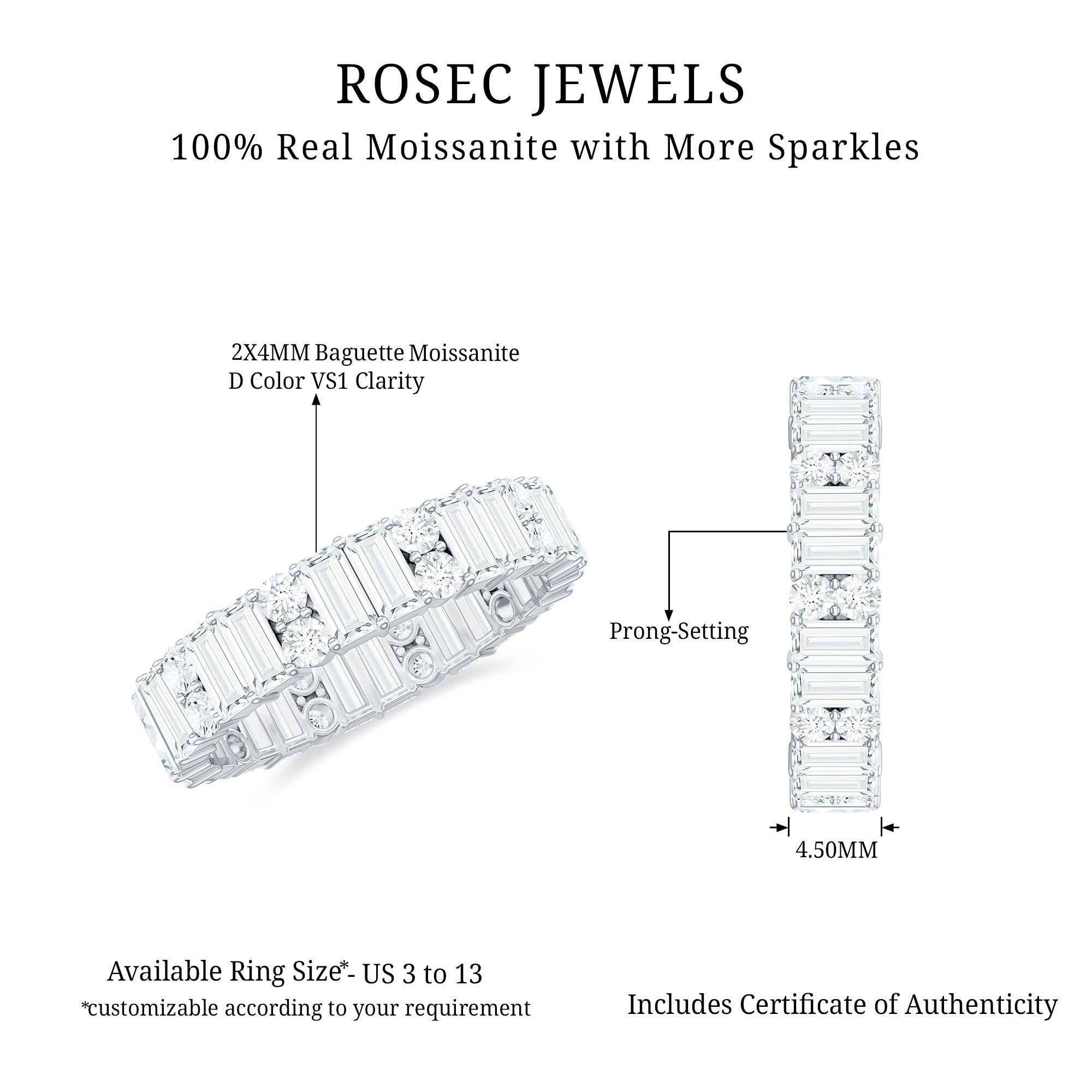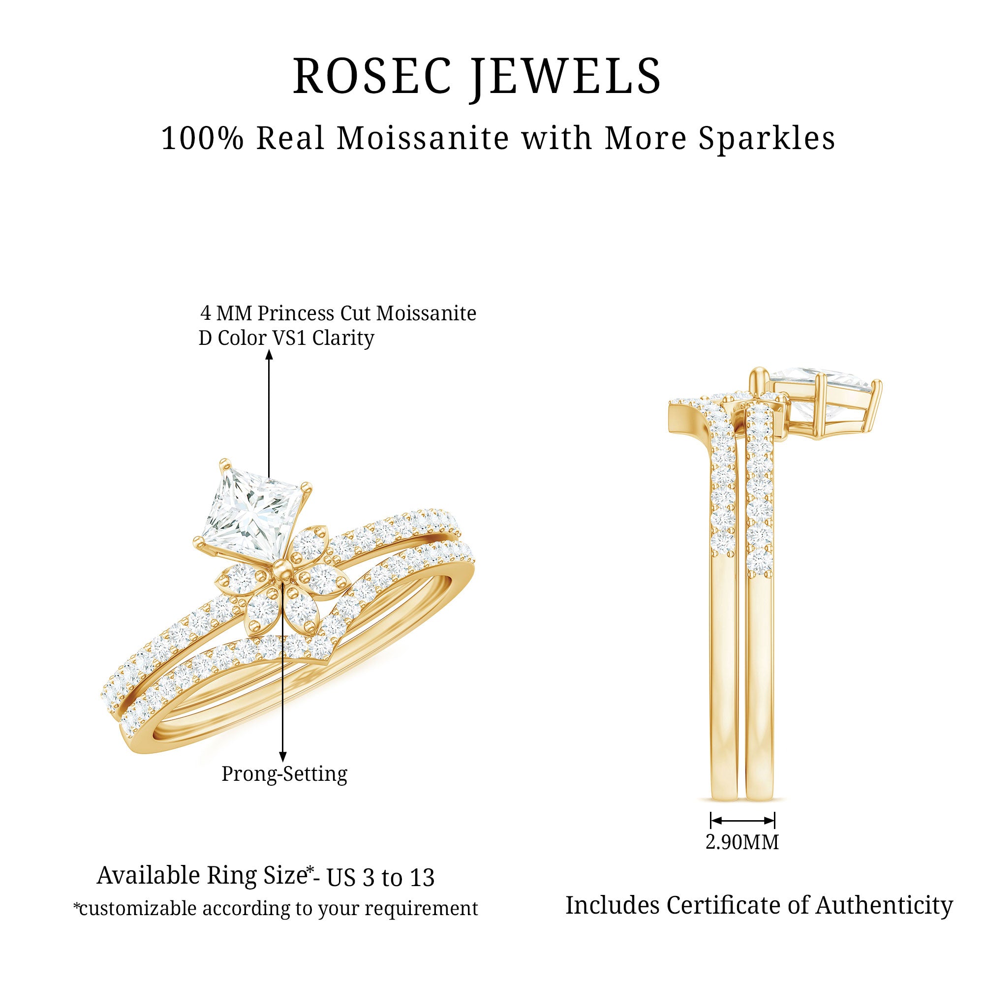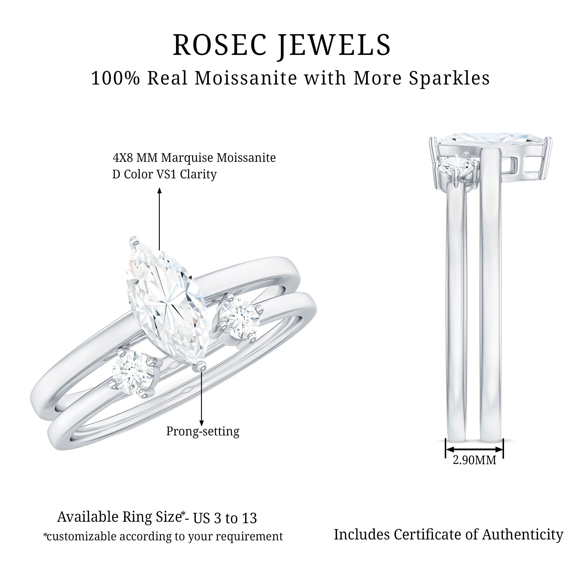 Rosec Jewels handcrafts moissanite wedding ring set with utmost care and perfection that you’ll fall in love with every single piece. The moissanite we choose to mount on men’s and women’s moissanite wedding bands are of highest quality. Moissanite is an ethical stone and now it has been widely accepted for traditional vows. So why don’t you witness the moissanite love in person?
