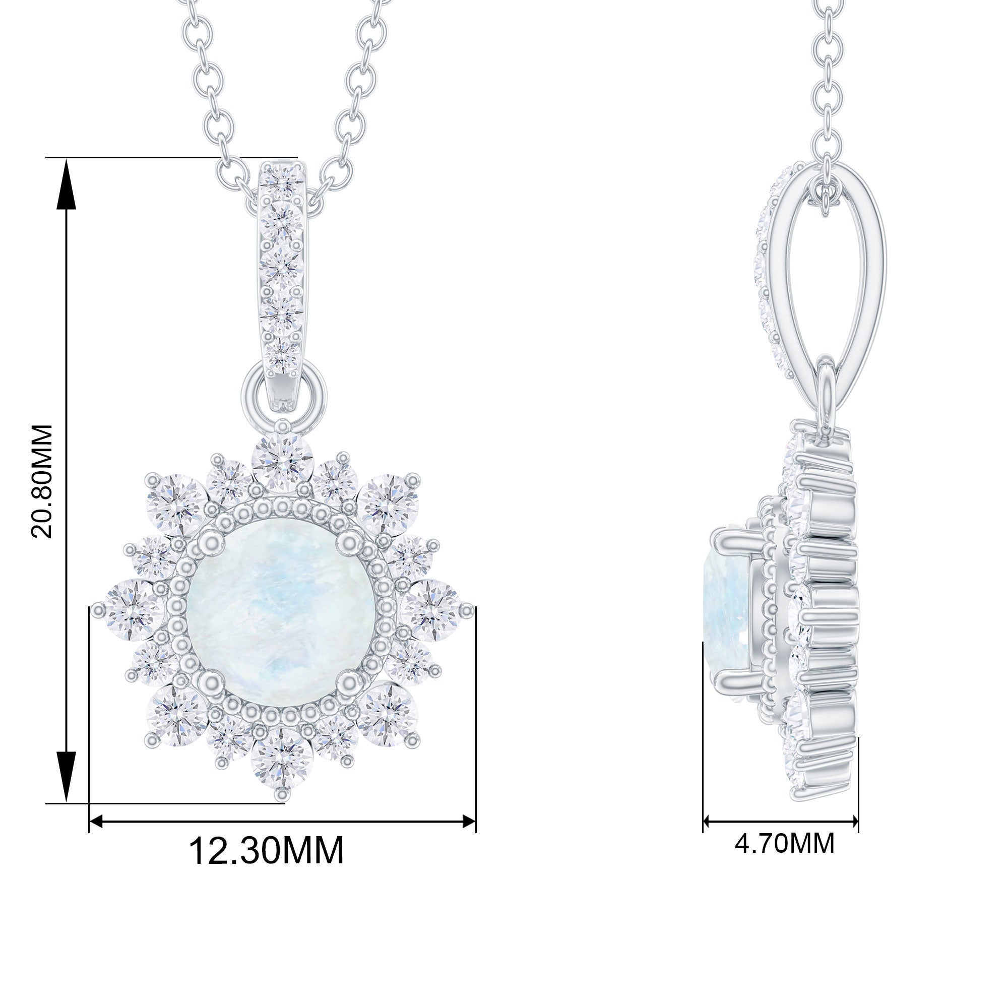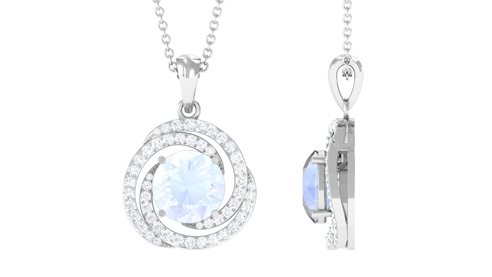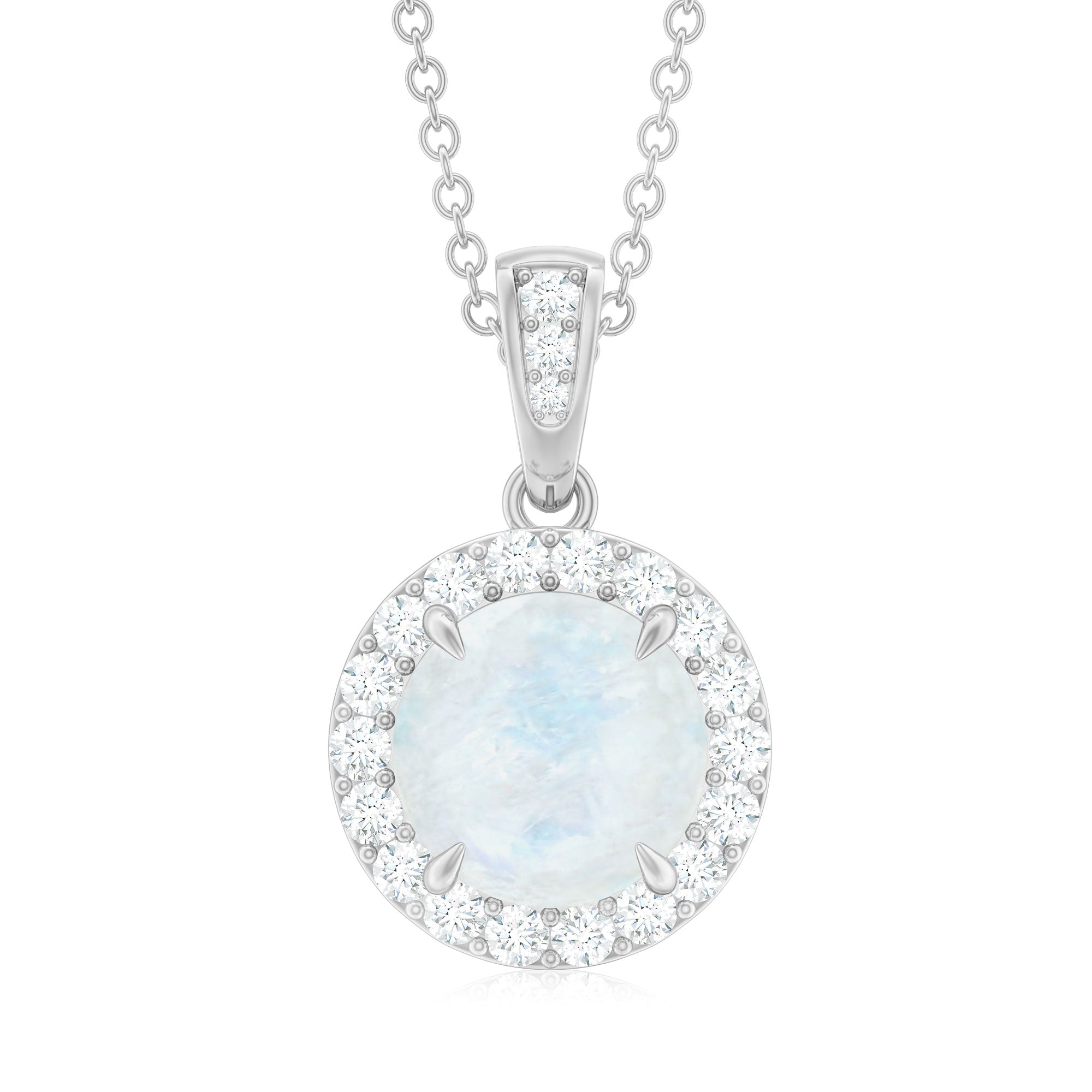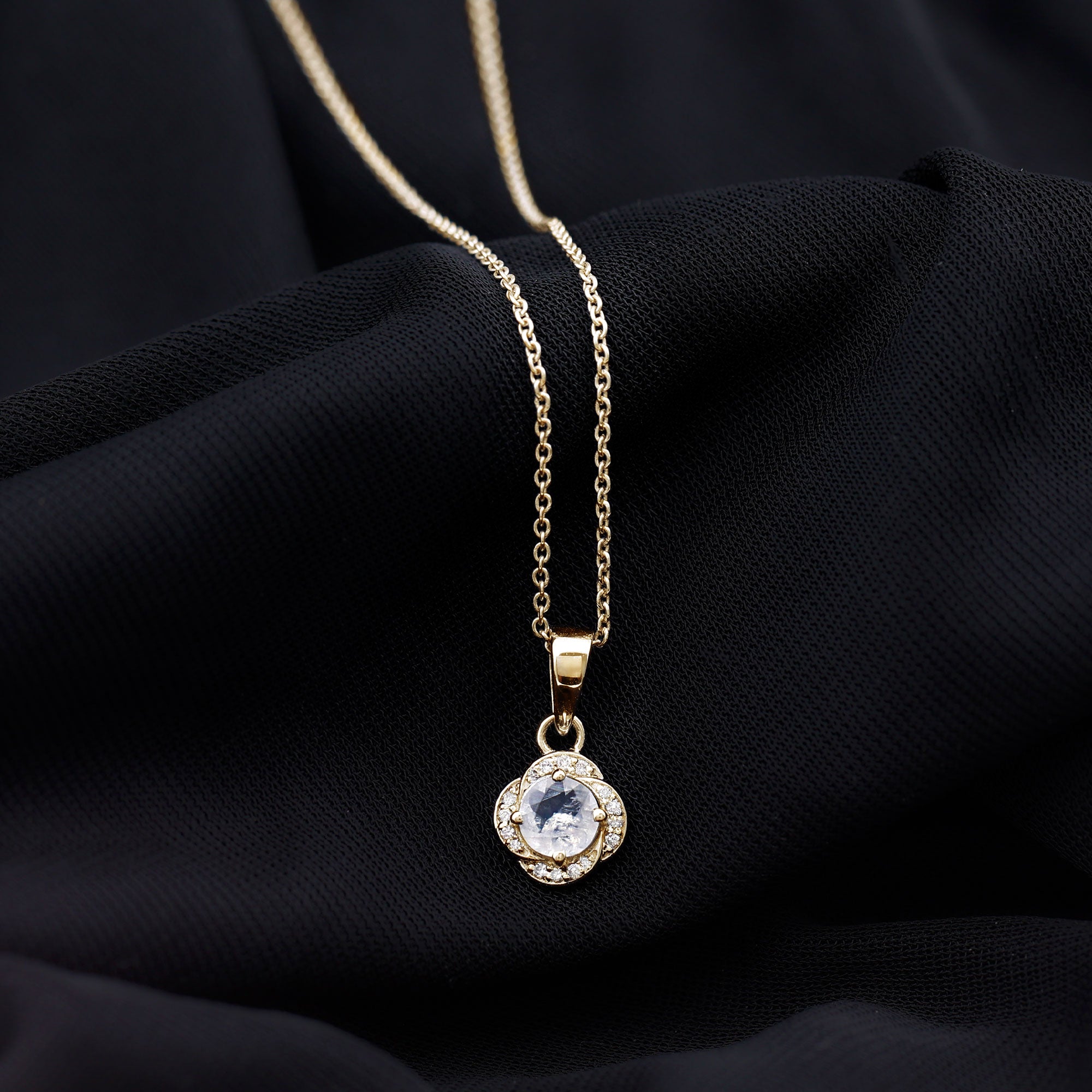 Moonstone Halo Necklaces: - These necklaces involve circling a center moonstone with other small glistening diamonds or other gemstones, enhancing the brilliance of the focal stone without increasing its carat weight. This halo design will forever make a fashion statement. Their versatility is enough to align with any attire, whether it's casual or occasional, it'll look classy.
