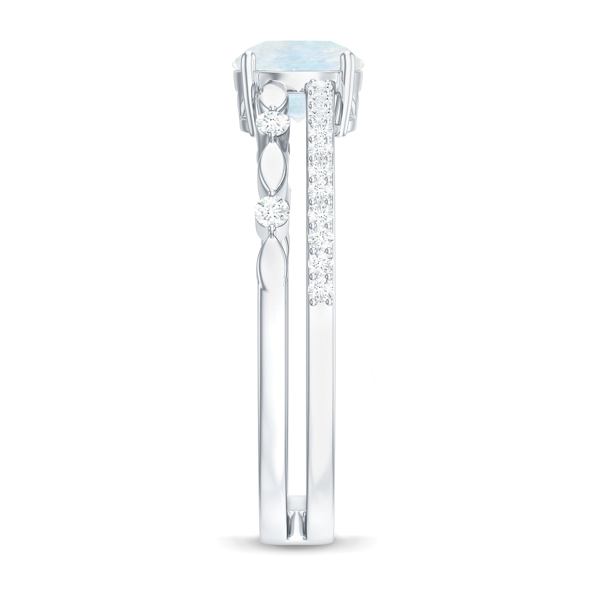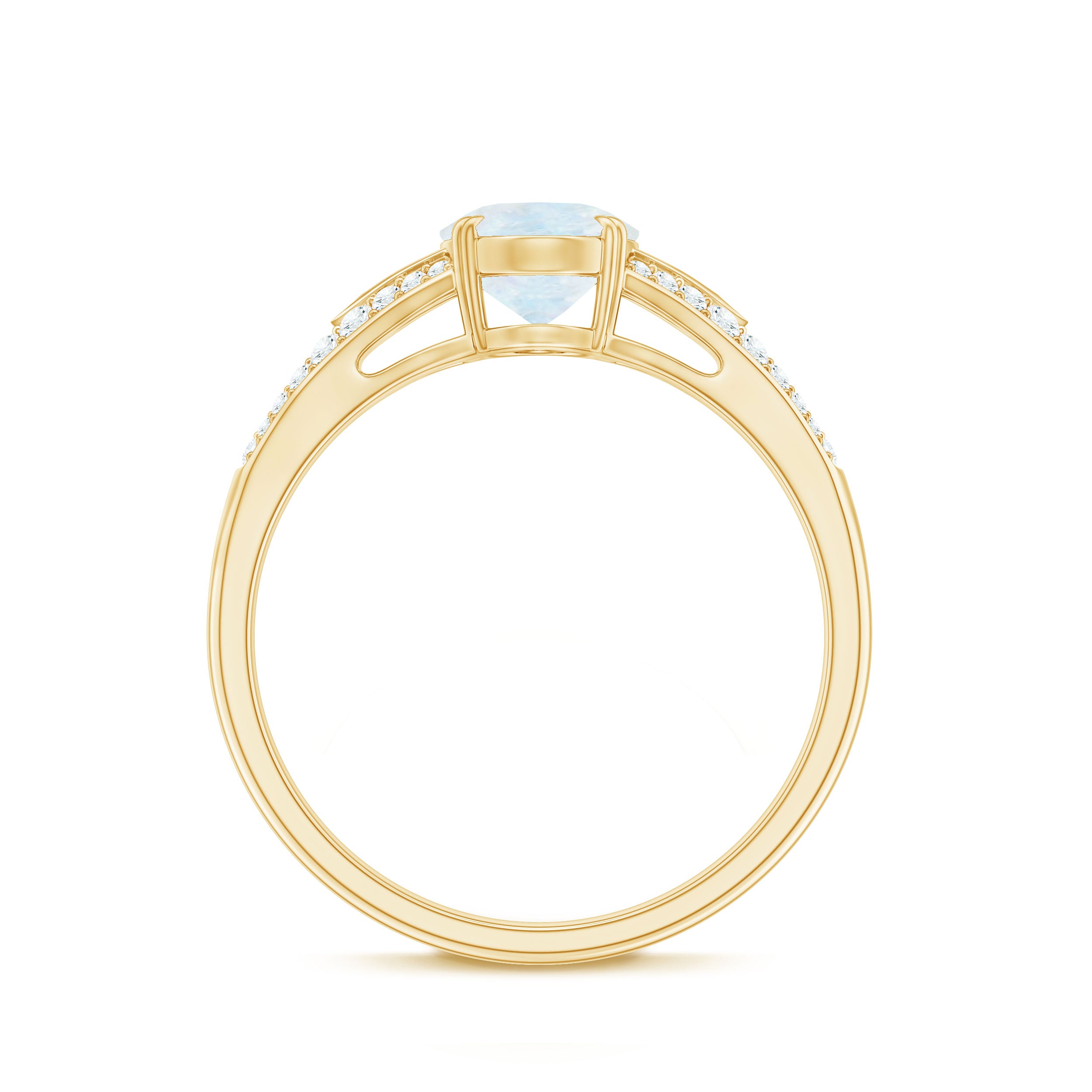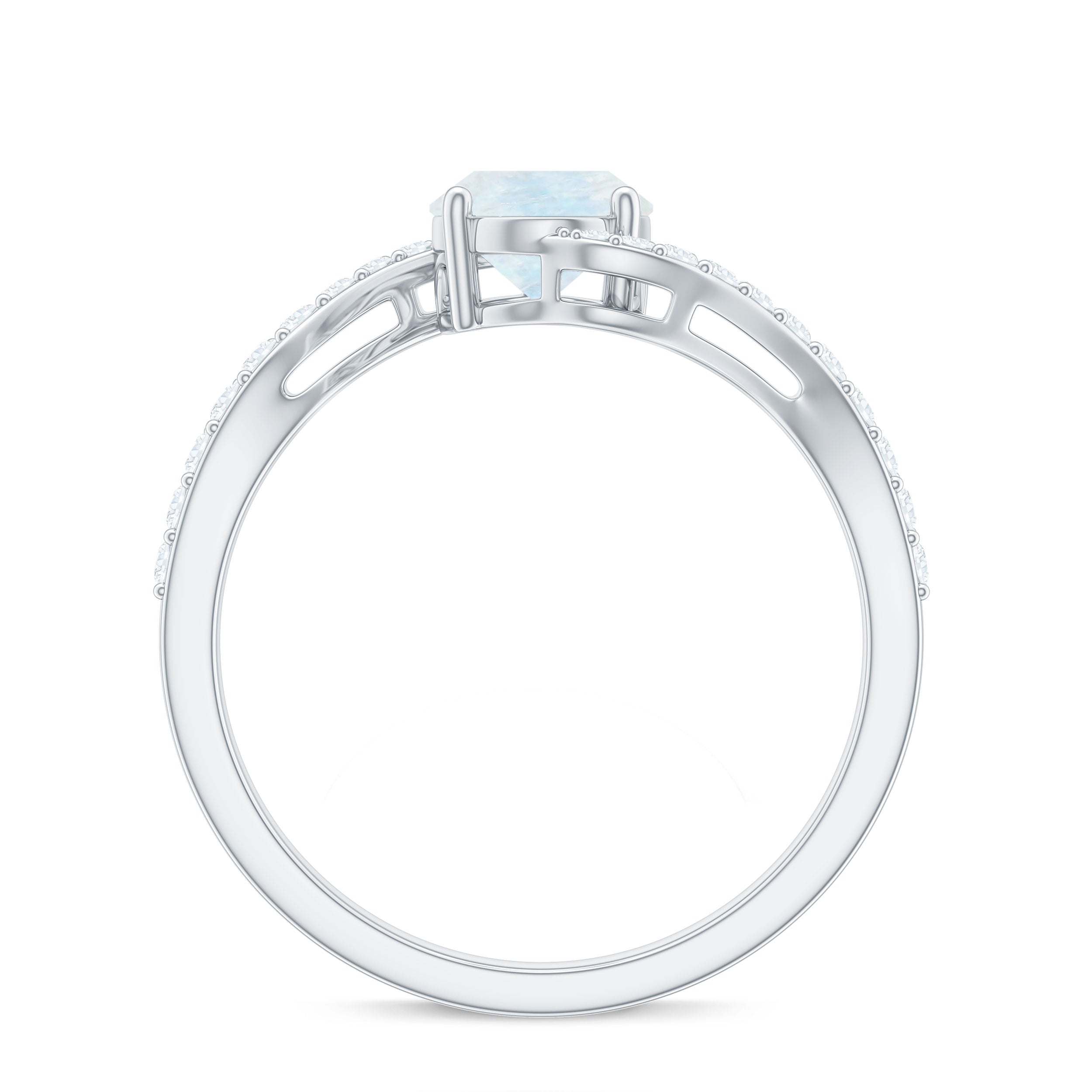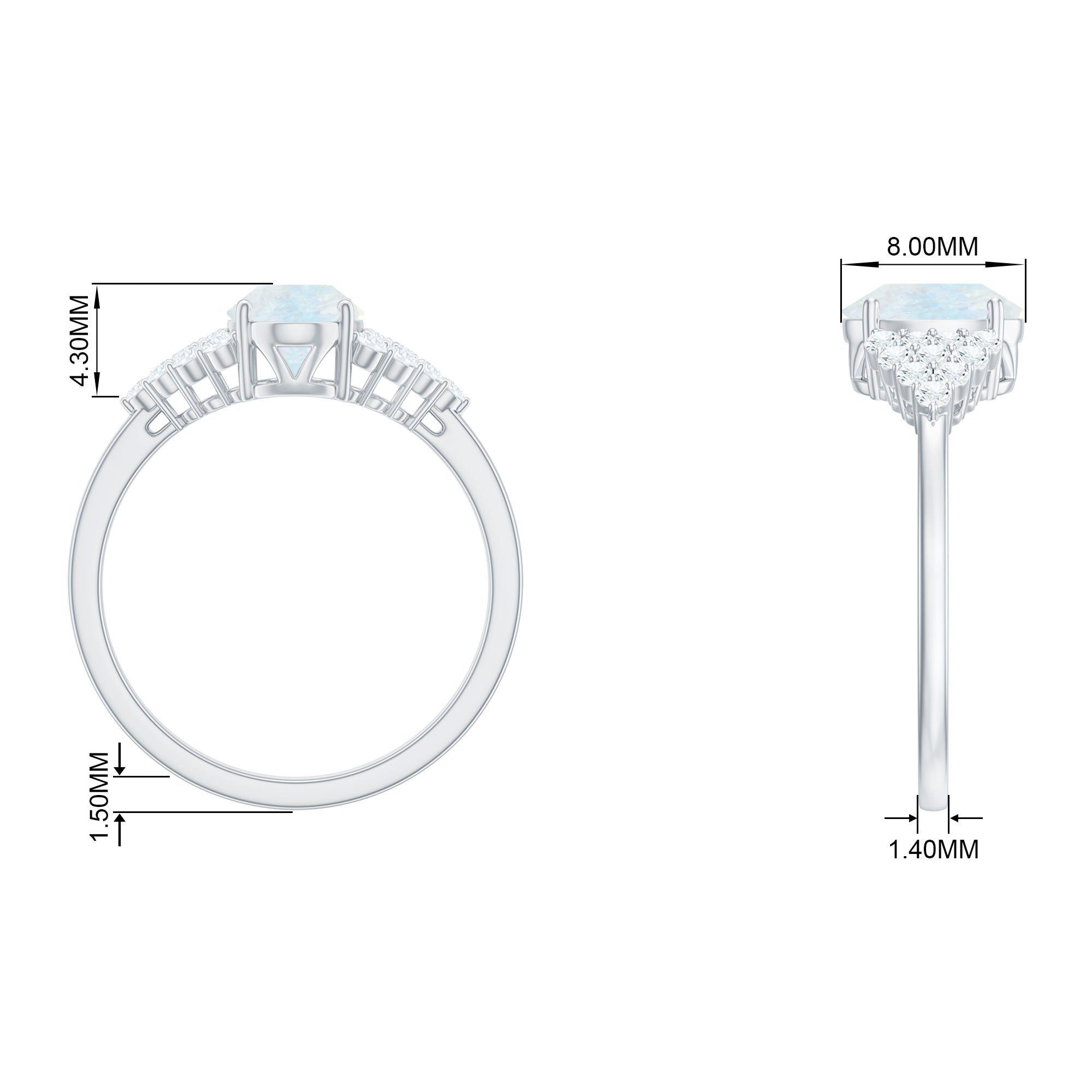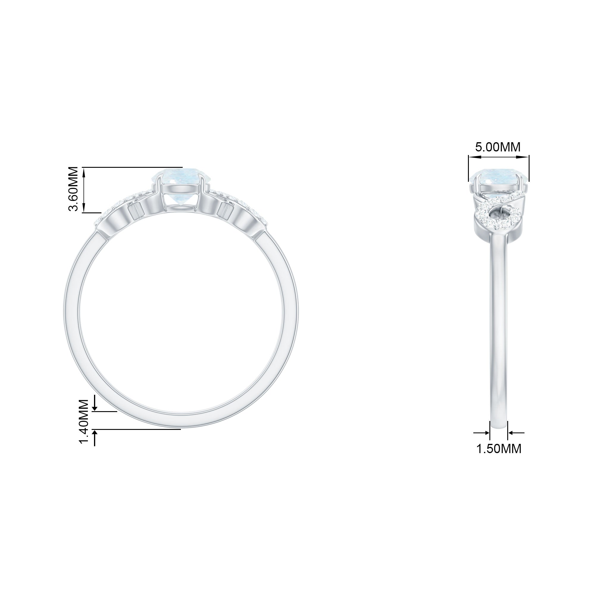 Easily the most sophisticated and Simple Moonstone Ring in the entire collection, a Solitaire Style features the Centerpiece of a Moonstone (of any shape) that stands out on its own. The Moonstone Solitaire here is at least 6 MM in size, which also makes it a one-of-a-kind choice of Moonstone Engagement Ring. It is fashioned in a versatile number of shapes that cater to just as many senses of style. While a Round or Oval Moonstone Ring exudes a conventional touch, a ring adorned with a princess, marquise, or pear-cut Moonstone is more on the fancier side of the spectrum. On the other hand, if you’re on the hunt for an Antique Moonstone Ring, go for the one fashioned in Emerald, Cushion, or Asscher cut Center stone.