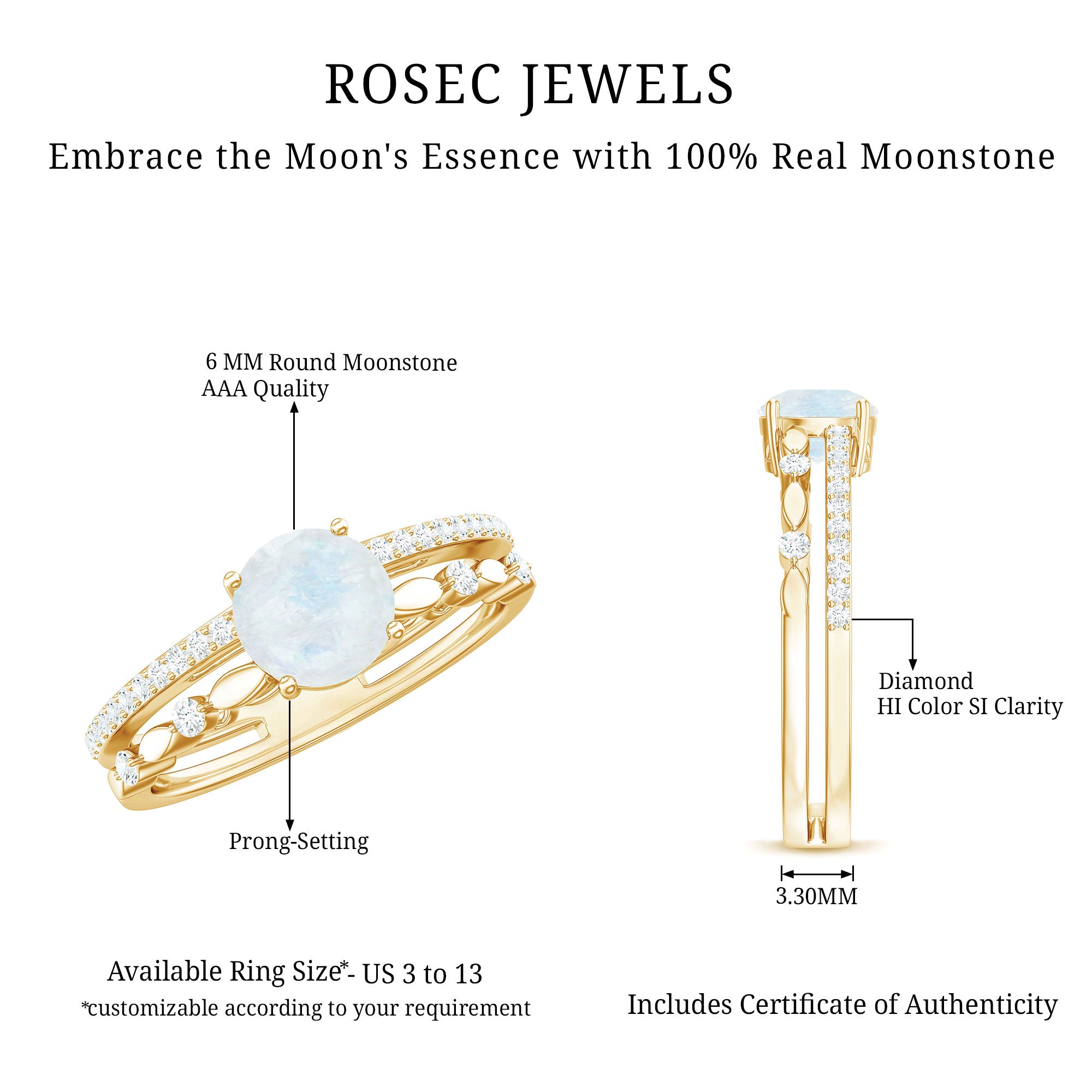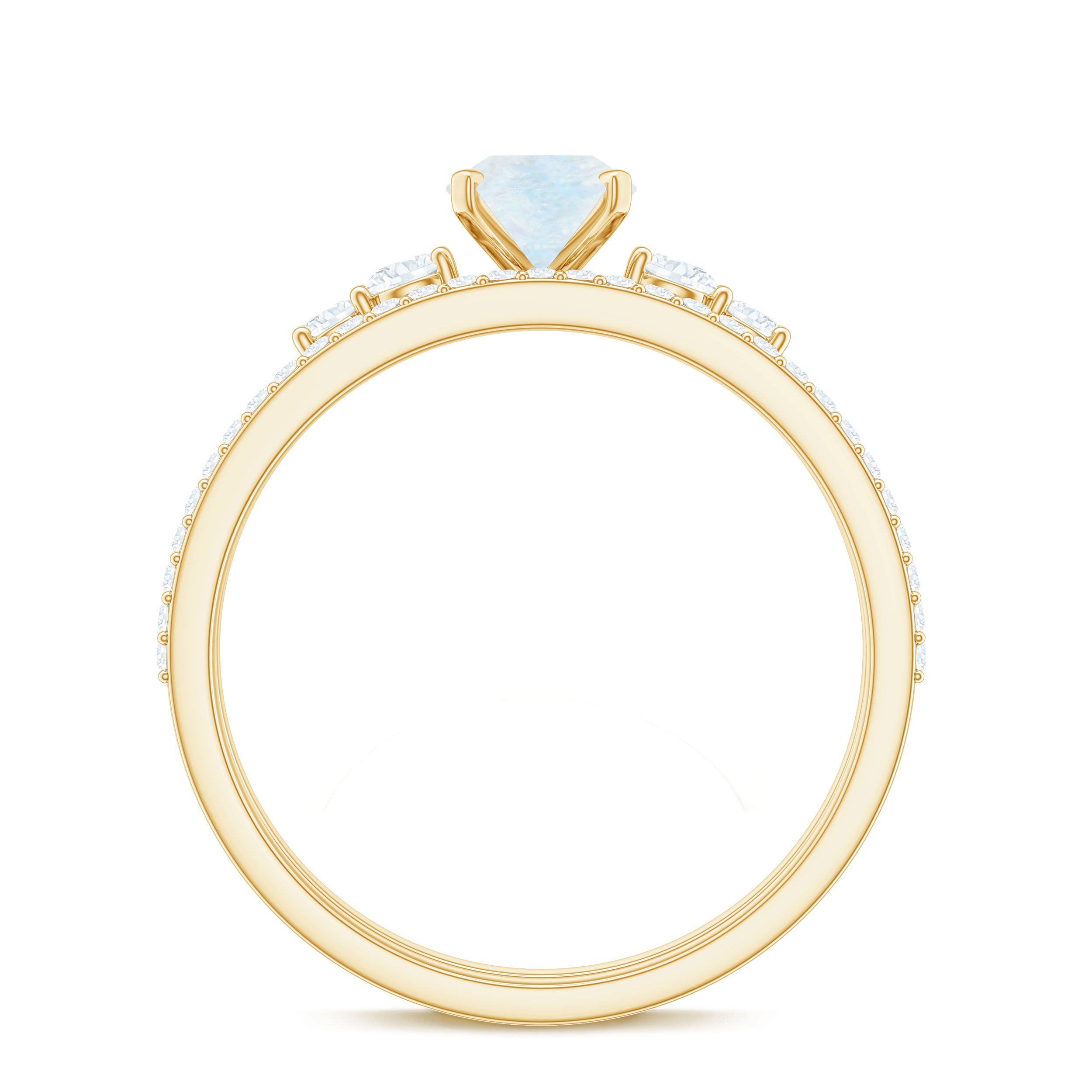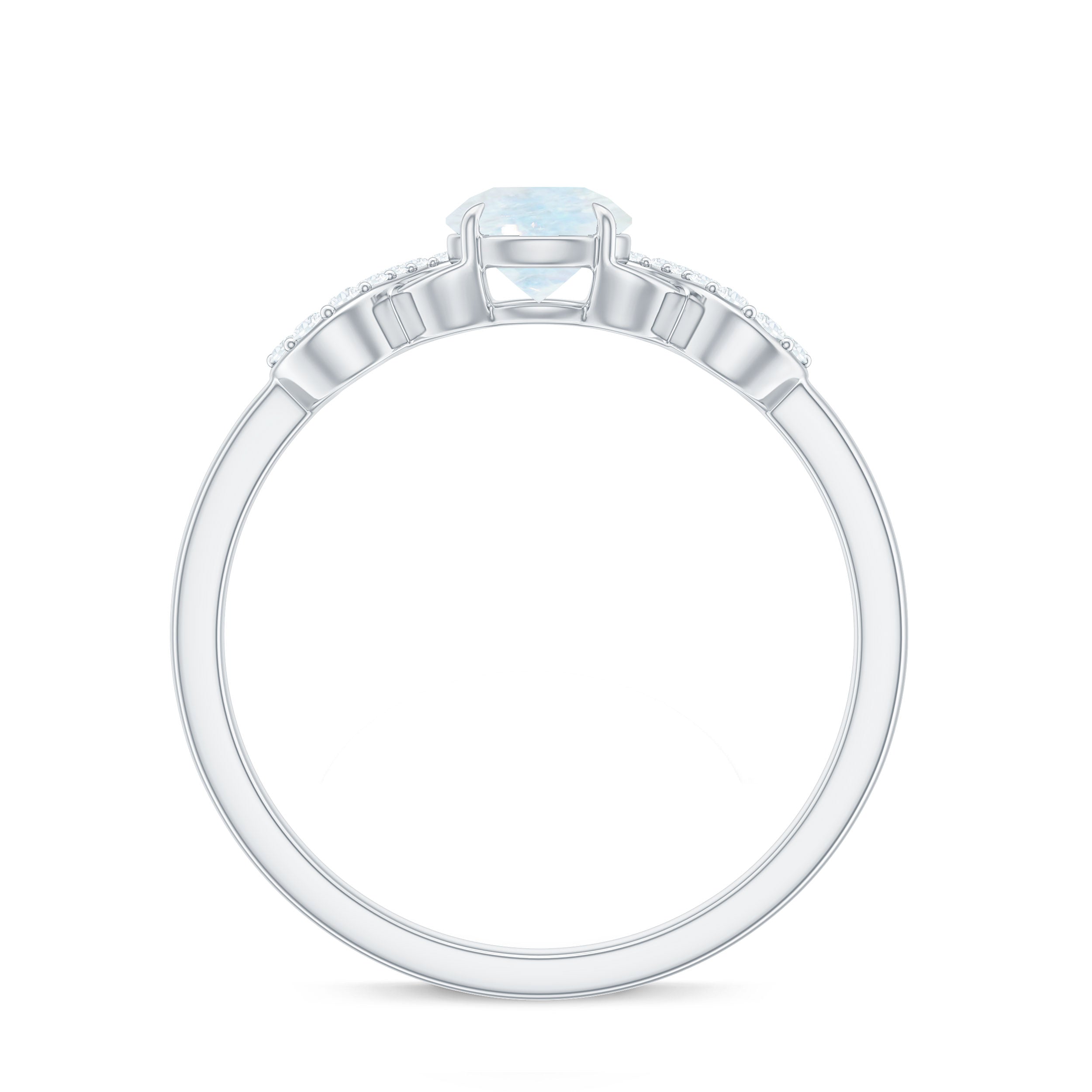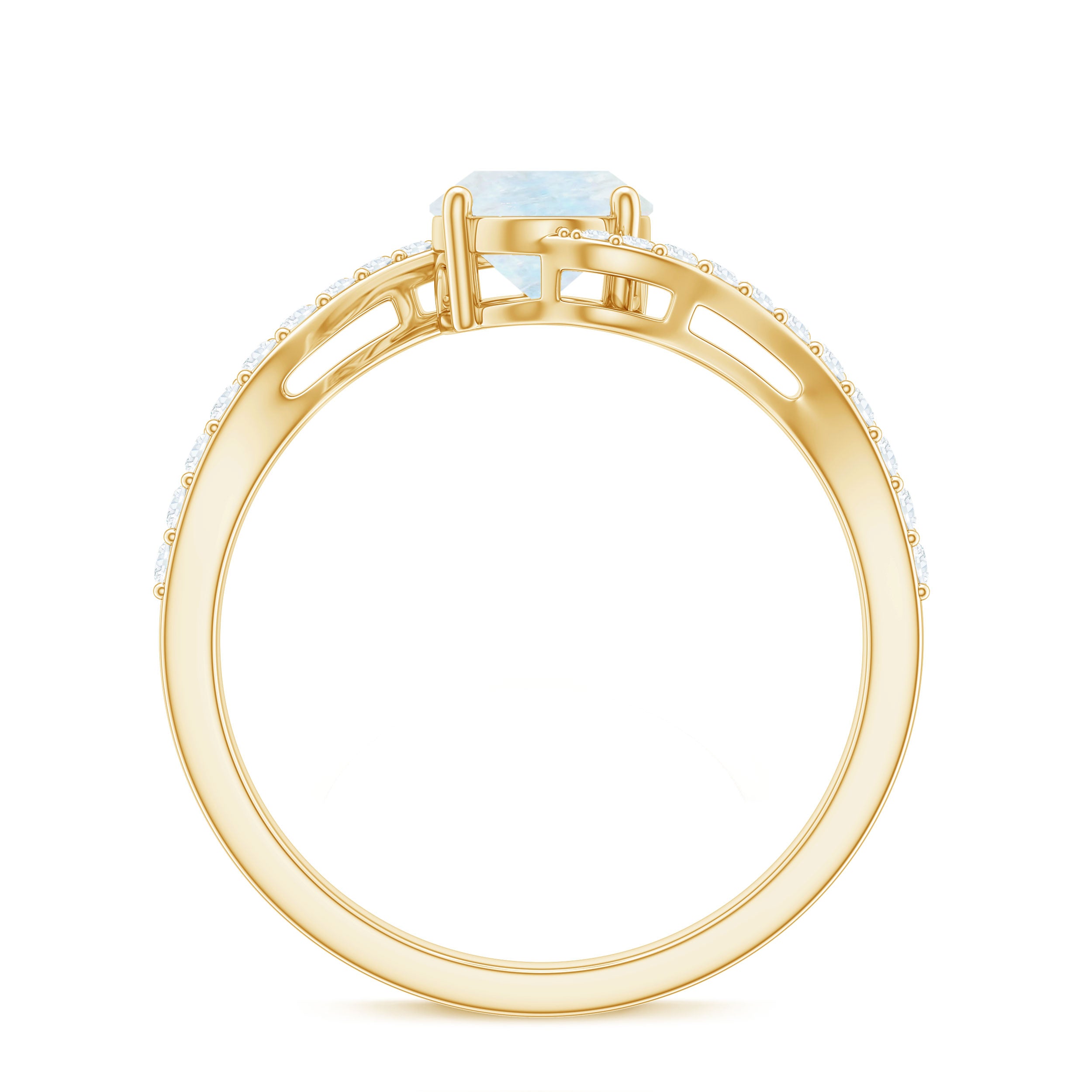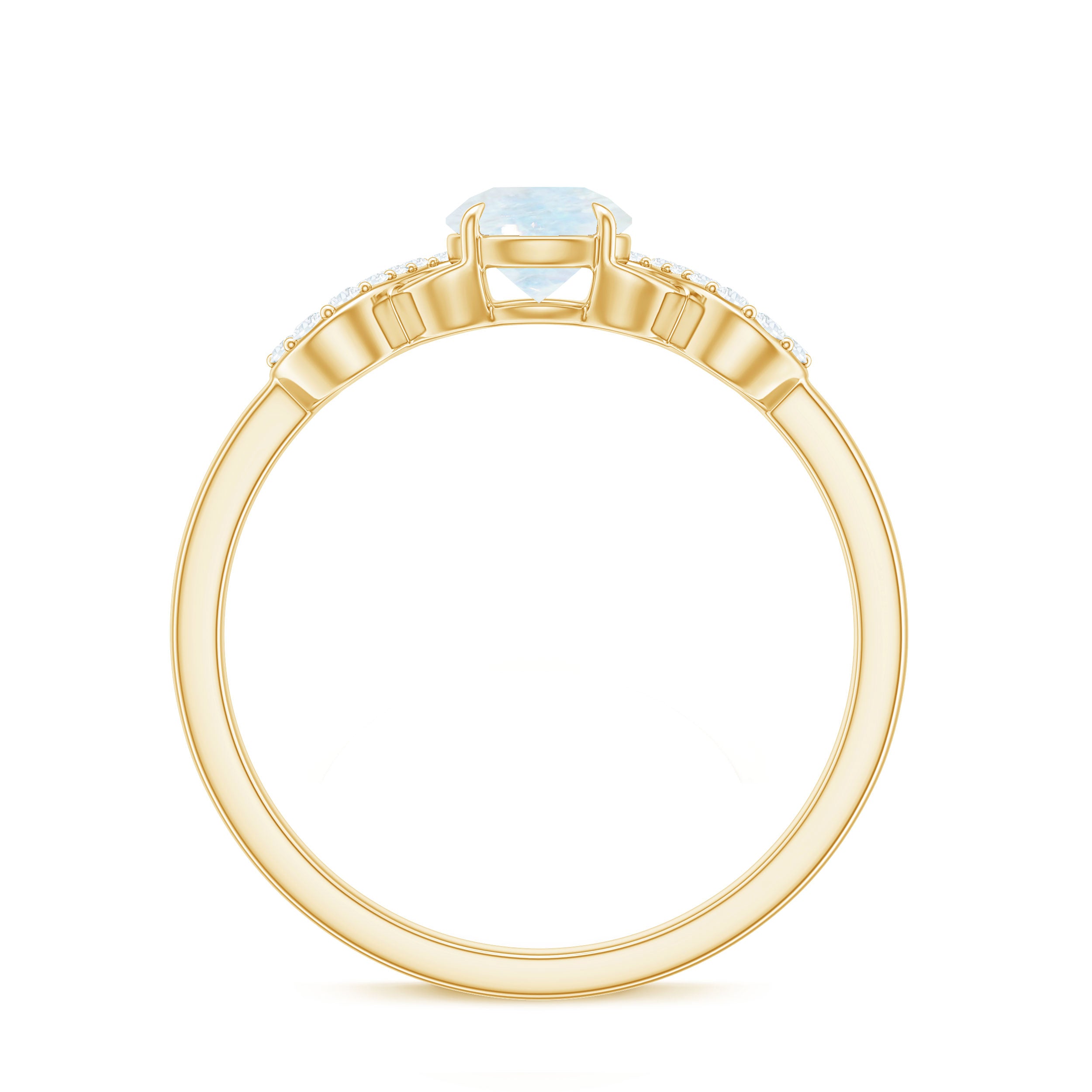 Easily the most sophisticated and Simple Moonstone Ring in the entire collection, a Solitaire Style features the Centerpiece of a Moonstone (of any shape) that stands out on its own. The Moonstone Solitaire here is at least 6 MM in size, which also makes it a one-of-a-kind choice of Moonstone Engagement Ring. It is fashioned in a versatile number of shapes that cater to just as many senses of style. While a Round or Oval Moonstone Ring exudes a conventional touch, a ring adorned with a princess, marquise, or pear-cut Moonstone is more on the fancier side of the spectrum. On the other hand, if you’re on the hunt for an Antique Moonstone Ring, go for the one fashioned in Emerald, Cushion, or Asscher cut Center stone.